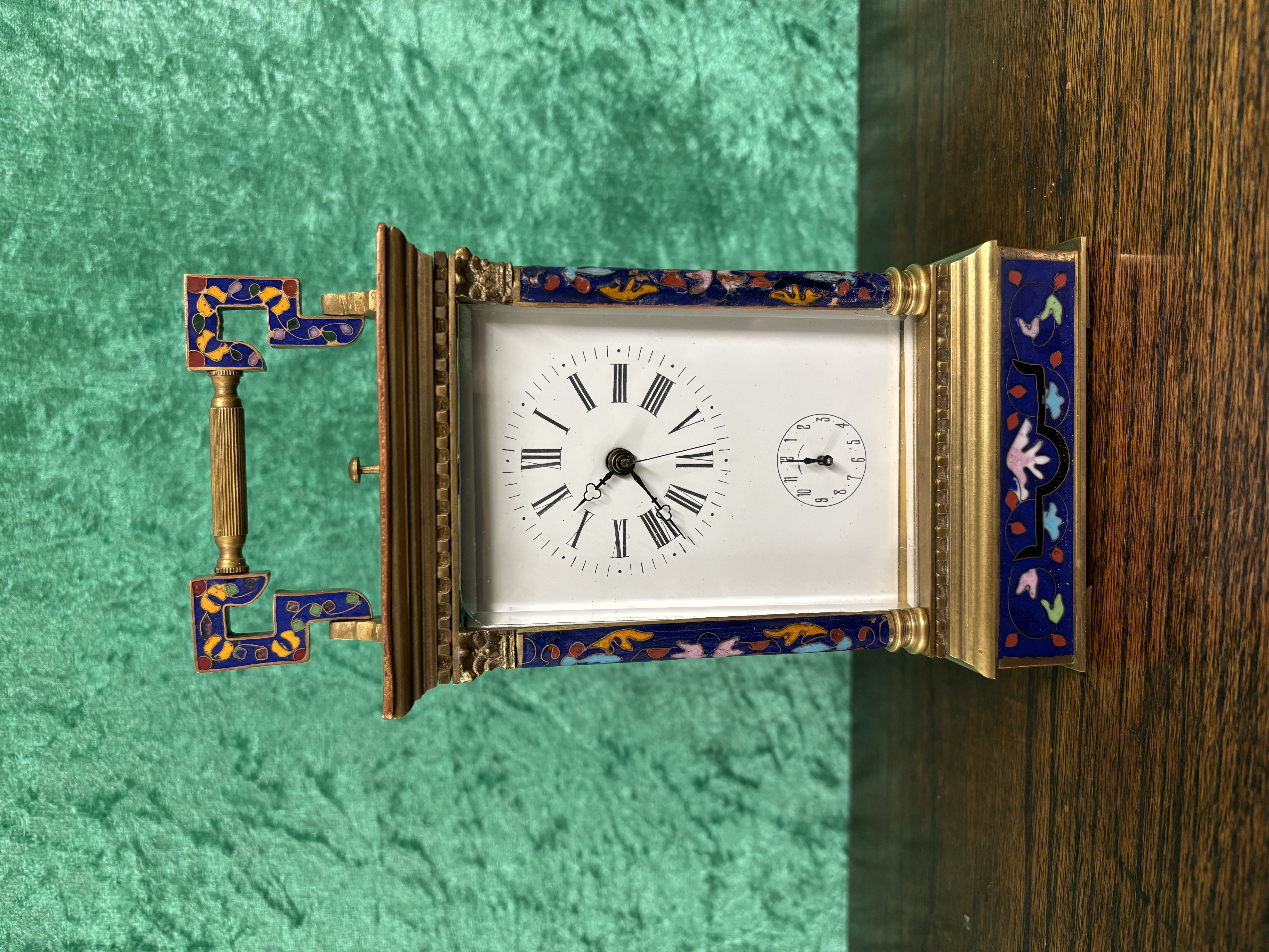 A Cloisonne carriage clock with two keys, seen running