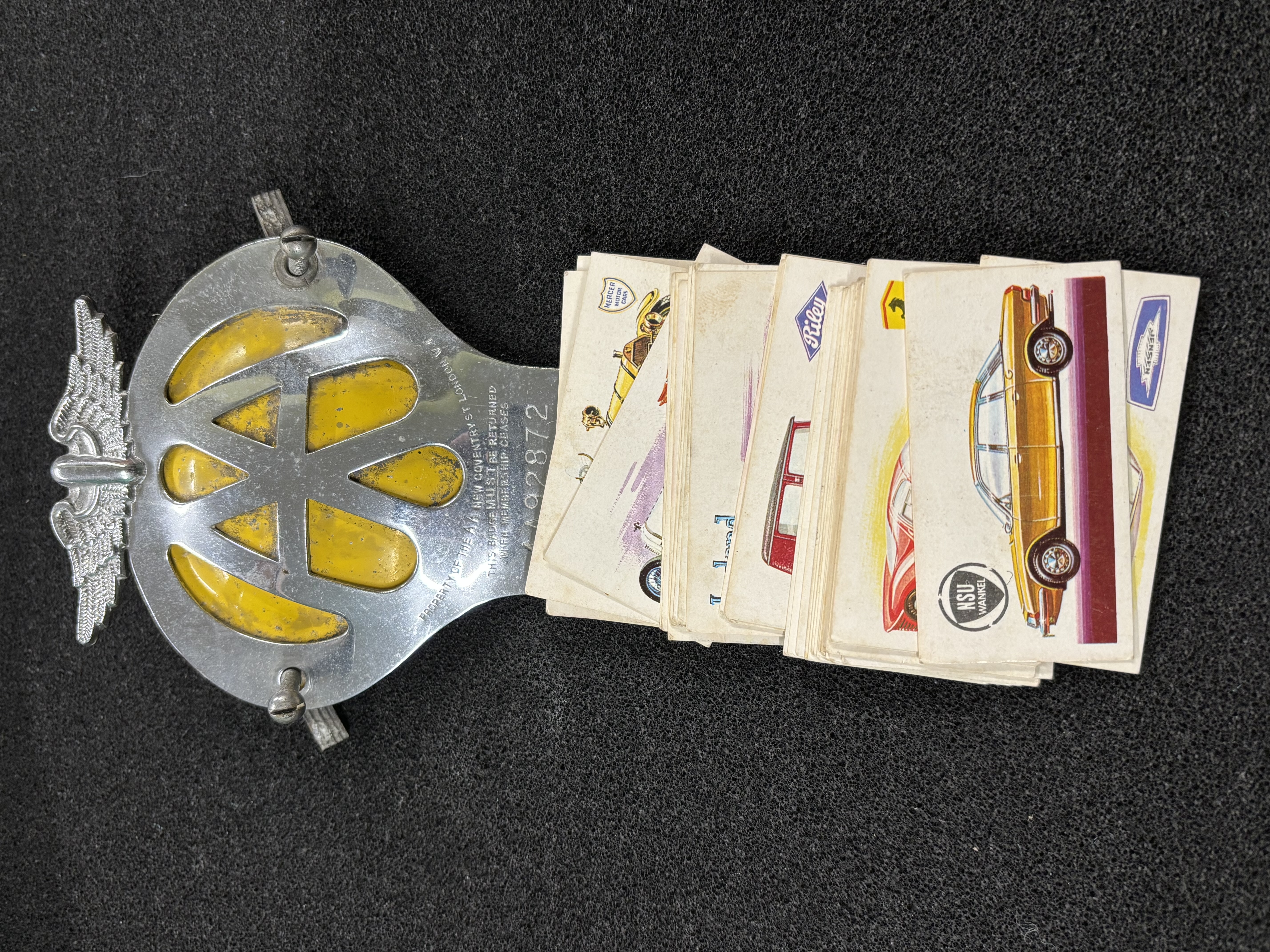 An original AA car badge in Chrome with yellow enamel, number 4A92872 together with a Brooke Bond tea card set “The History of the Motor Car”