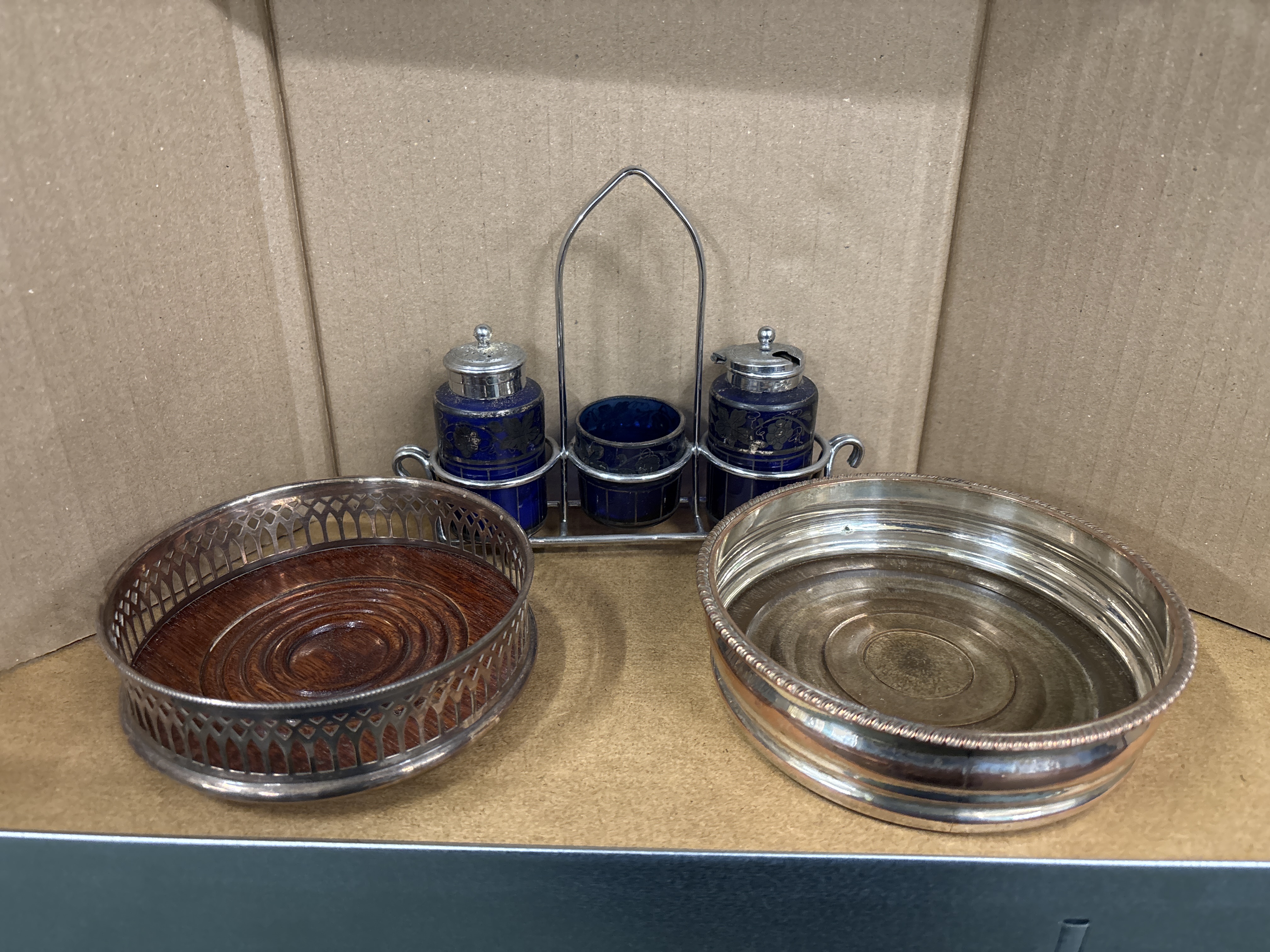 Two traditional plated bottle coasters and a chrome and blue glass cruet