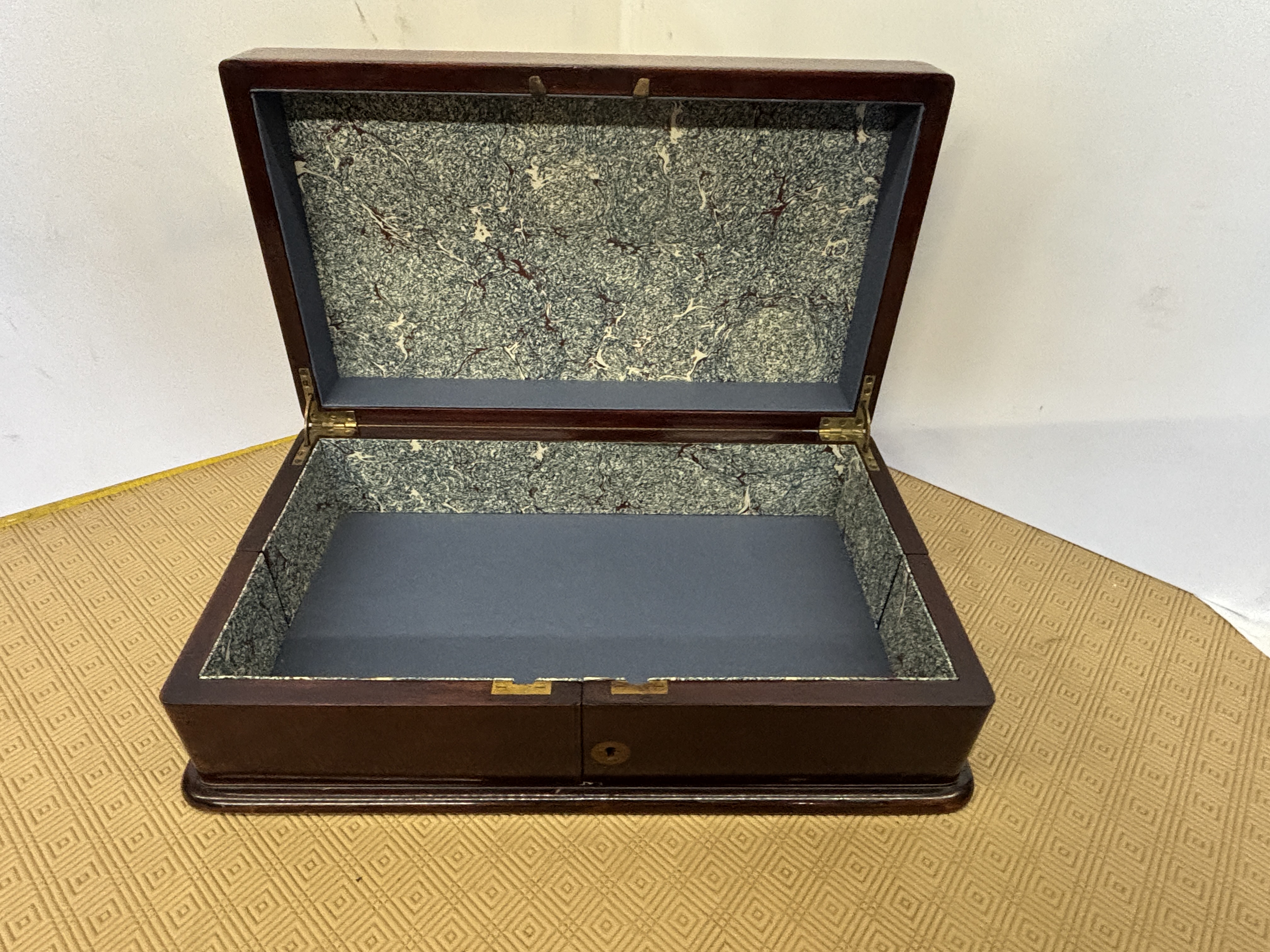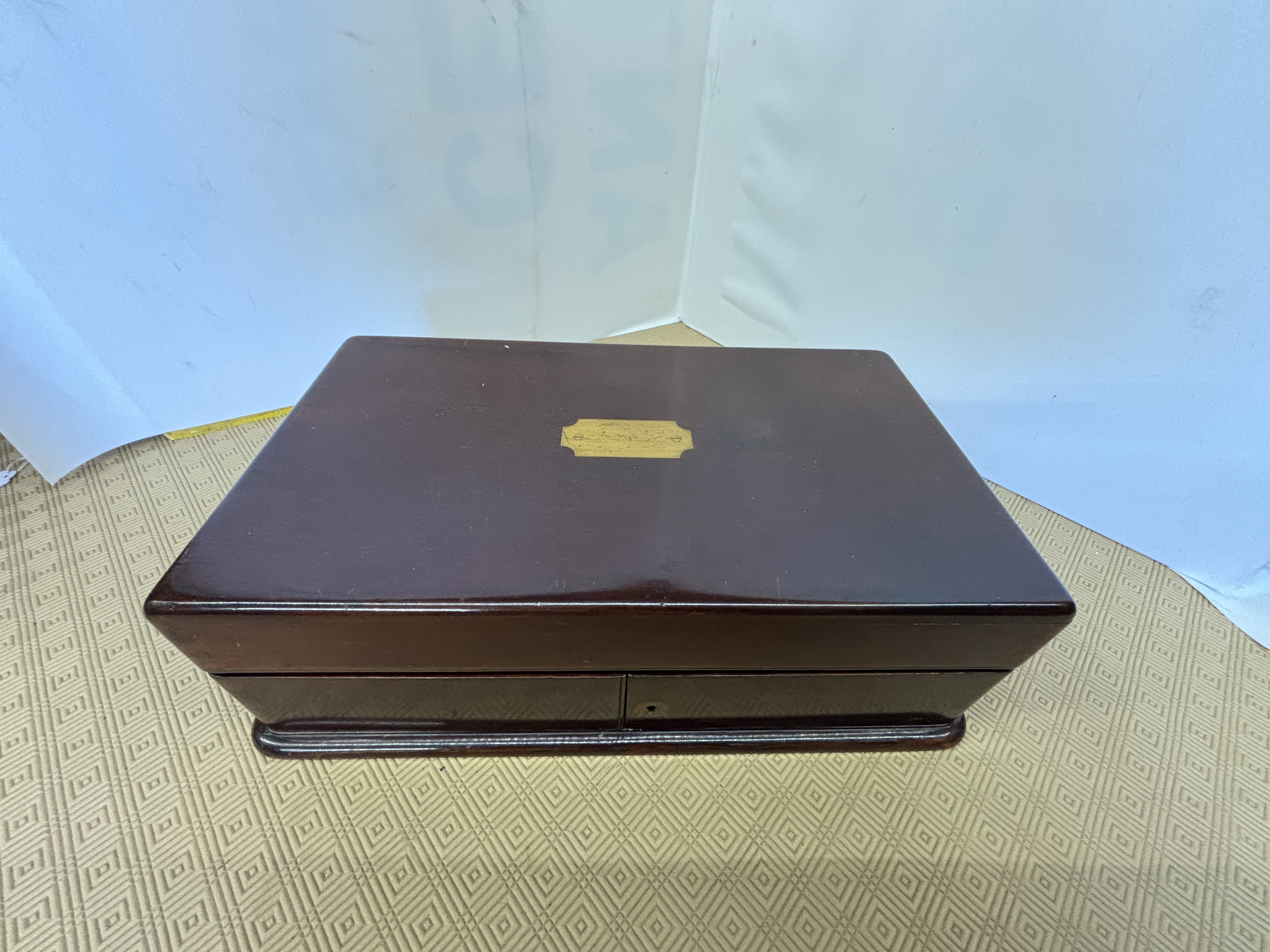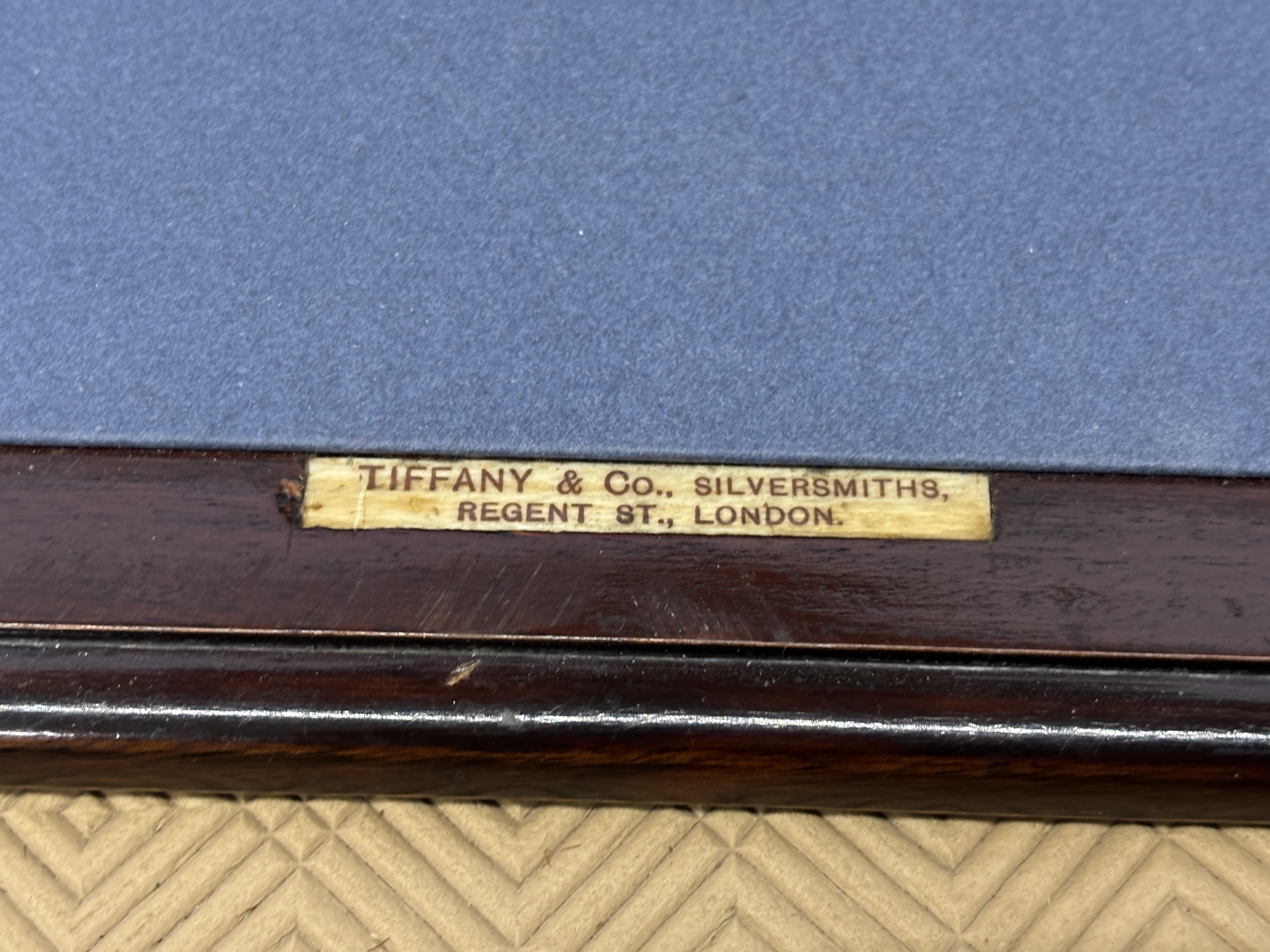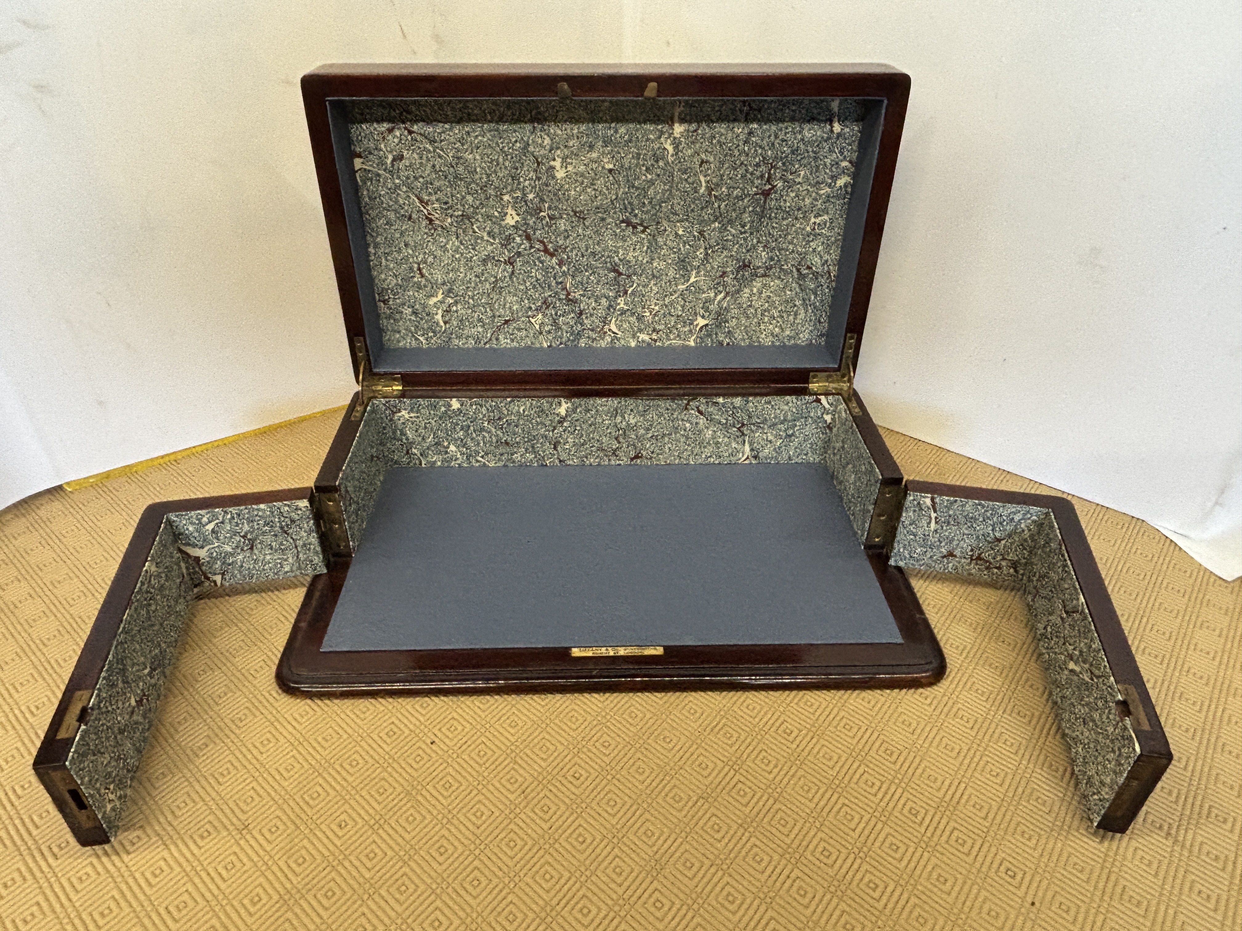 A large Mahogany box with Tiffany & co Regents Street London label measuring 26 x 33 x14