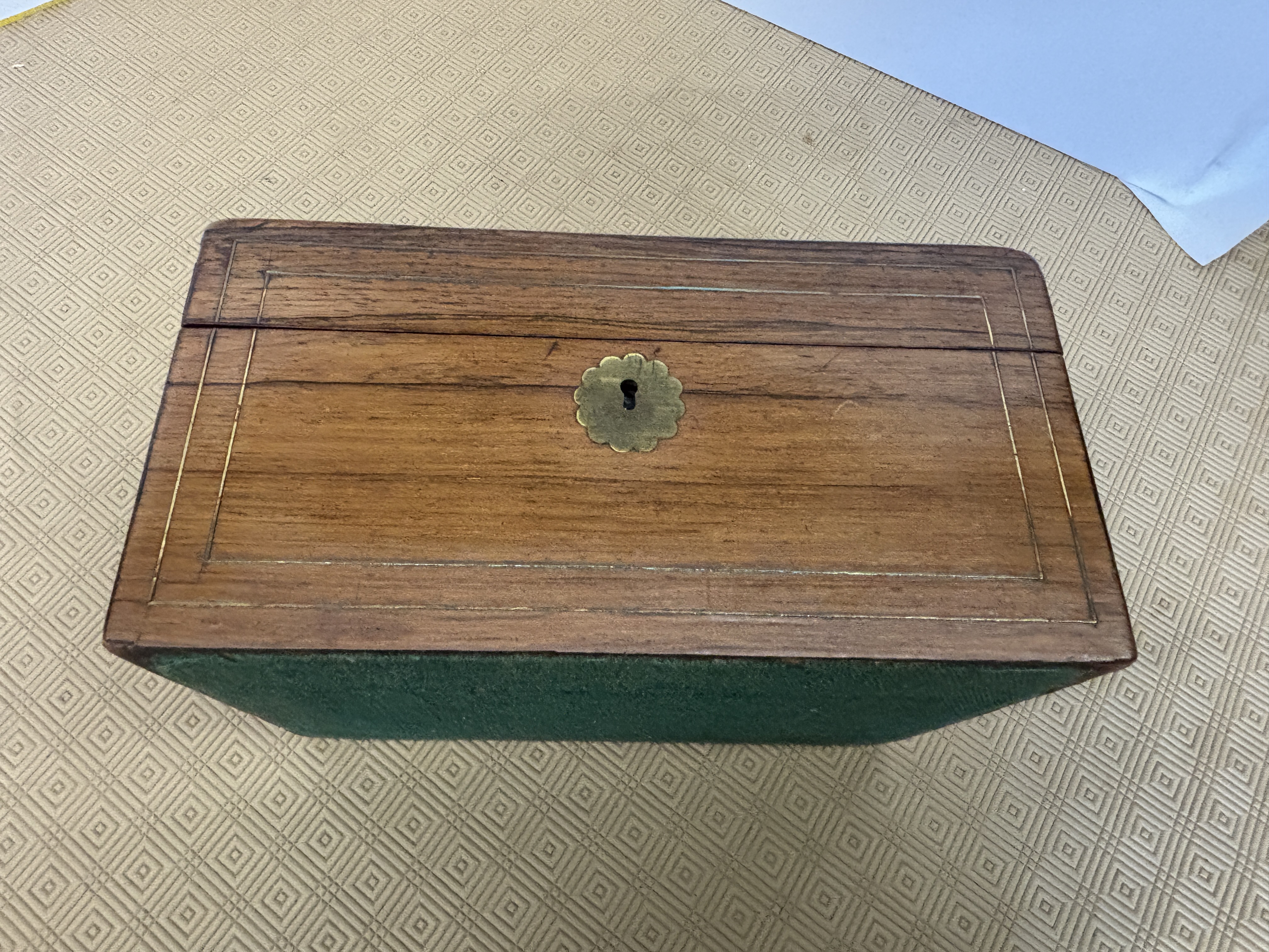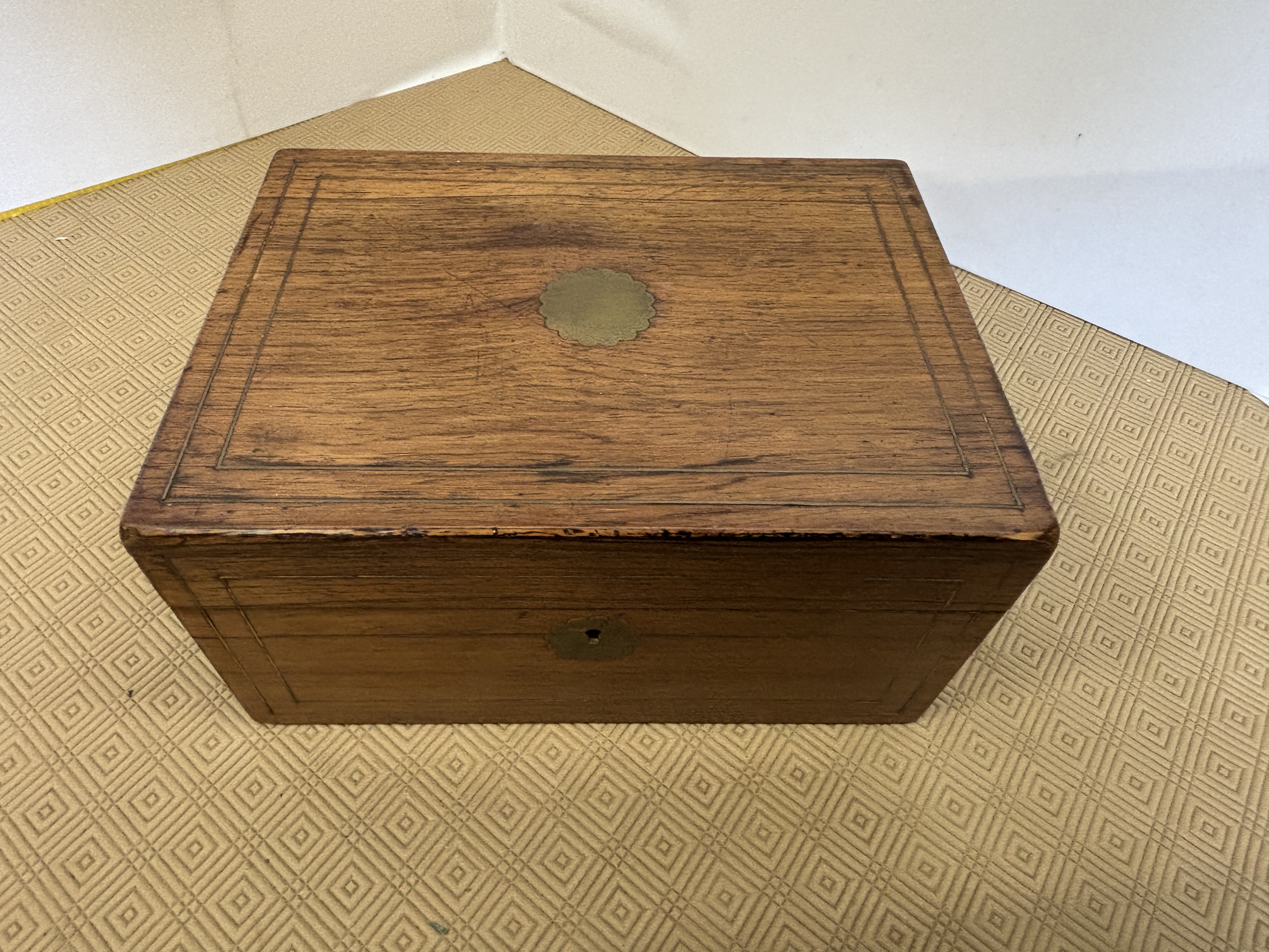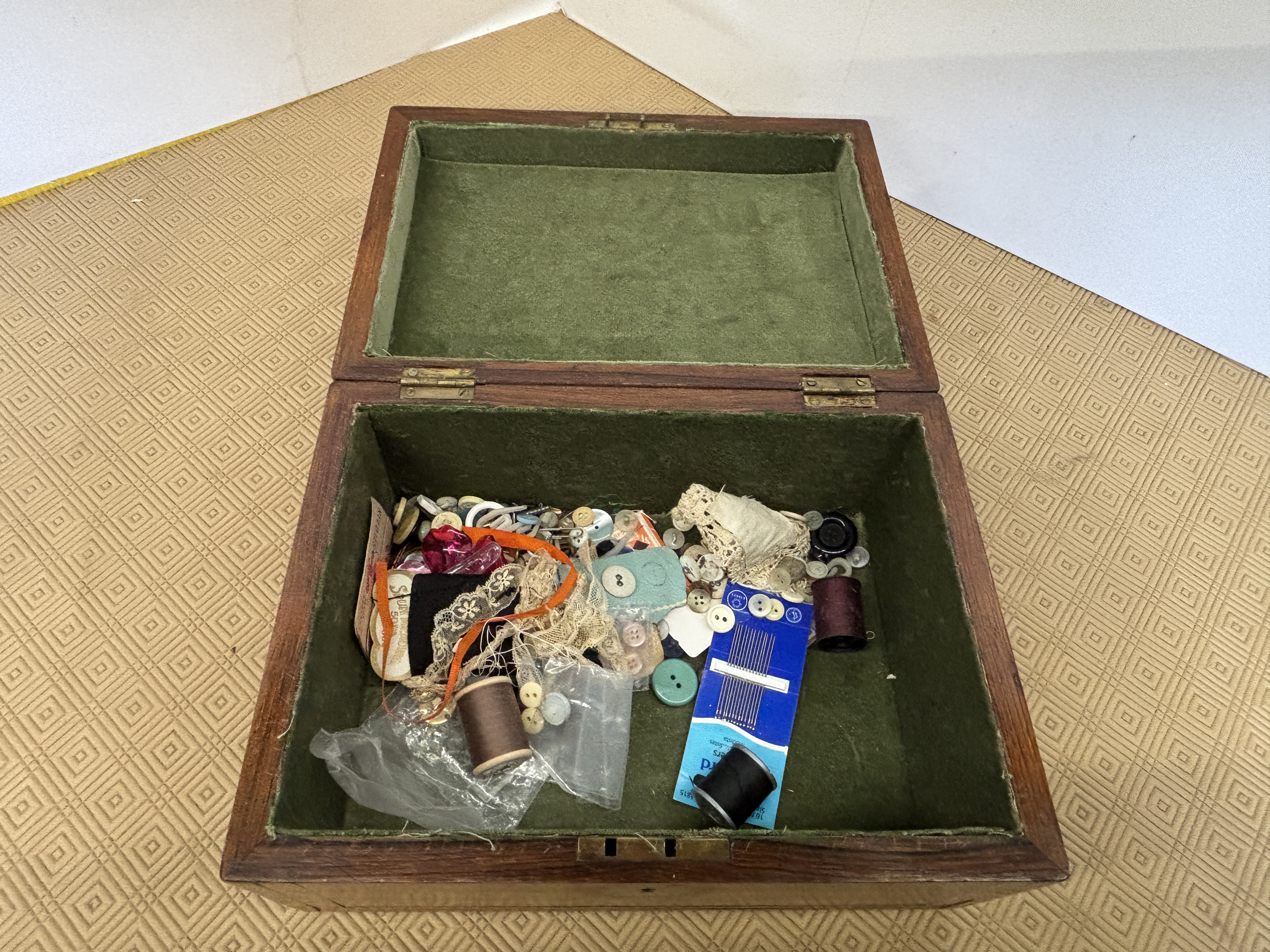 A wooden box containing a small assortment of sewing items measuring 28 x 20 x 14