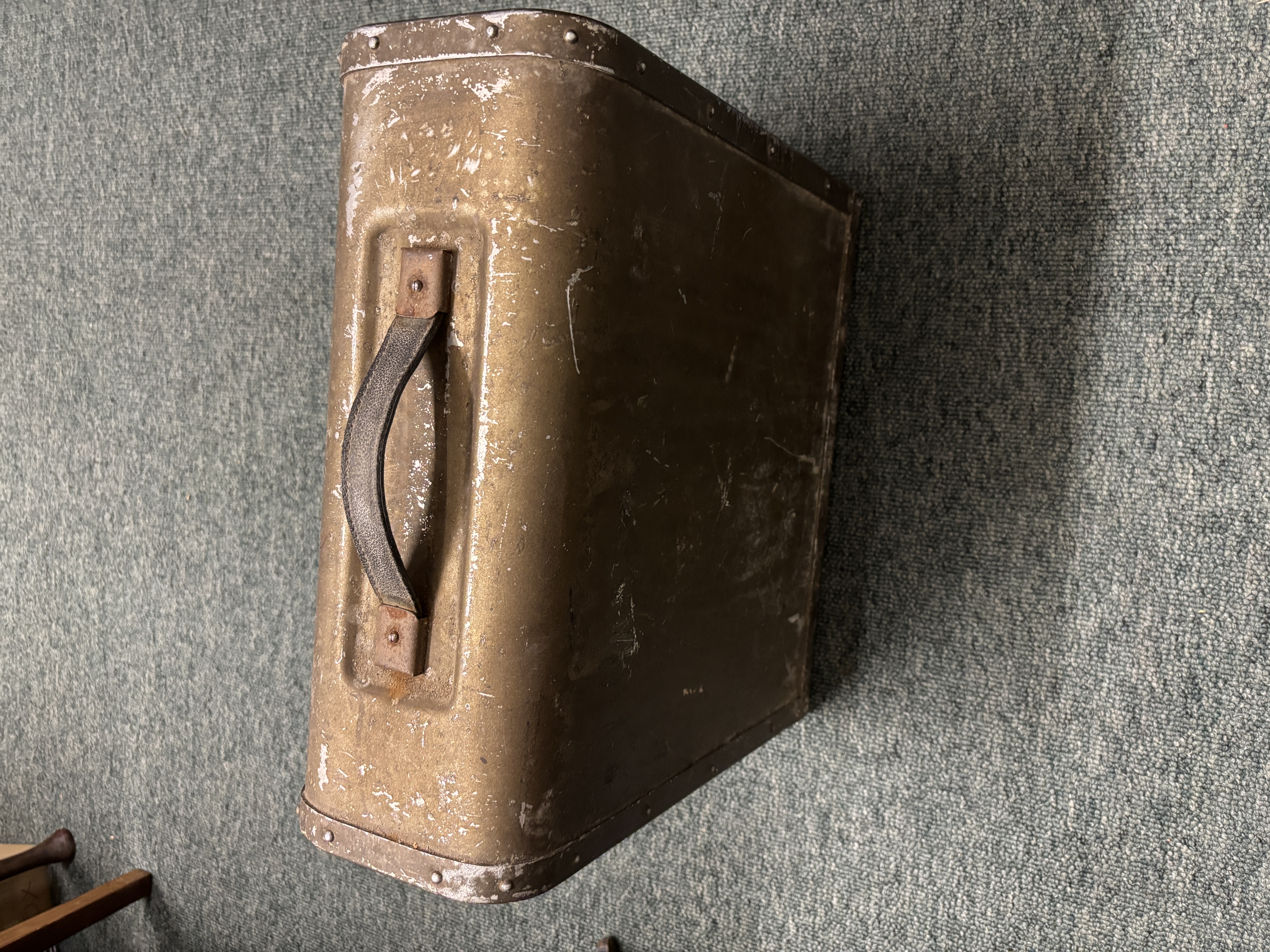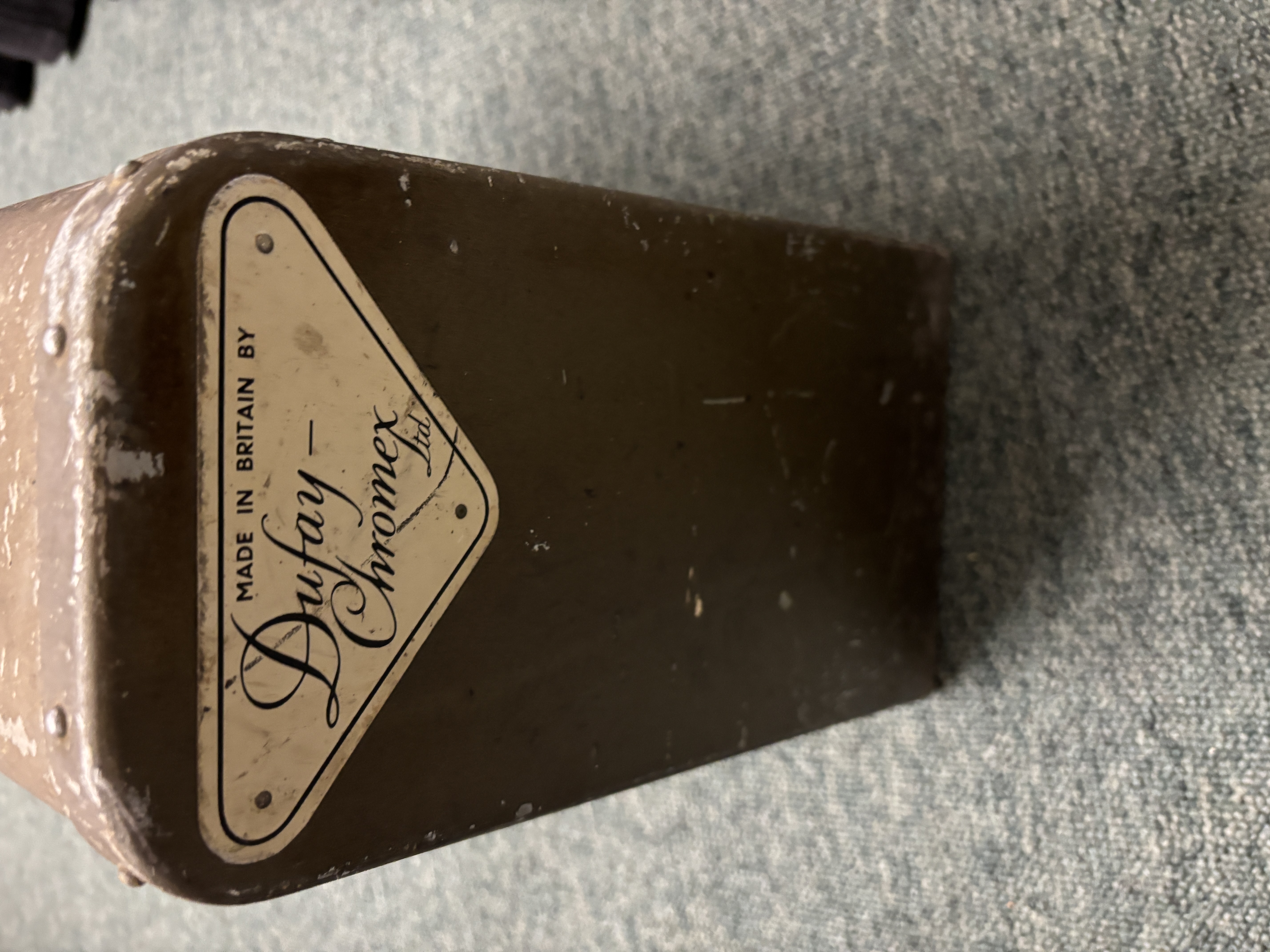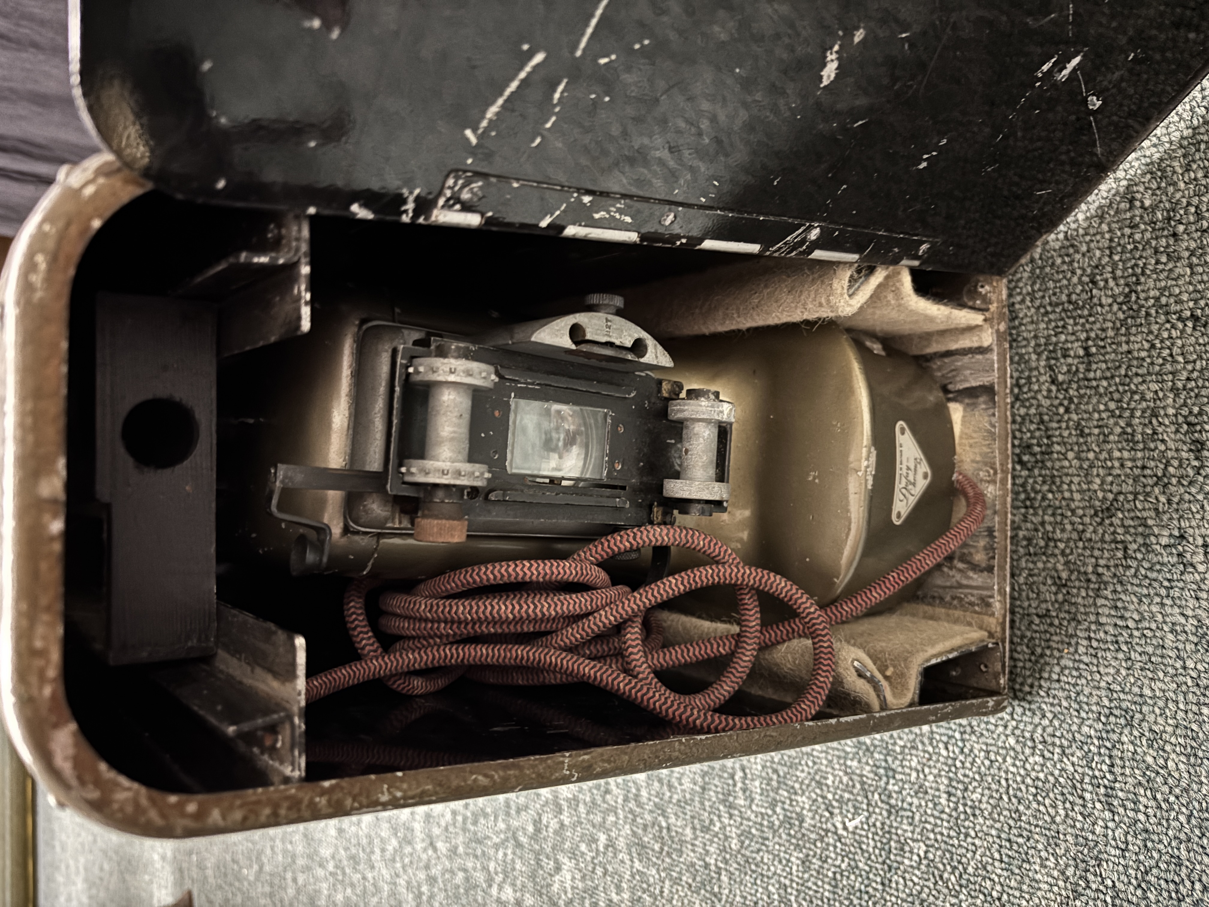 A vintage 1940’s Dufay Chromex 35mm film projector in metal case