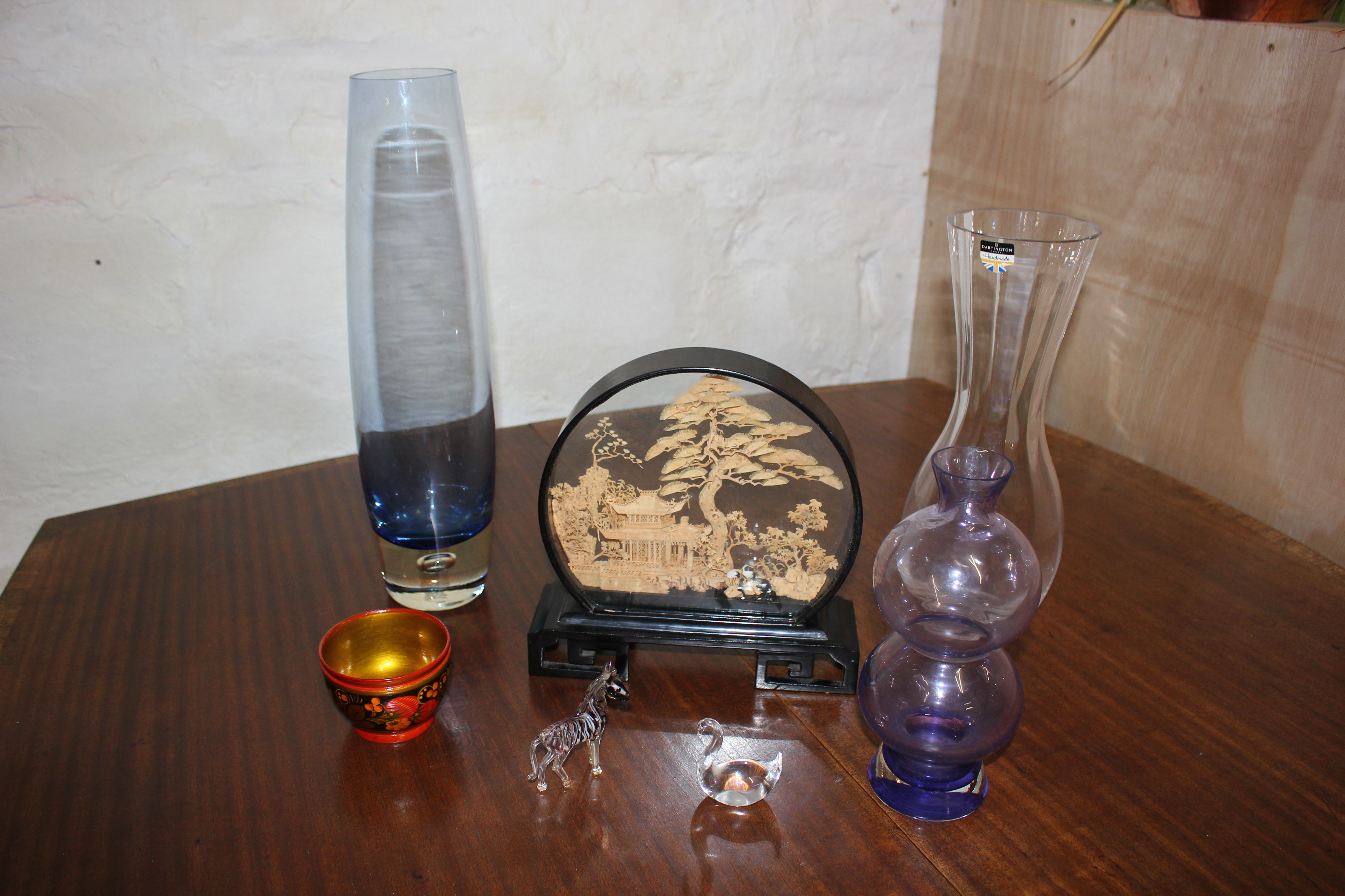 A Chinese diorama, two vases, glass animals, Dartington vase and Russian beaker