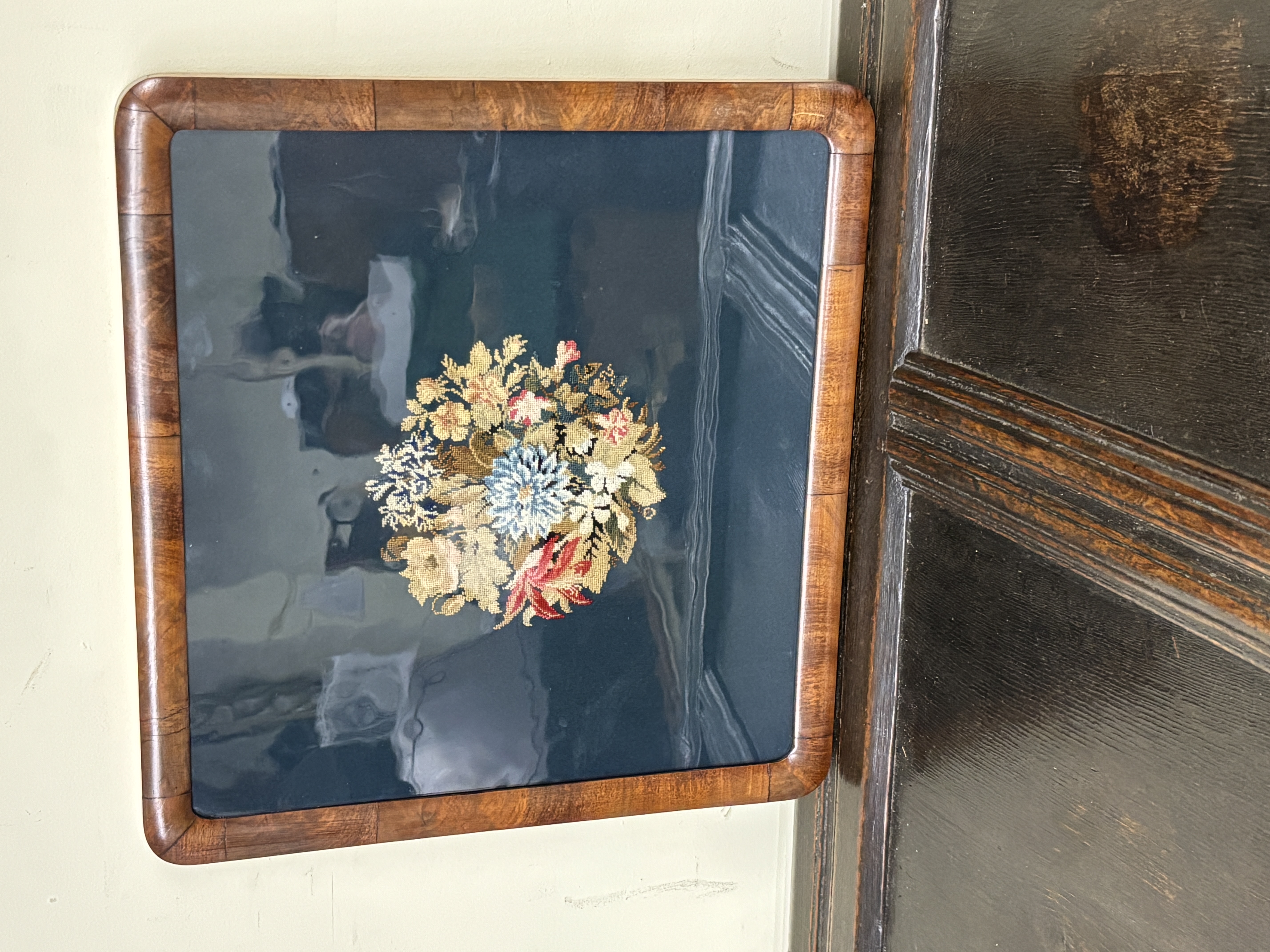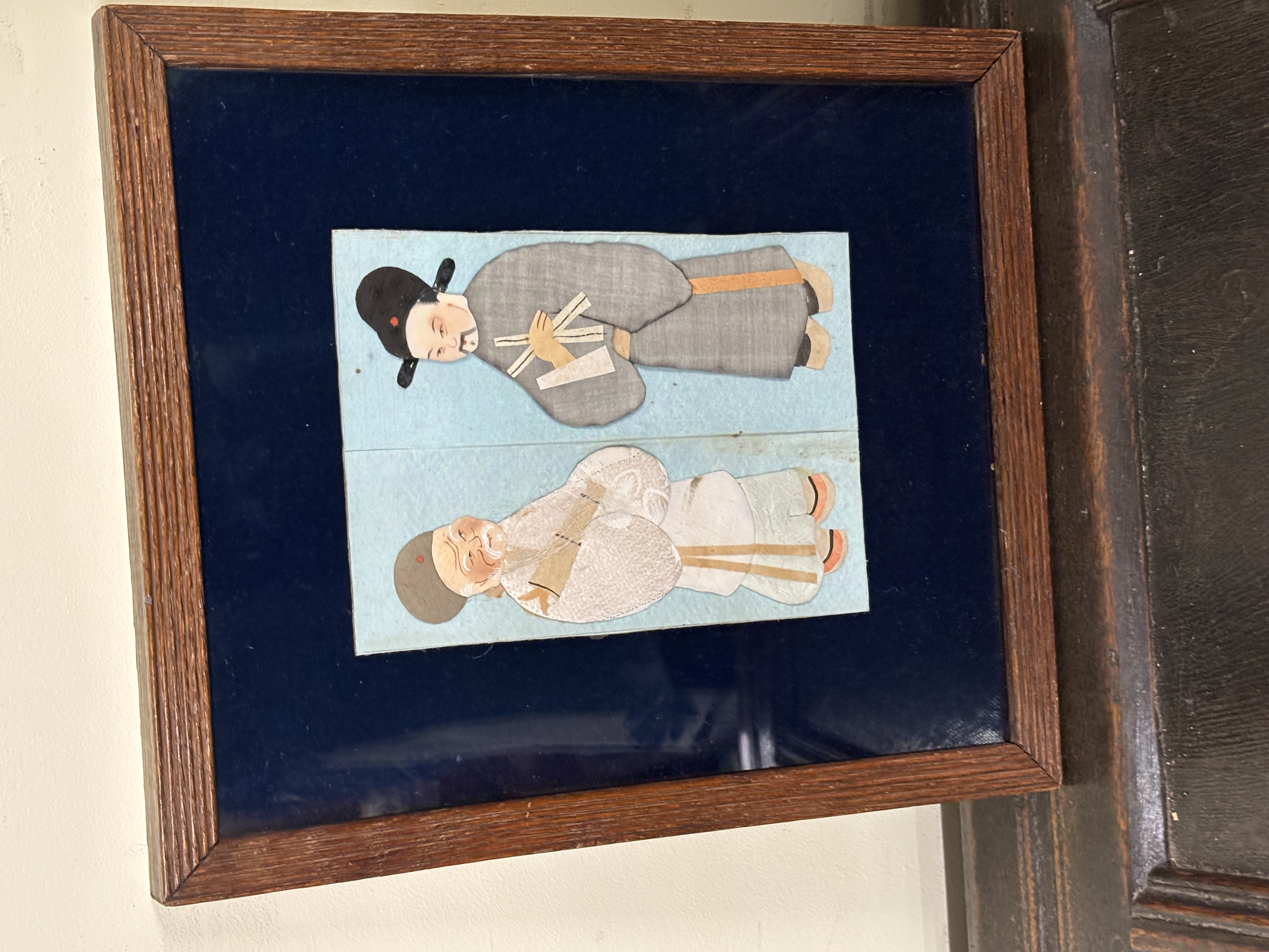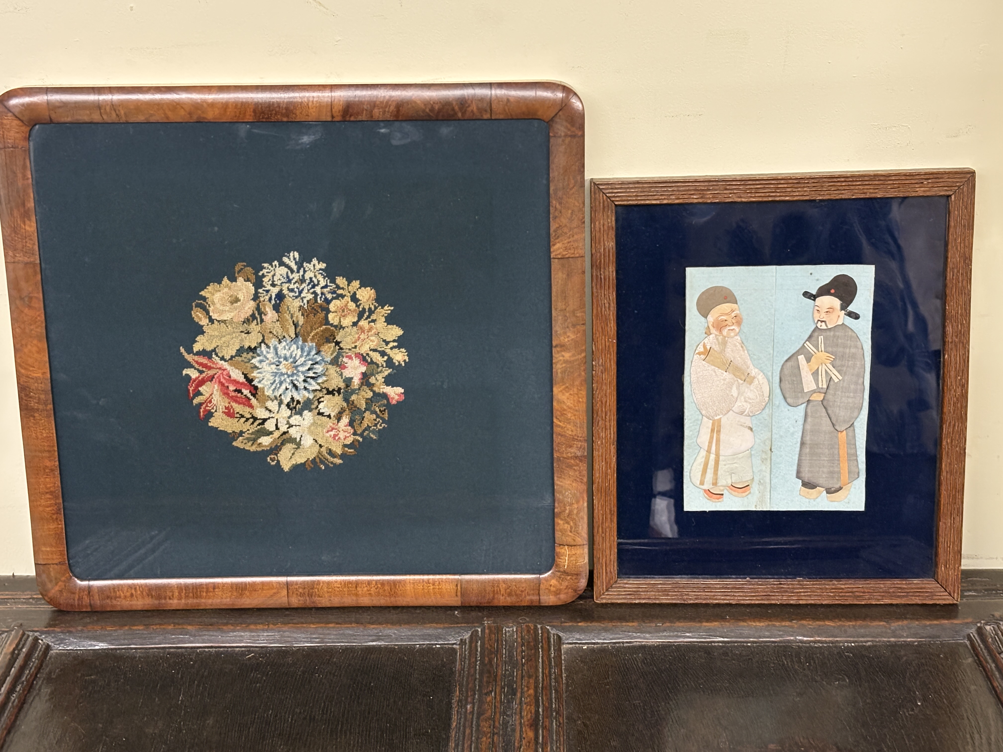 Two textile pictures , one depicting a floral arrangement (41x43cm) the other of two oriental gentlemen (33x28cm)