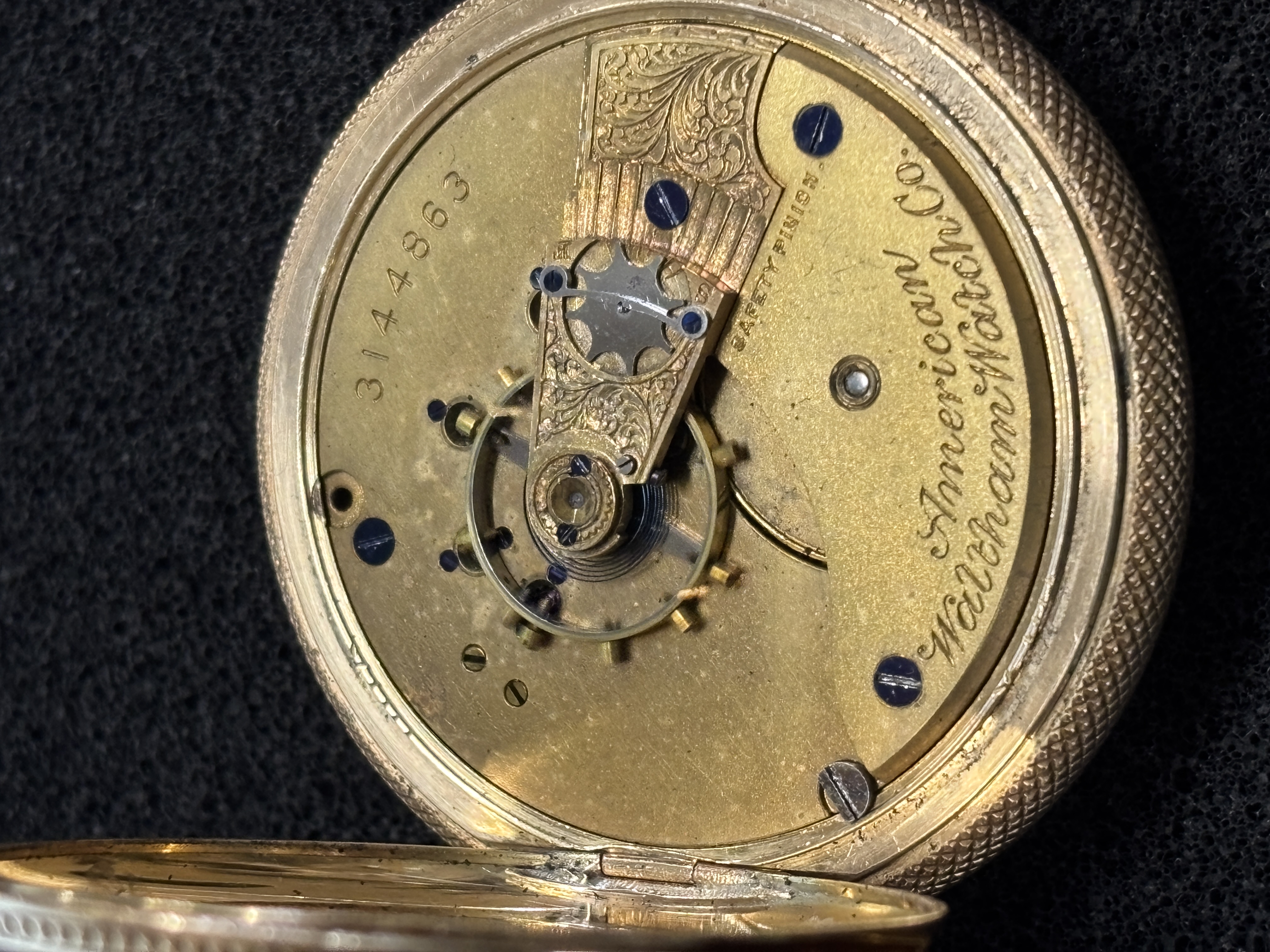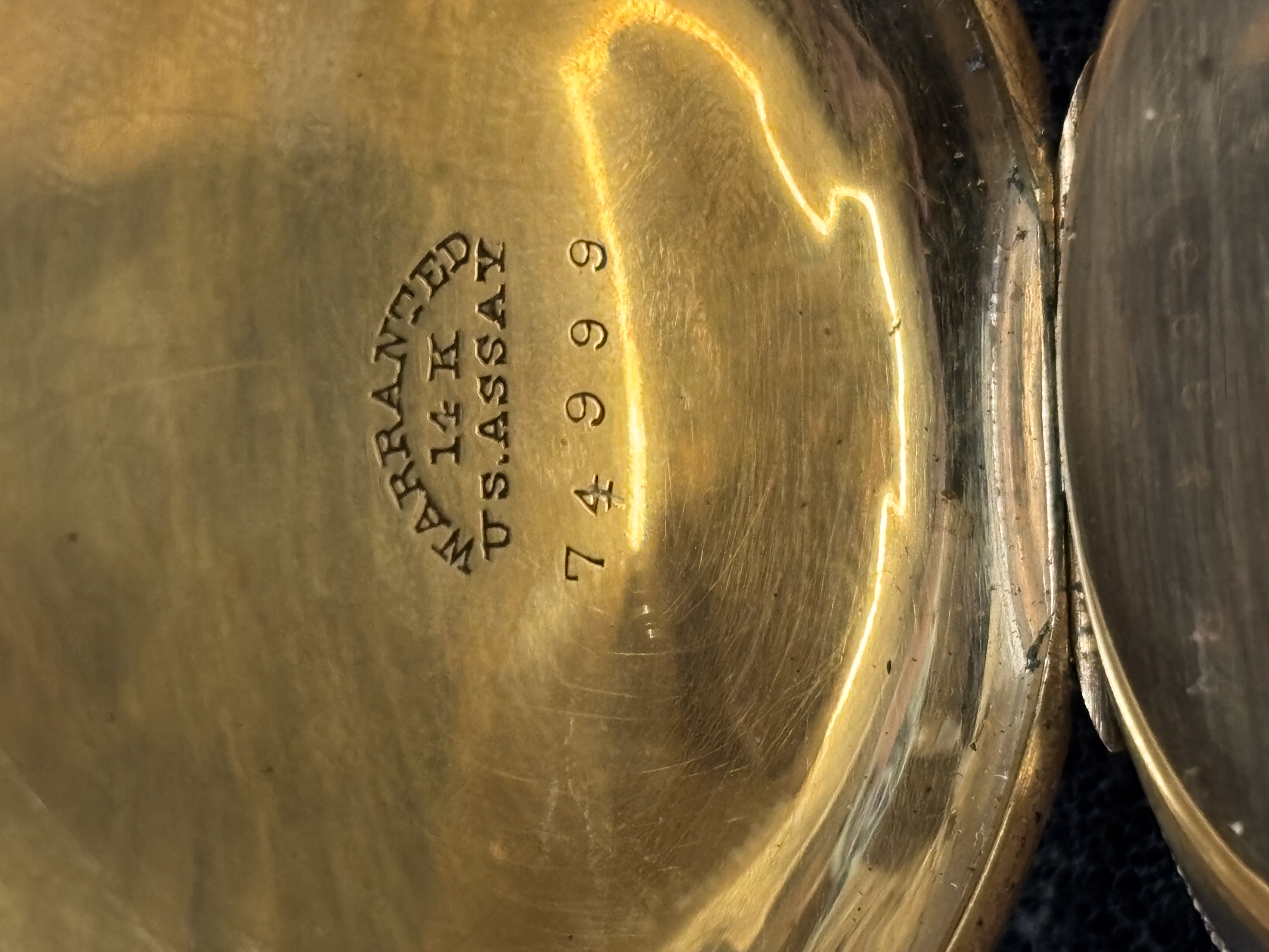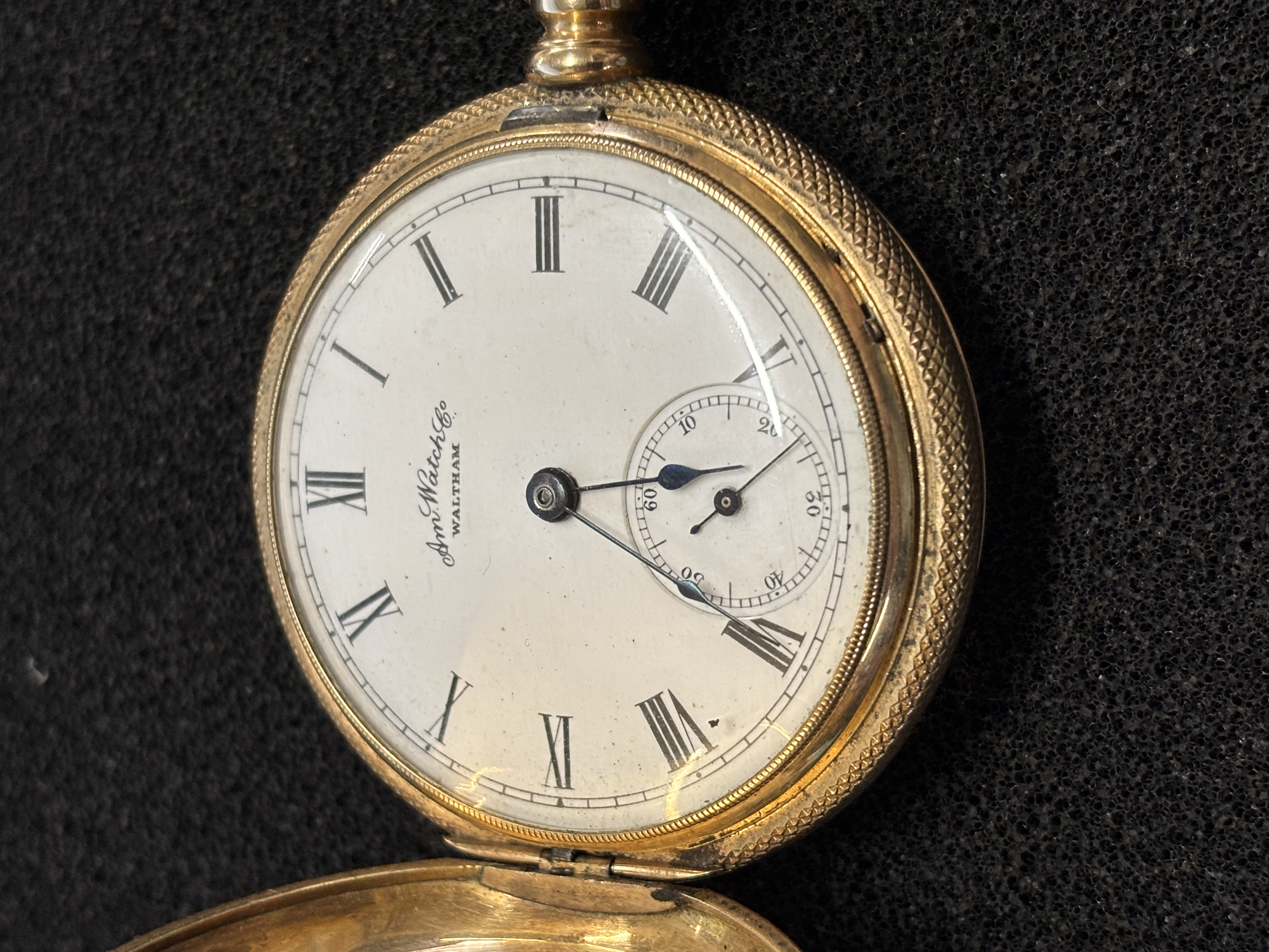 A Waltham 14 k Gold full hunter pocket watch manufactured by Amwatch Co stamped US Assay with serial number 74999