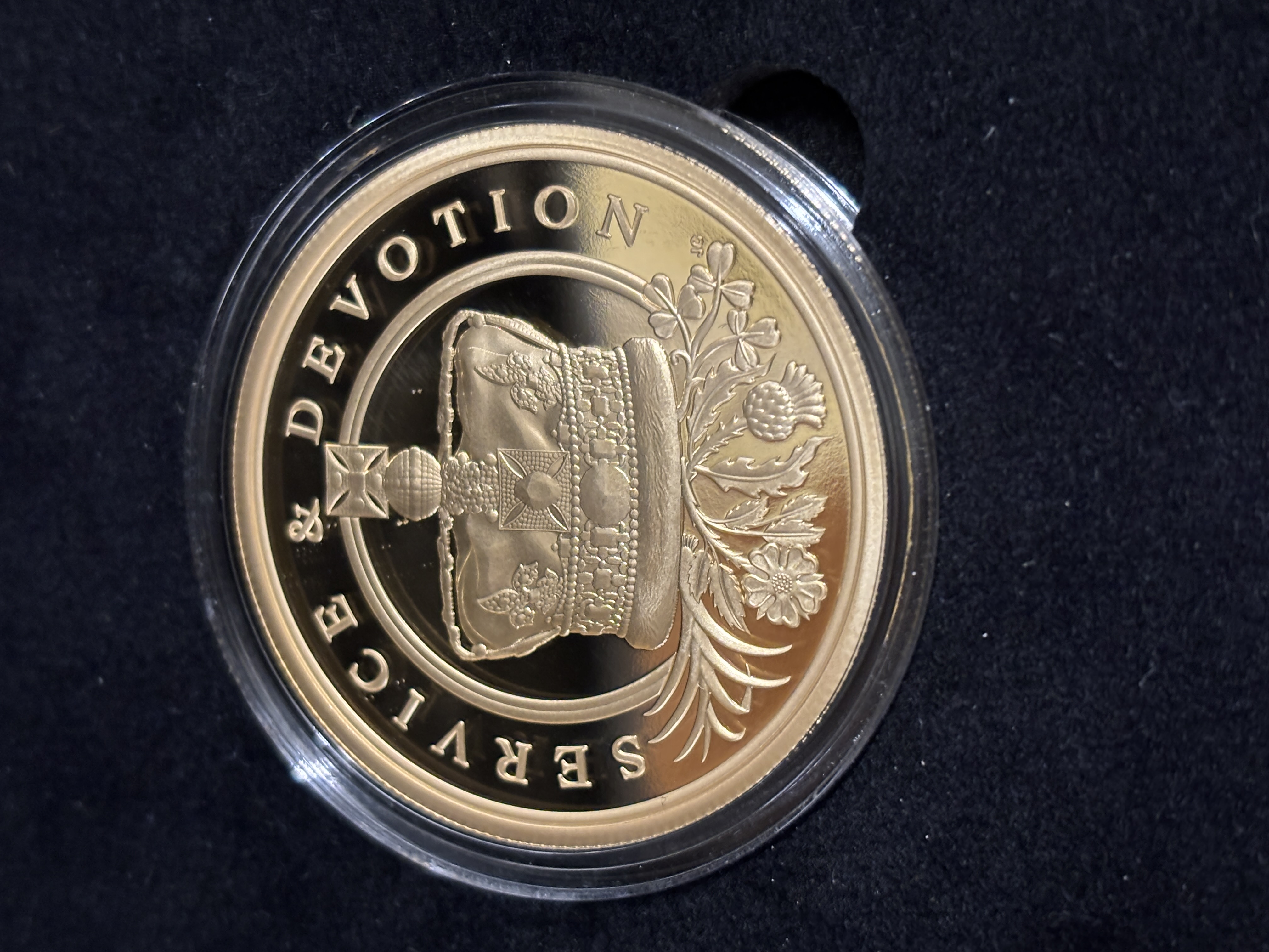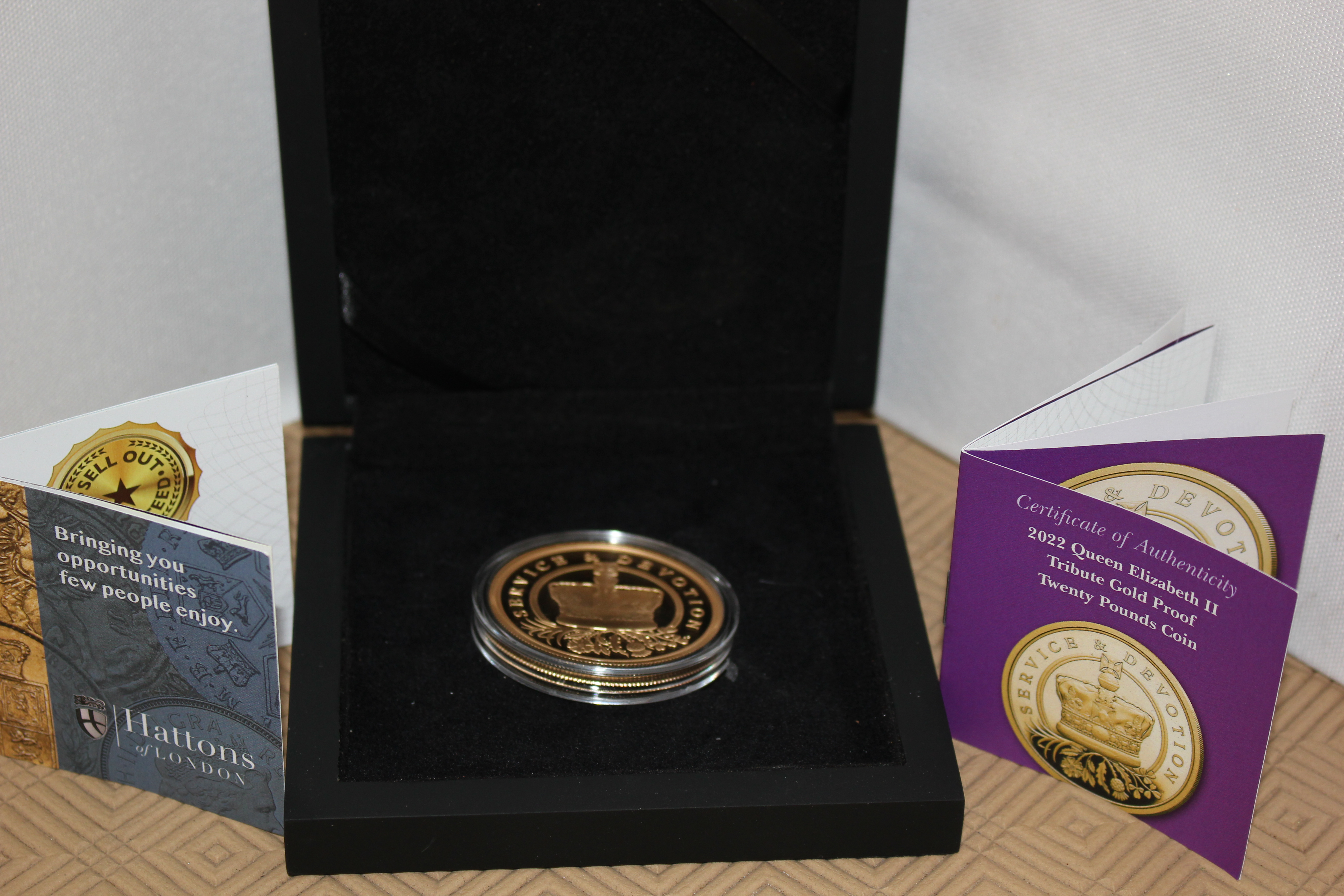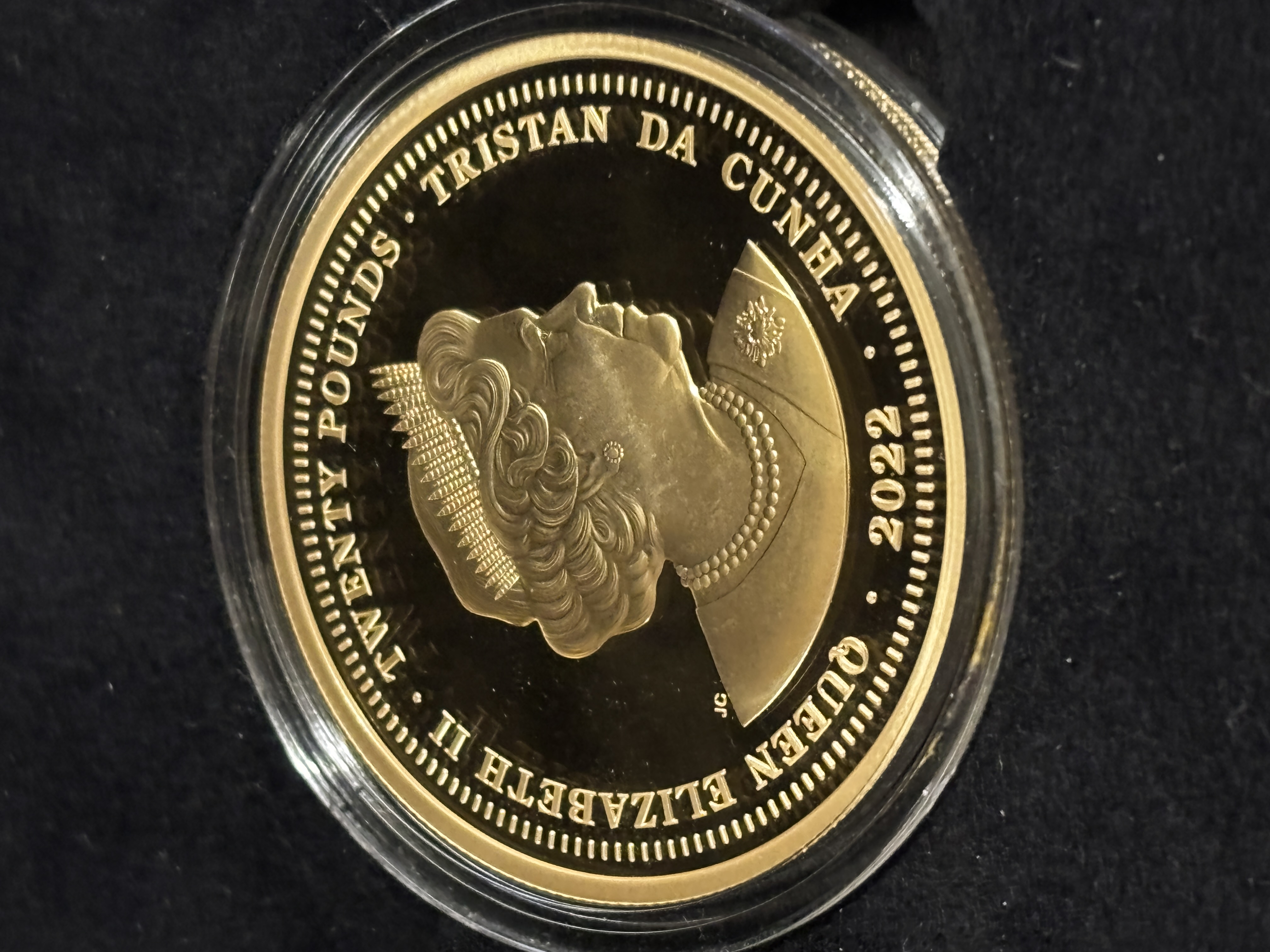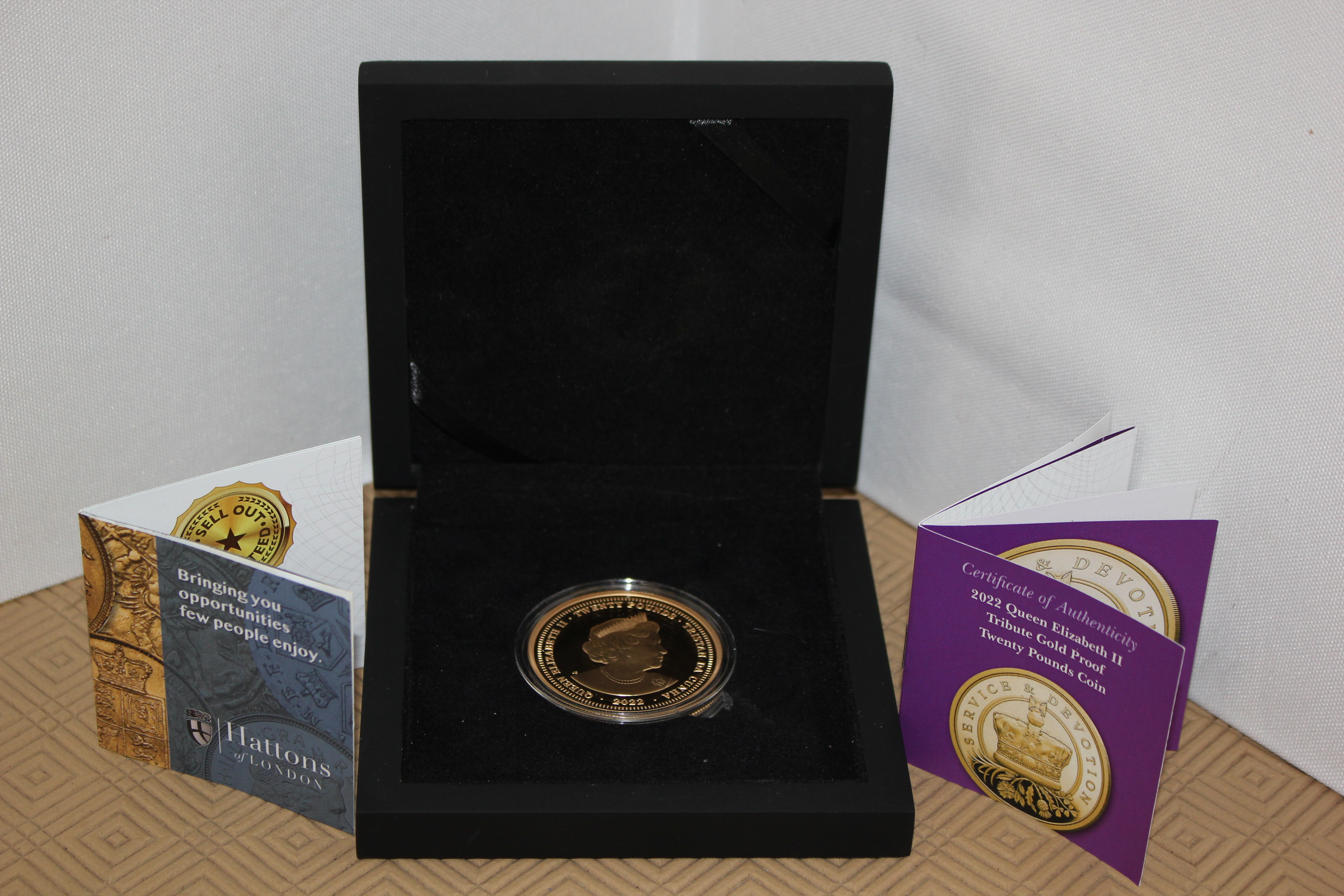 A 22ct solid gold £20 Proof coin issued as a tribute to HM Queen Elizabeth II in 2022. 45 cm diameter and weighing 2.5 ounces (70.874 gm) One of only 199 minted worldwide.