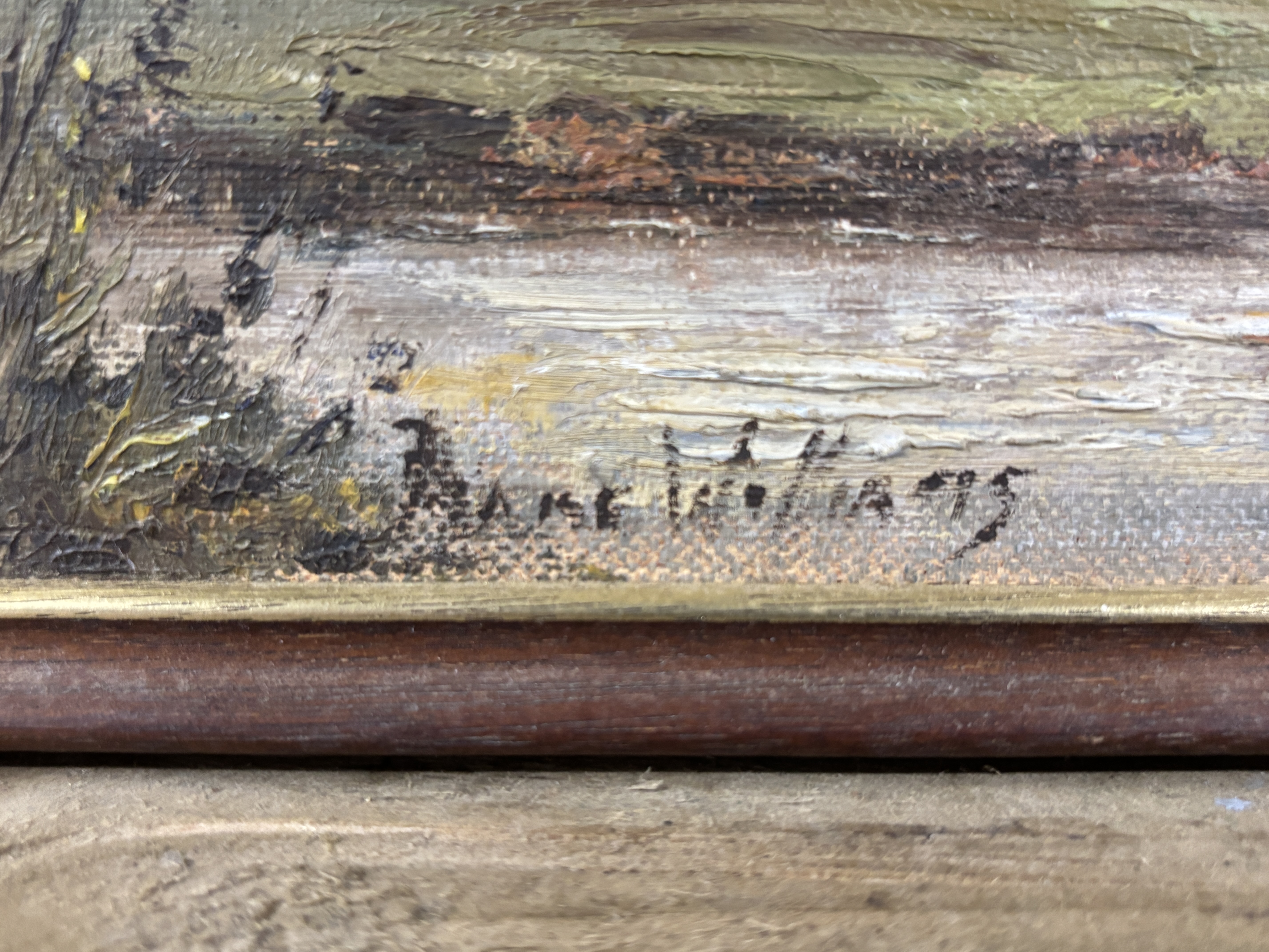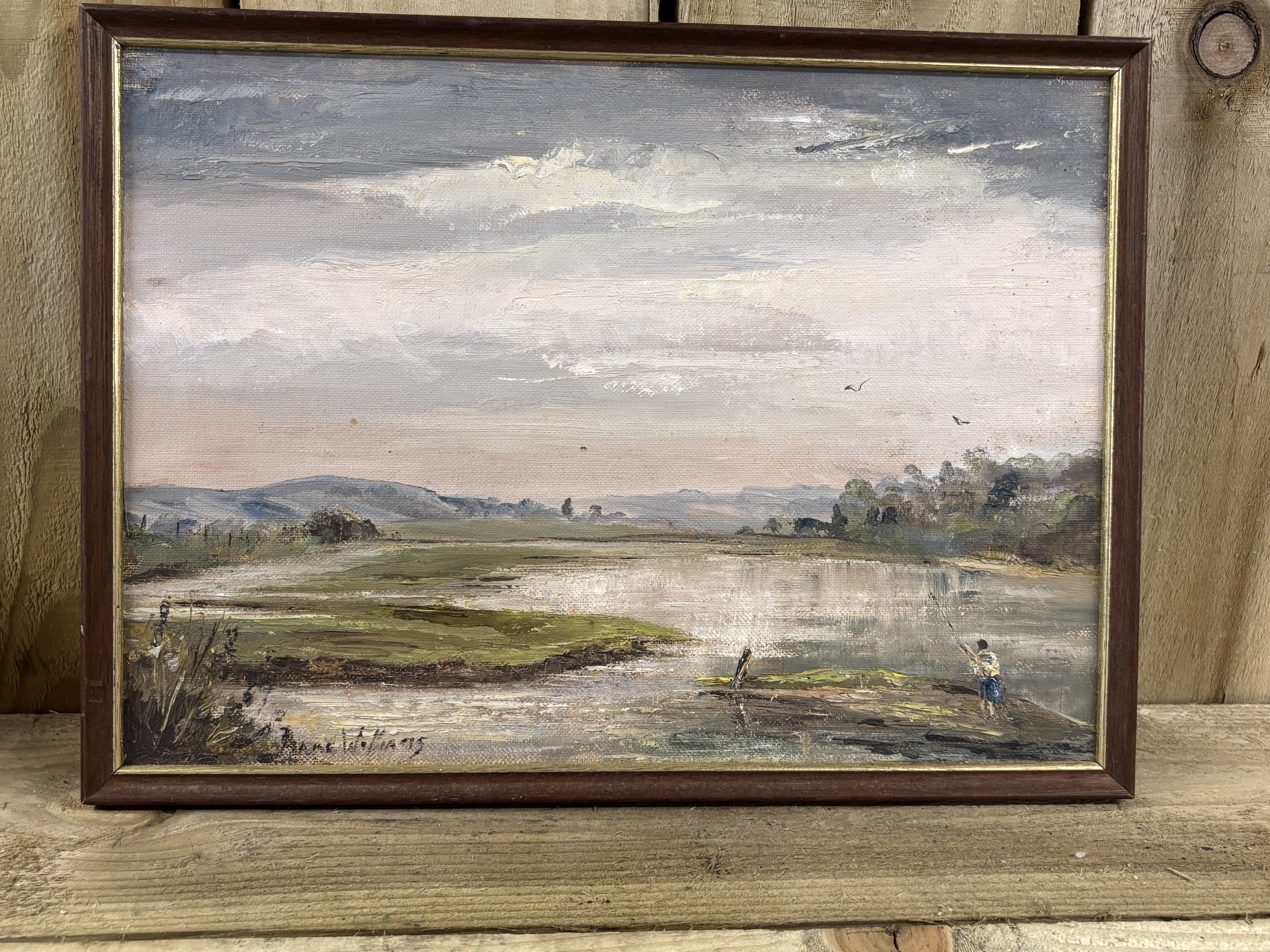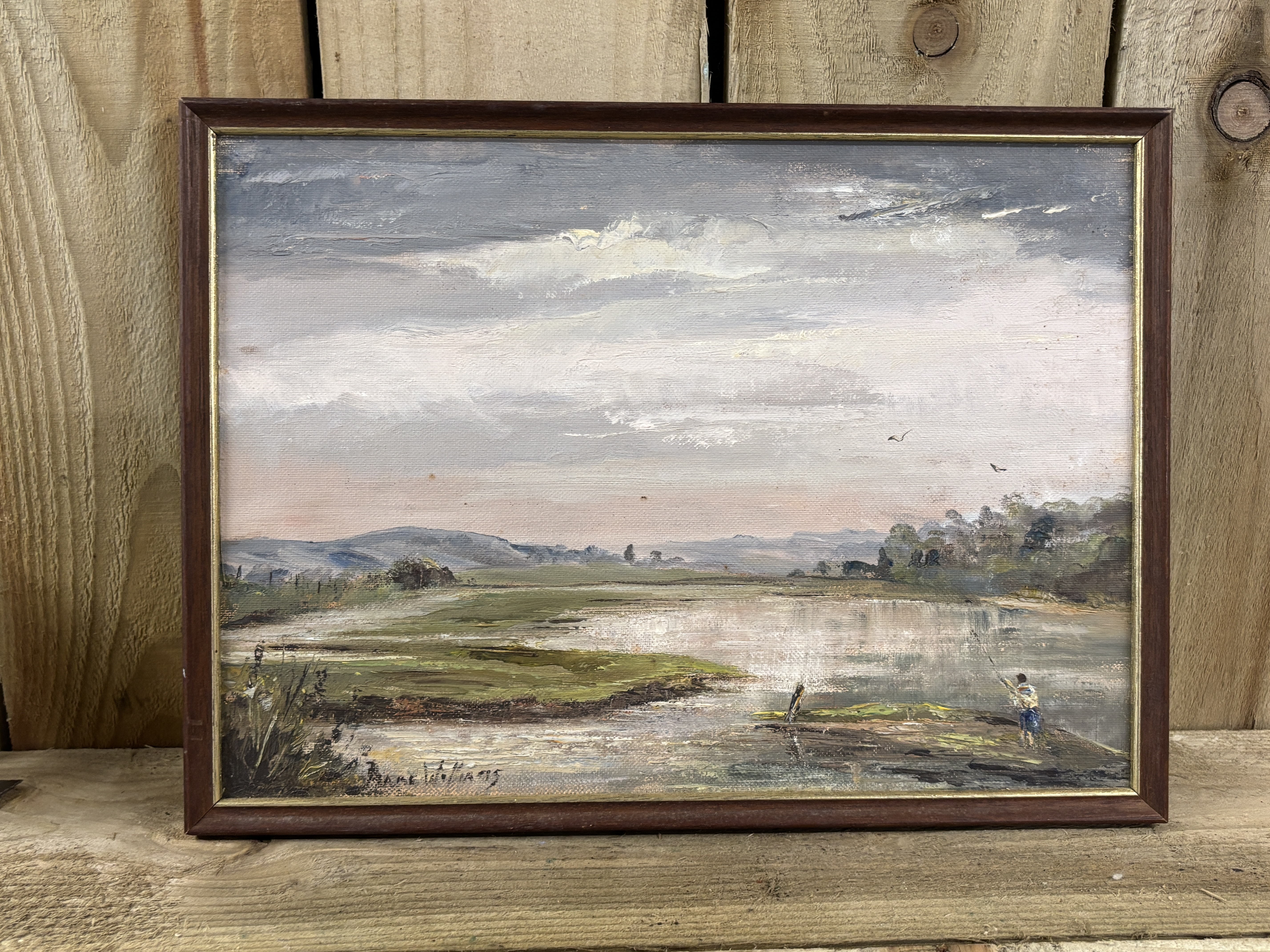 An oil on board painting of a river fisherman by Anne(?) Williams measuring 27 x 32 cm