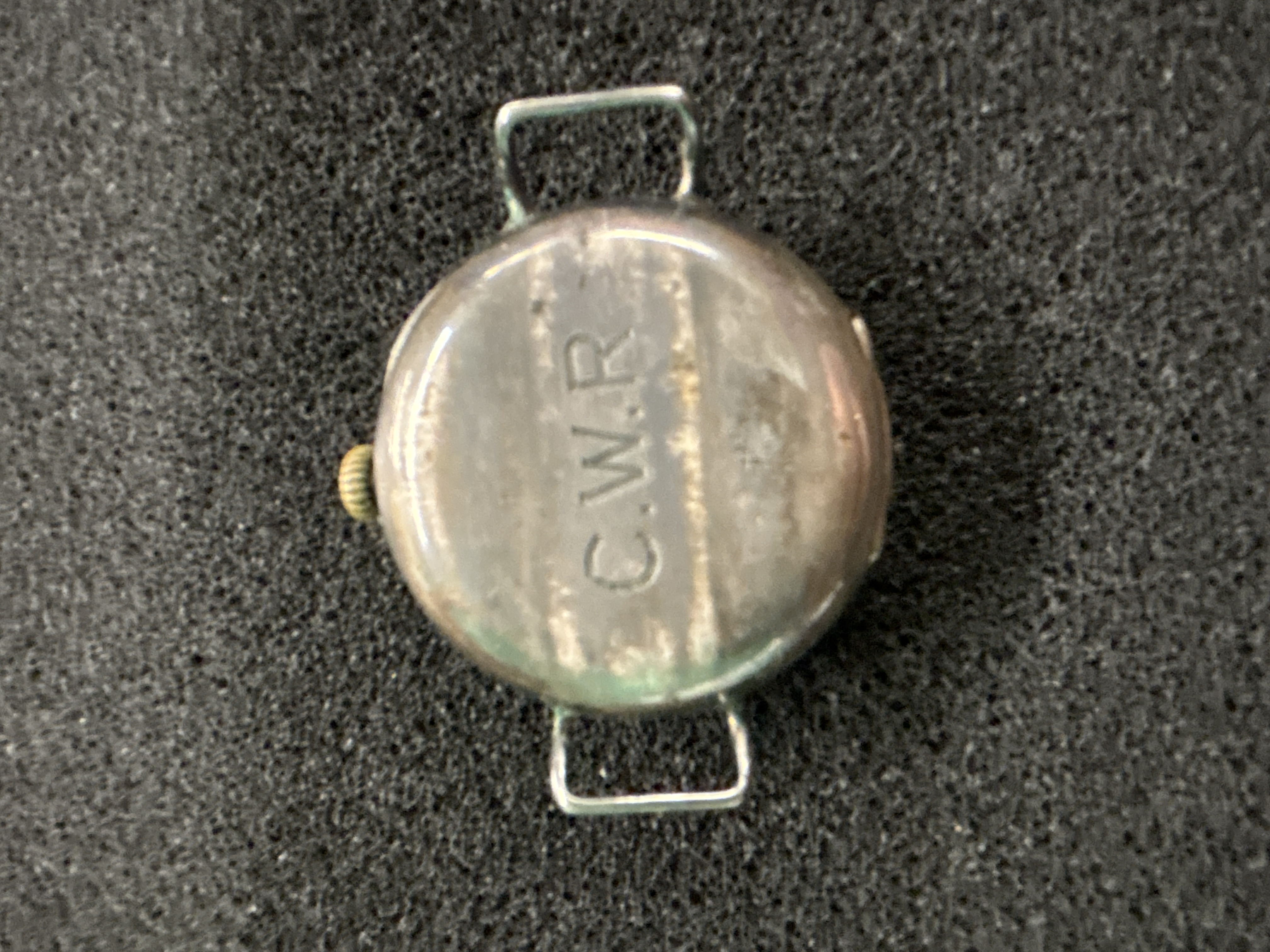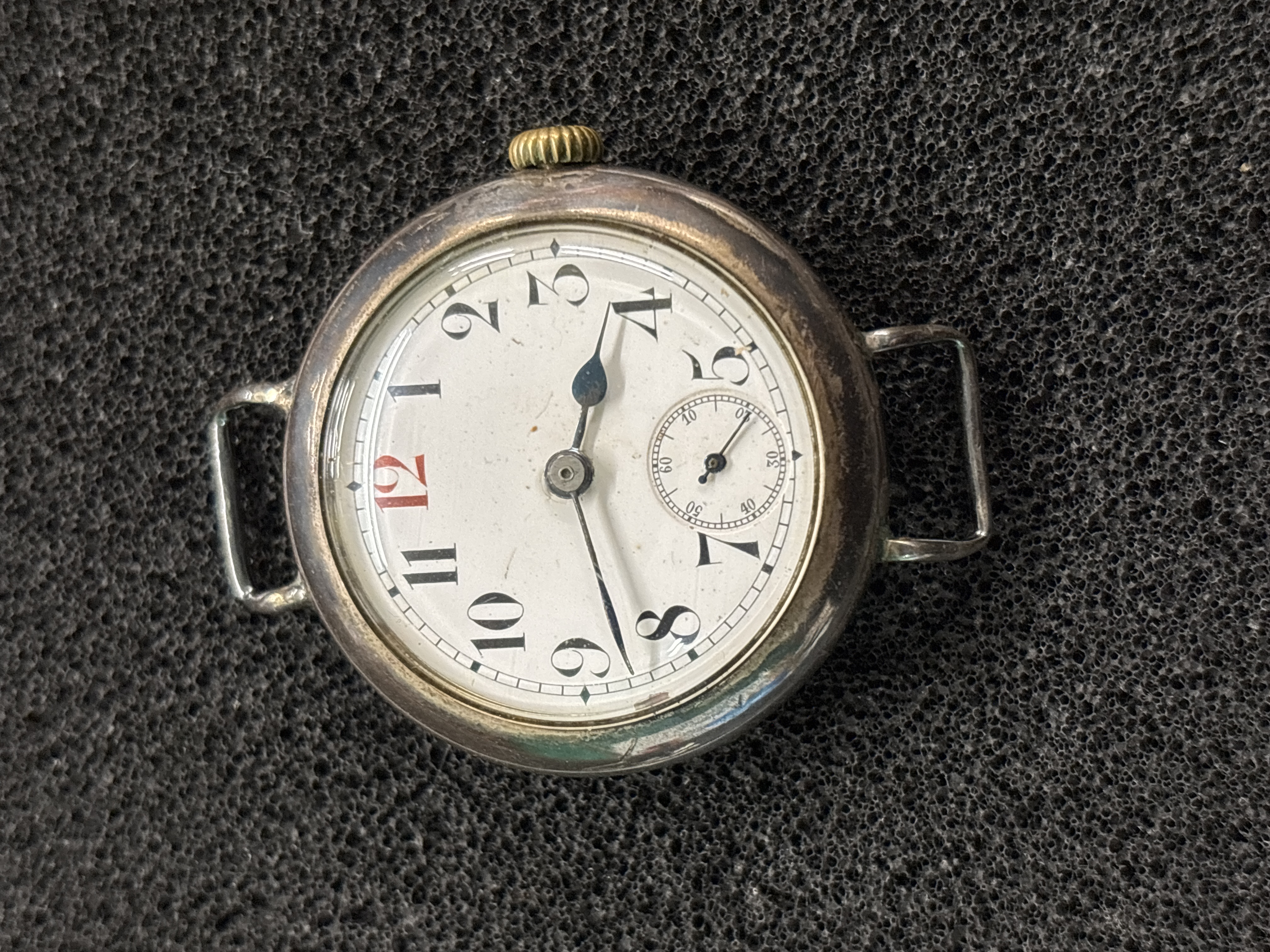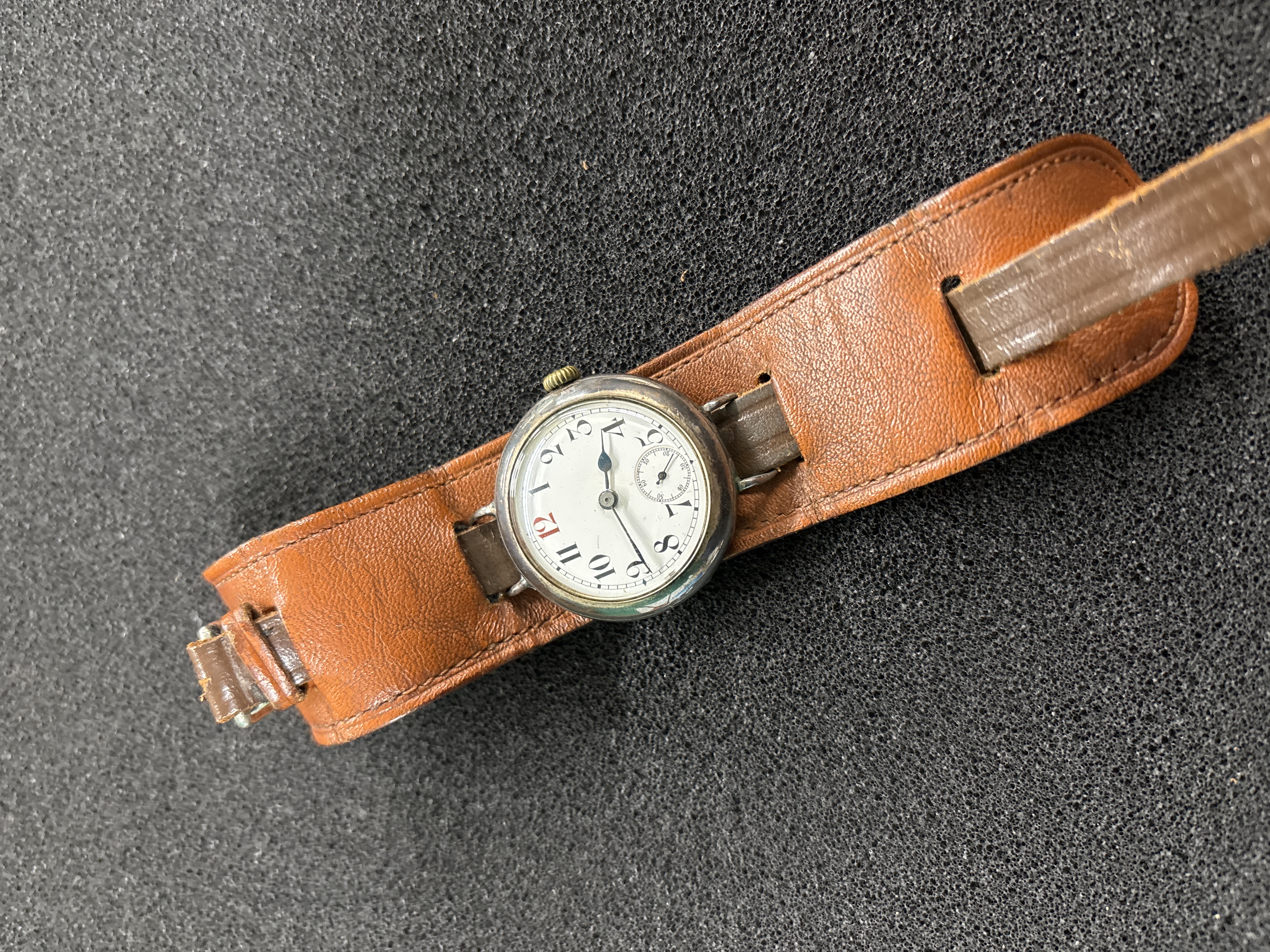 A WWI period silver cased Omega Officer’s trench watch with 35 mm face and a later leather strap