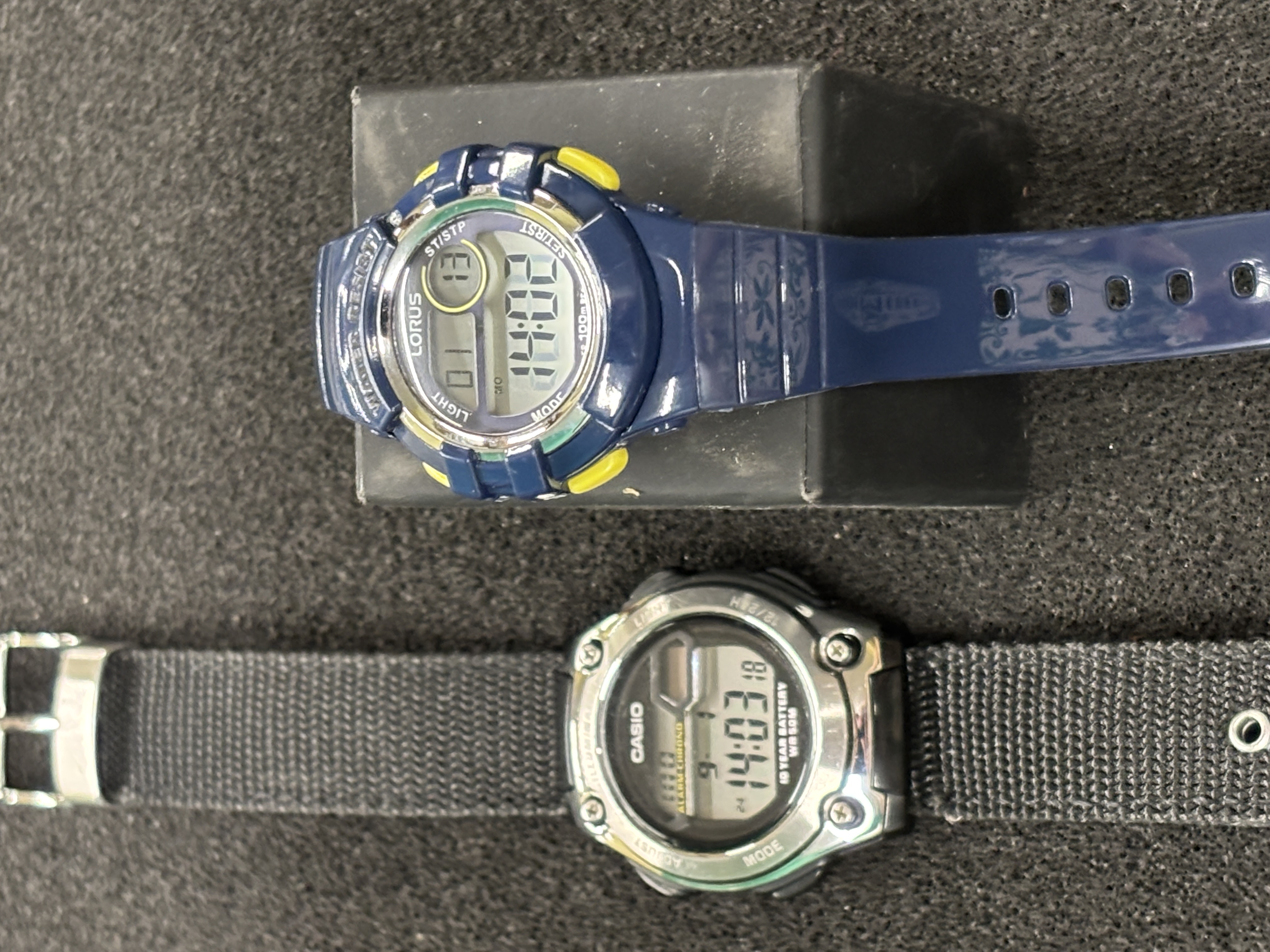 A Casio and Lorus LCD wristwatch with 35 cm and 33 cm diameter faces