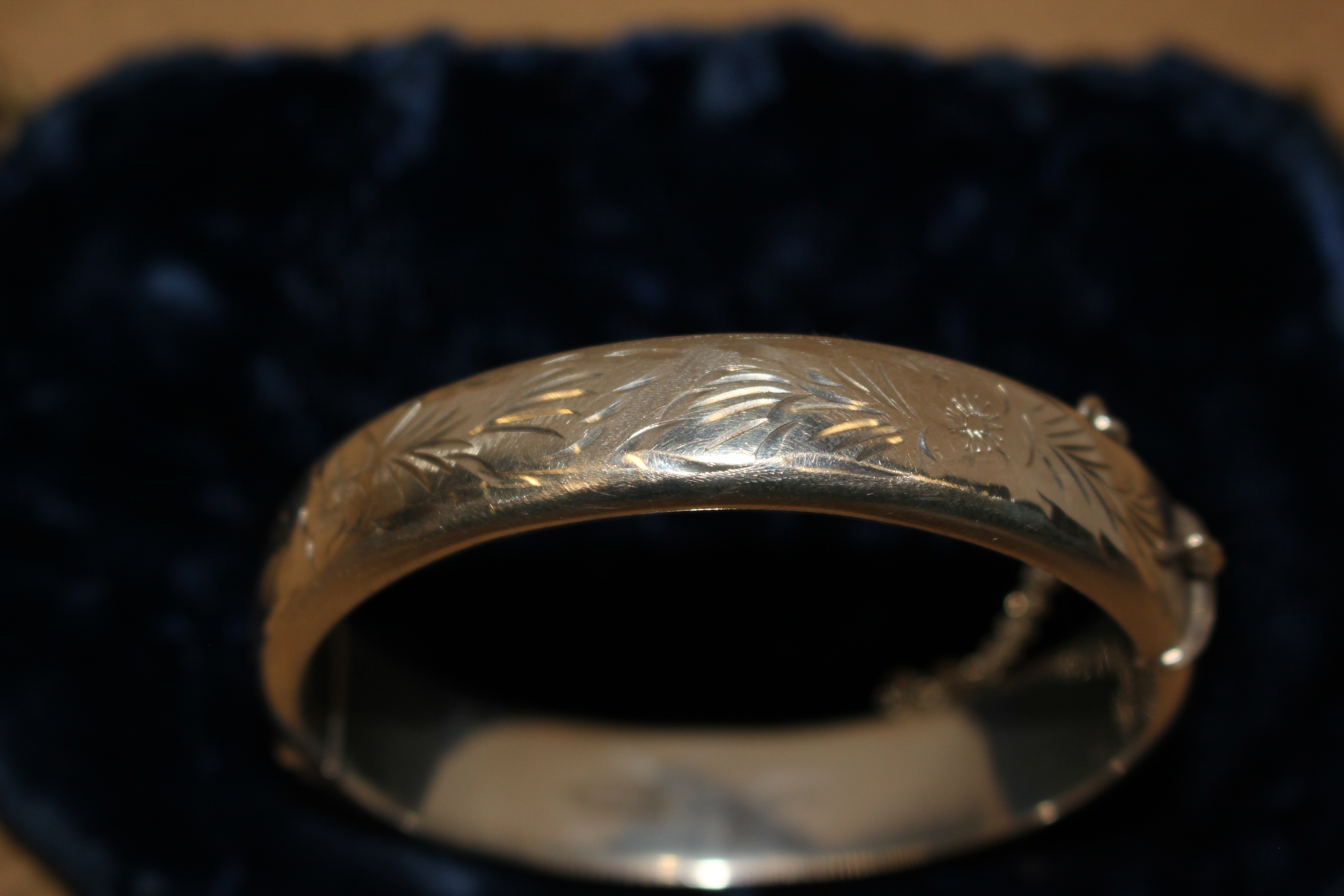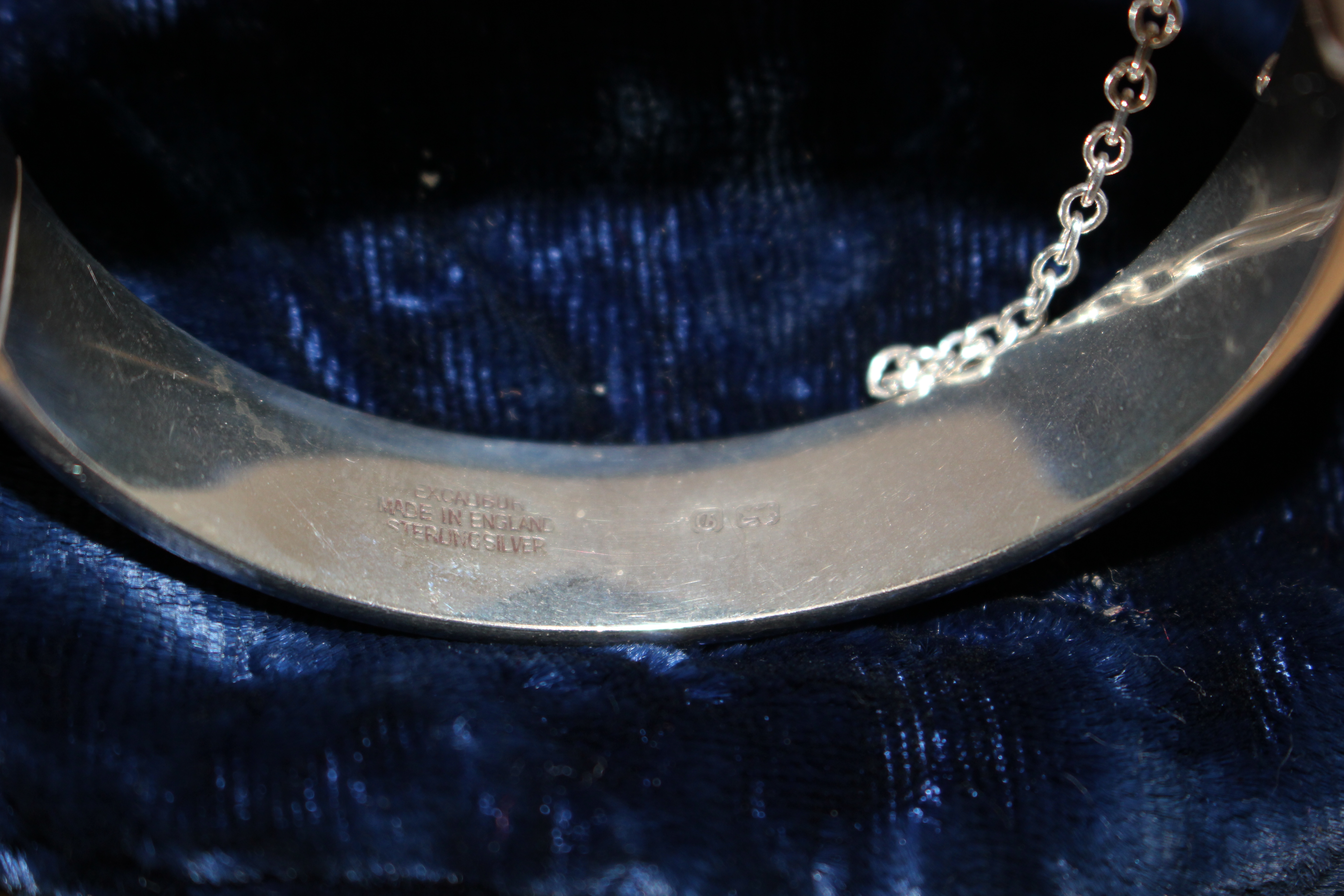 A silver bangle with engraved decoration and safety...