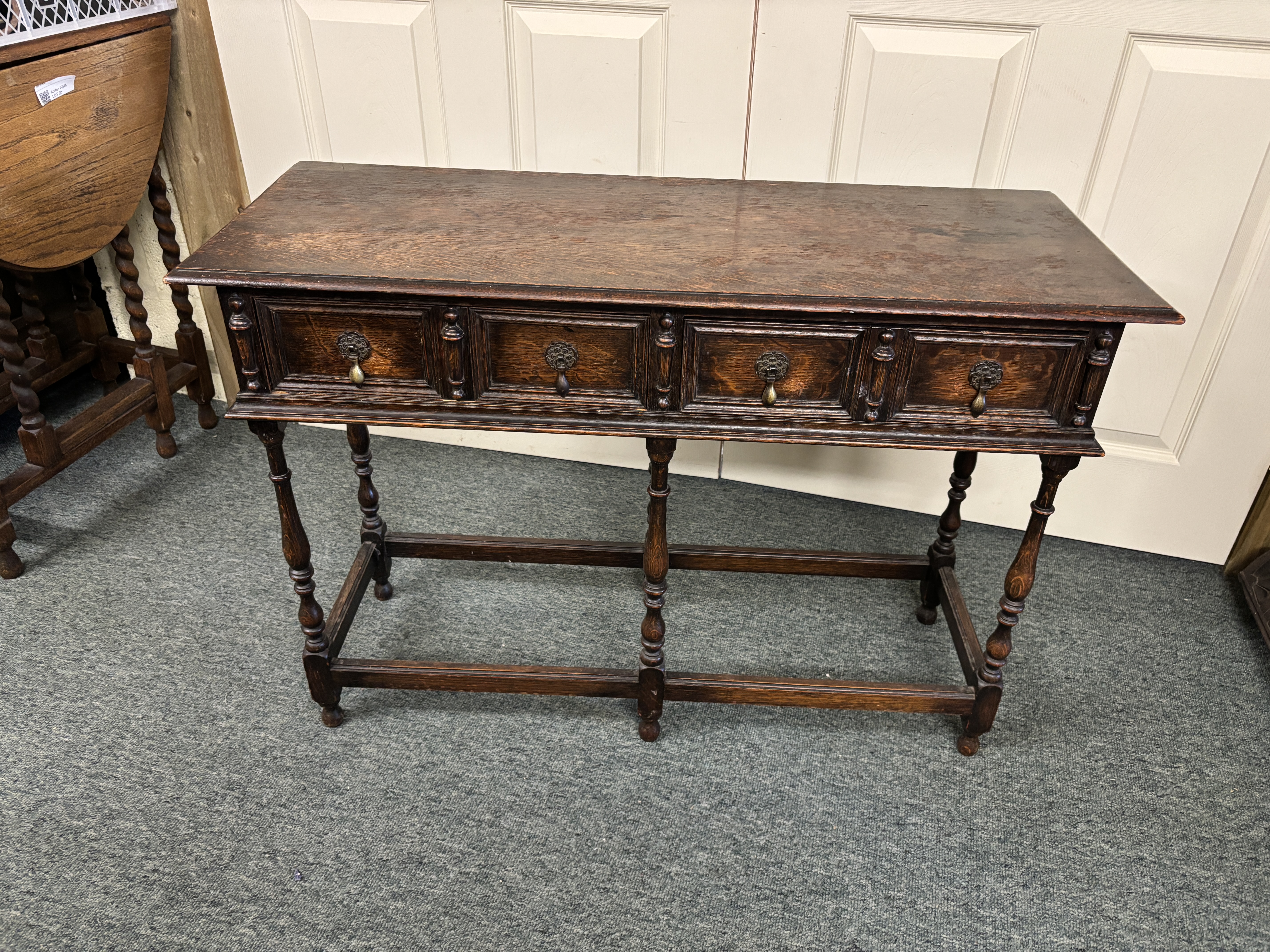 An oak side table with four drawers measuring 65 cm high, 94 cm wide and 36 cm deep