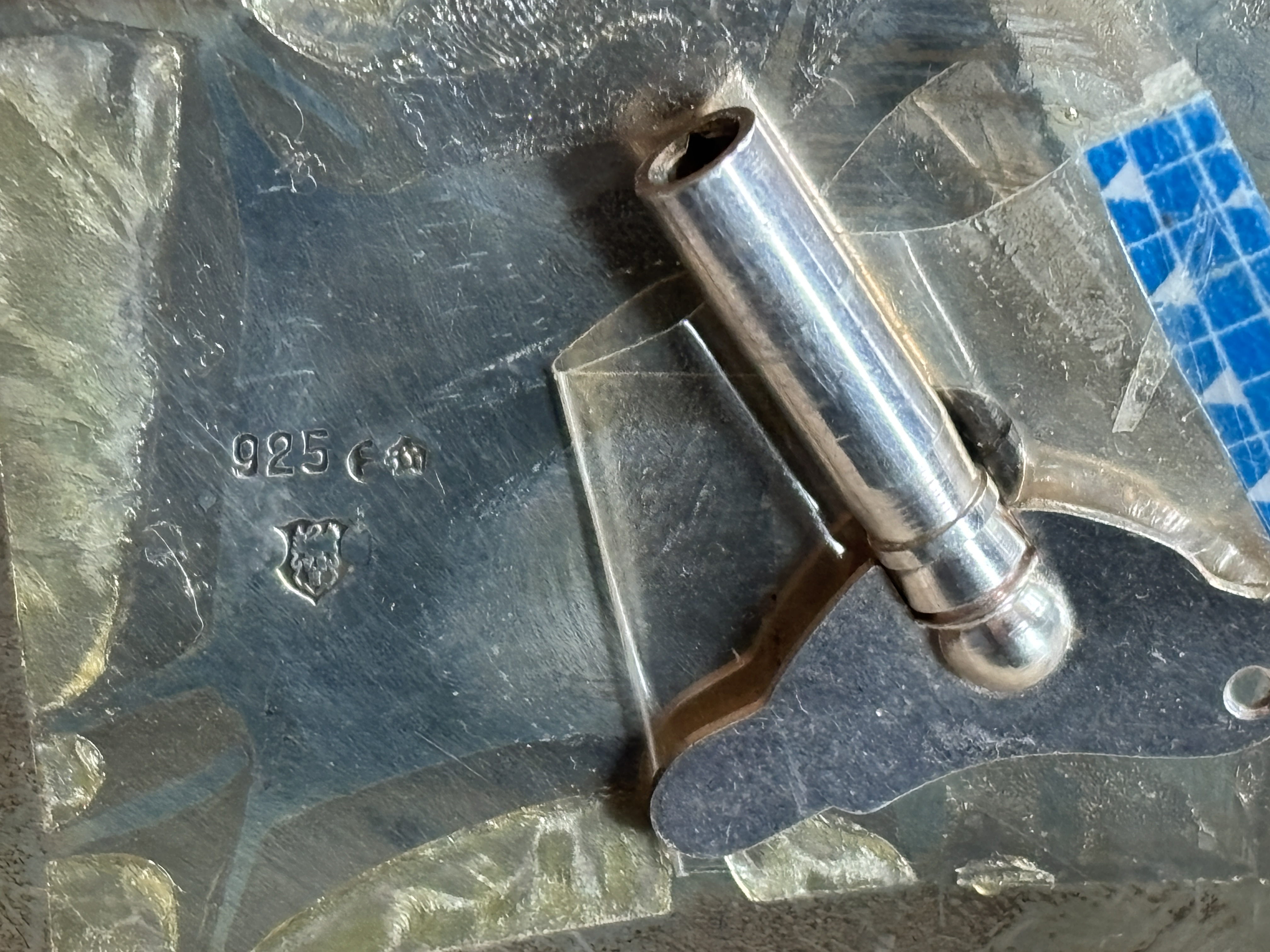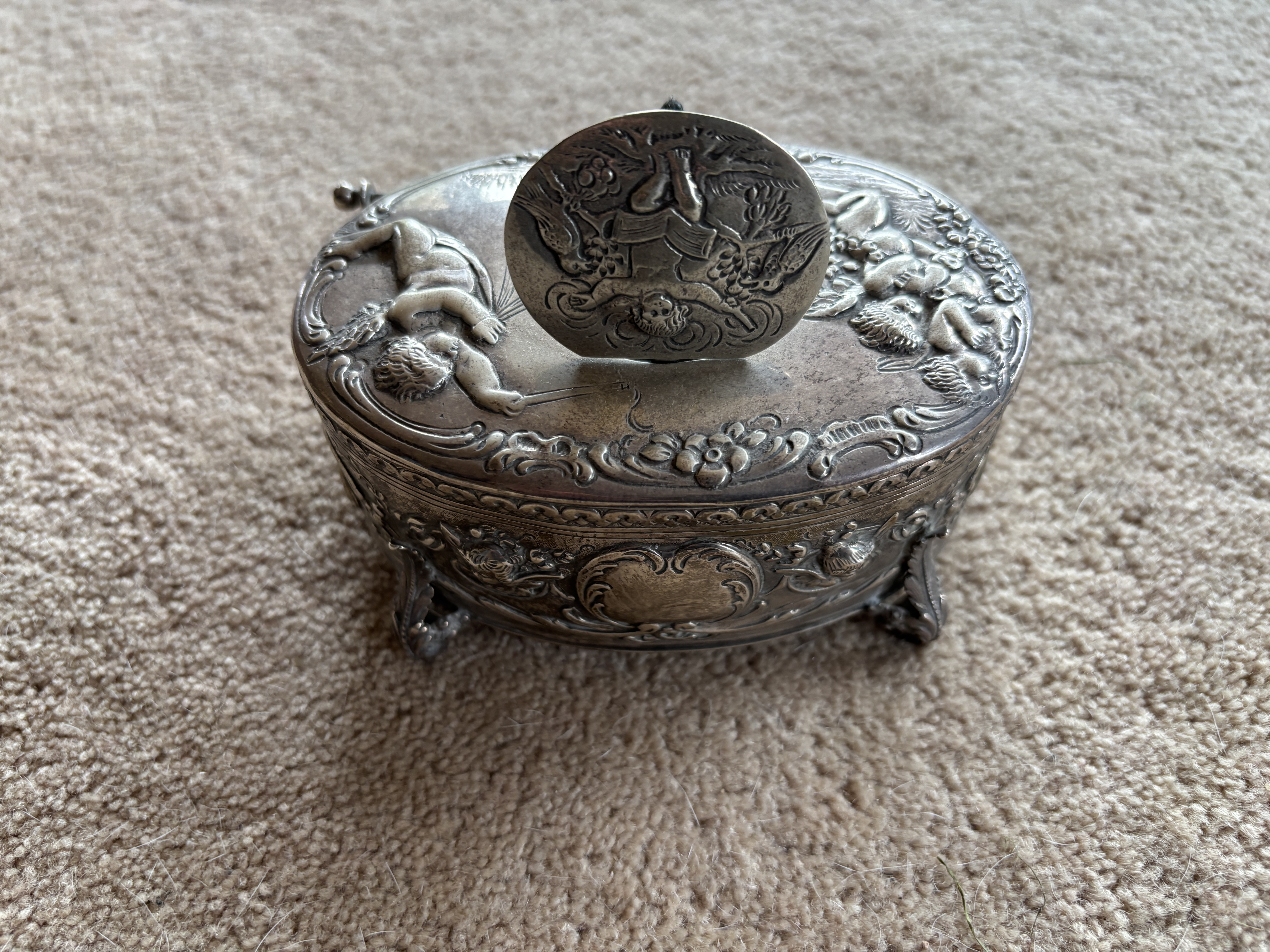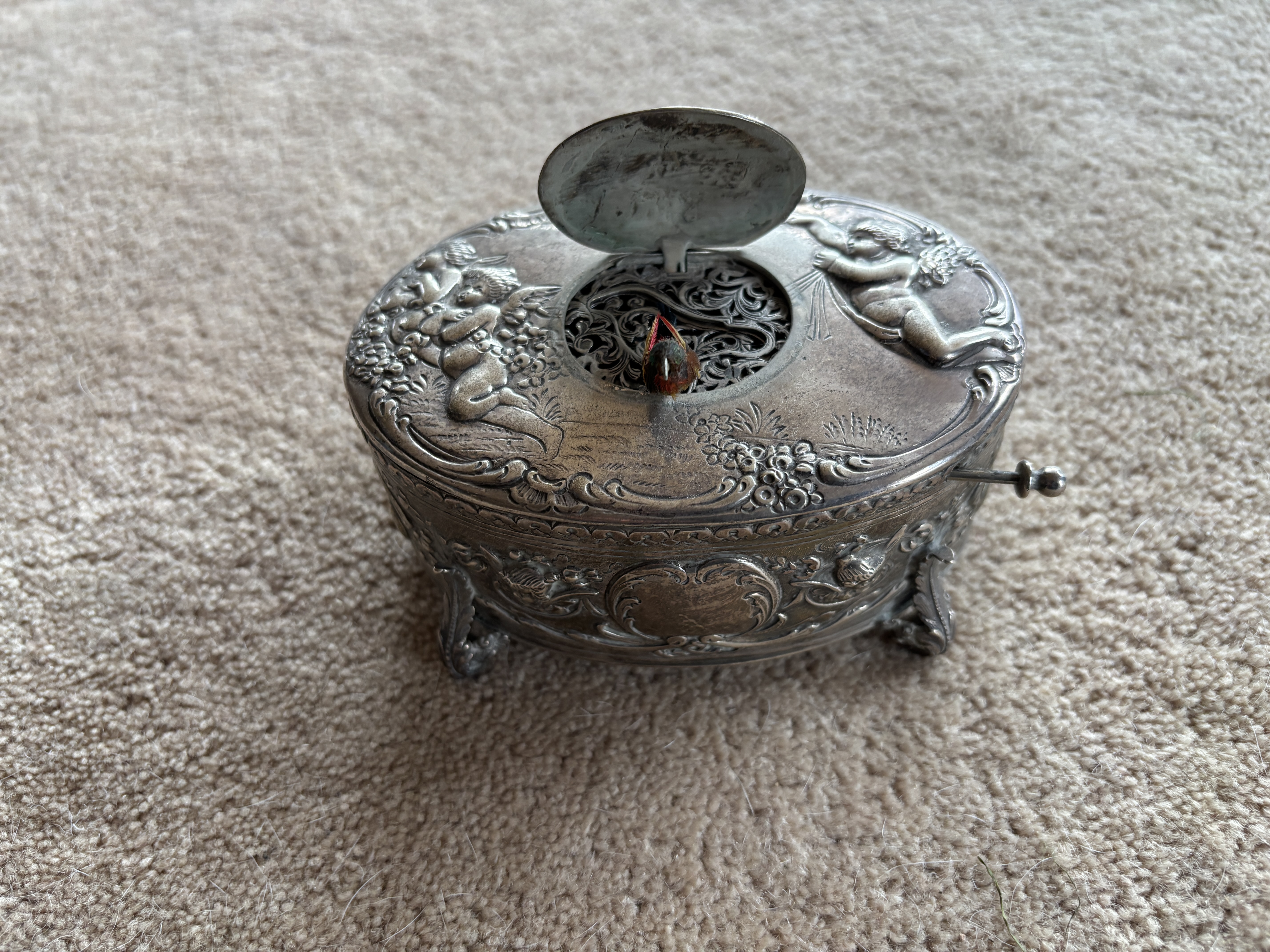 A very heavy Silver music box, having a pop up bird on the top. The box is marked 925 and has the key.