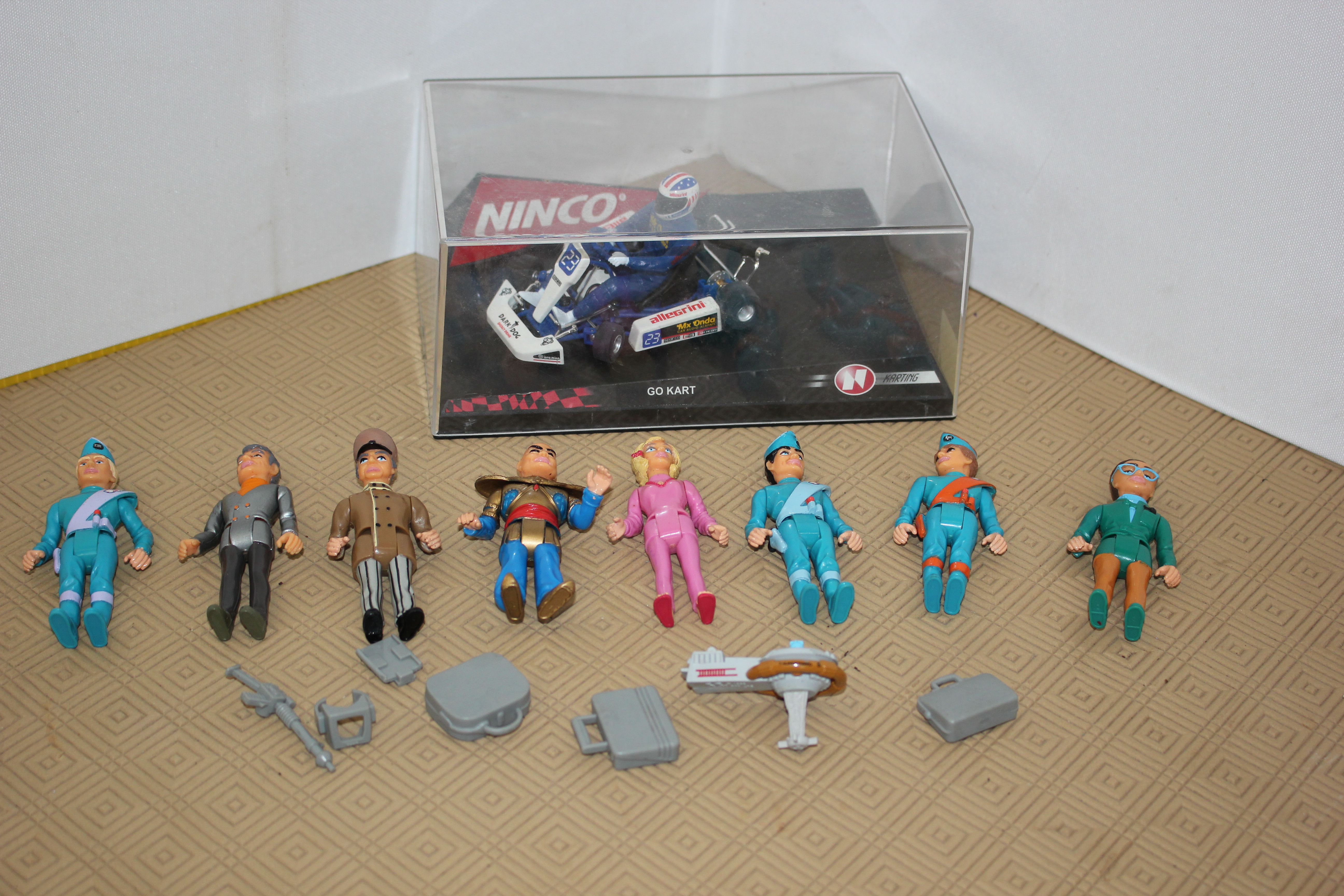 A bag of Thunderbird figures and accessories plus a Scalextric Go kart