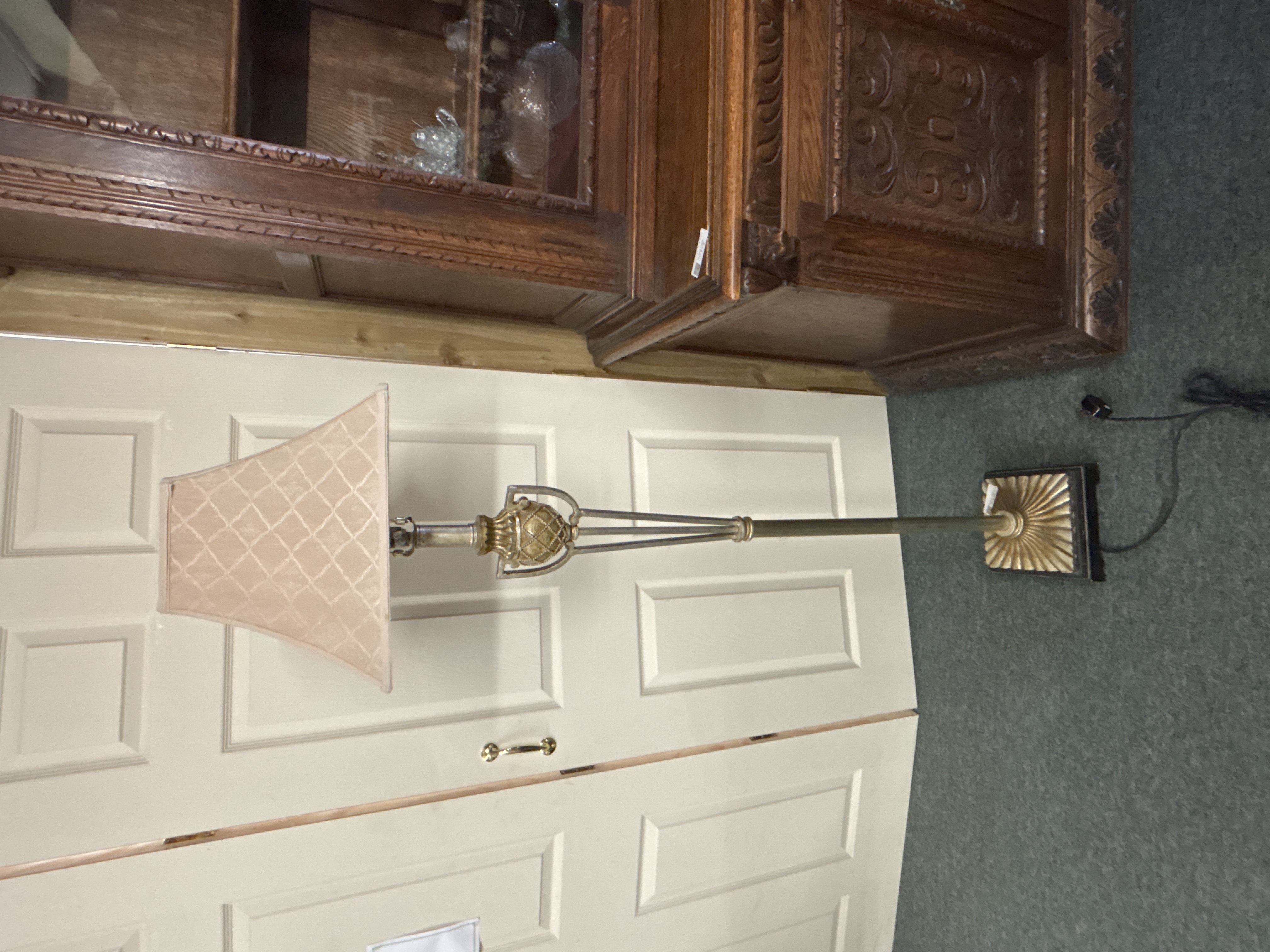 A metal standard lamp with cream shade