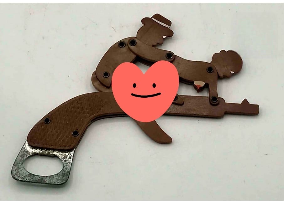 A novelty Bakelite bottle opener in the shape of a pistol having two movable figures …….