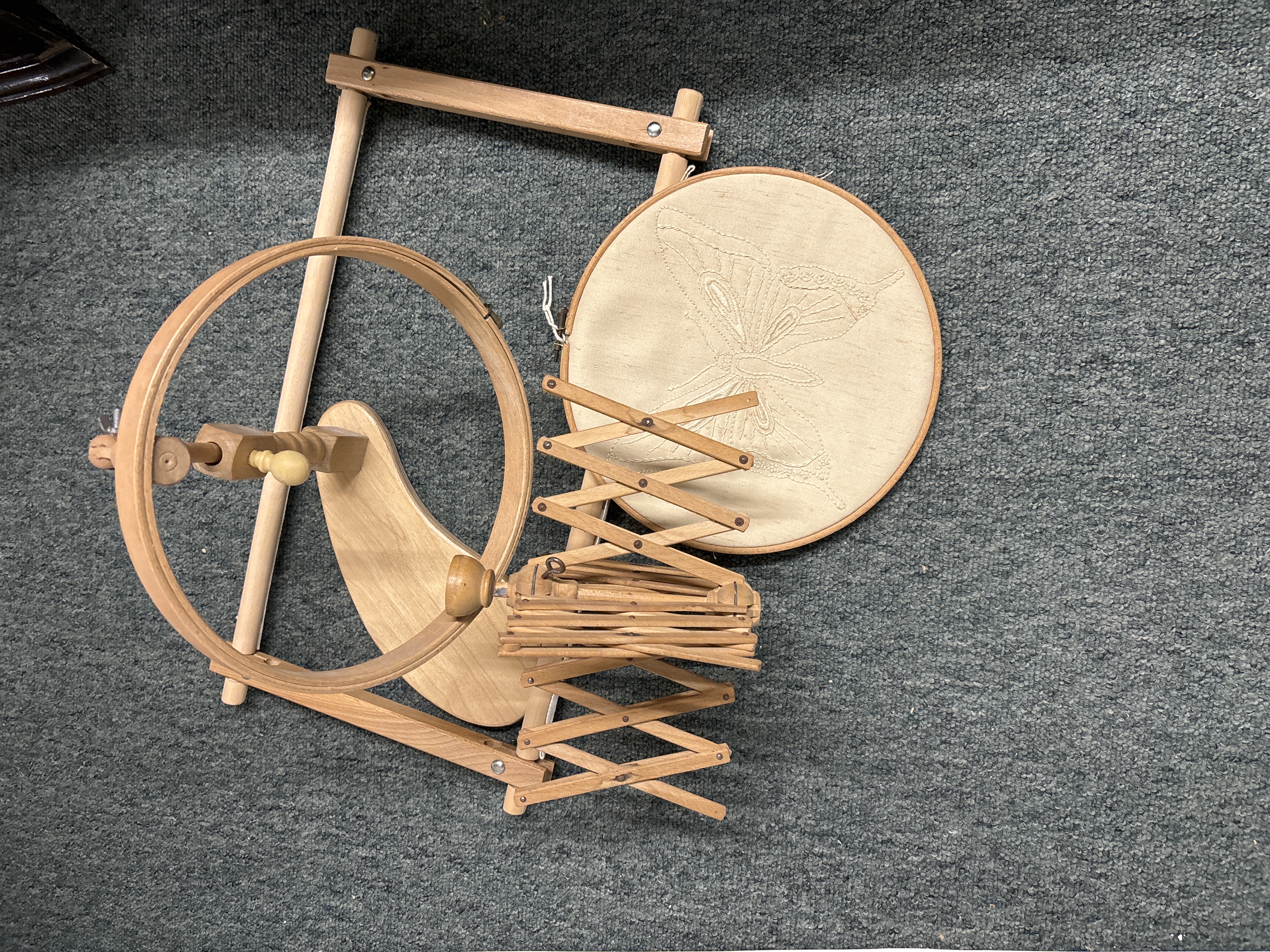 An embroidery hoop with stand and tapestry frame together with a wool winder