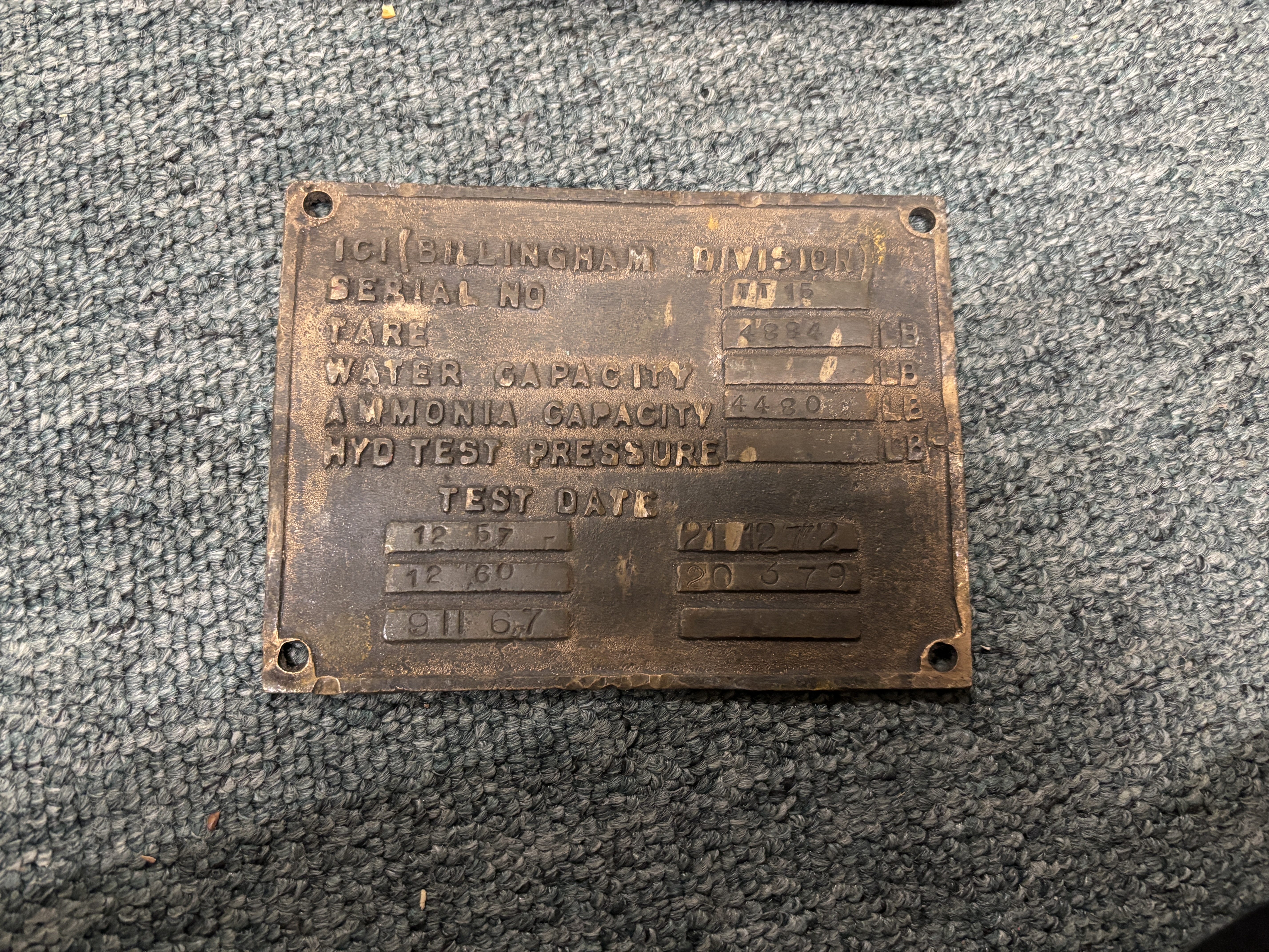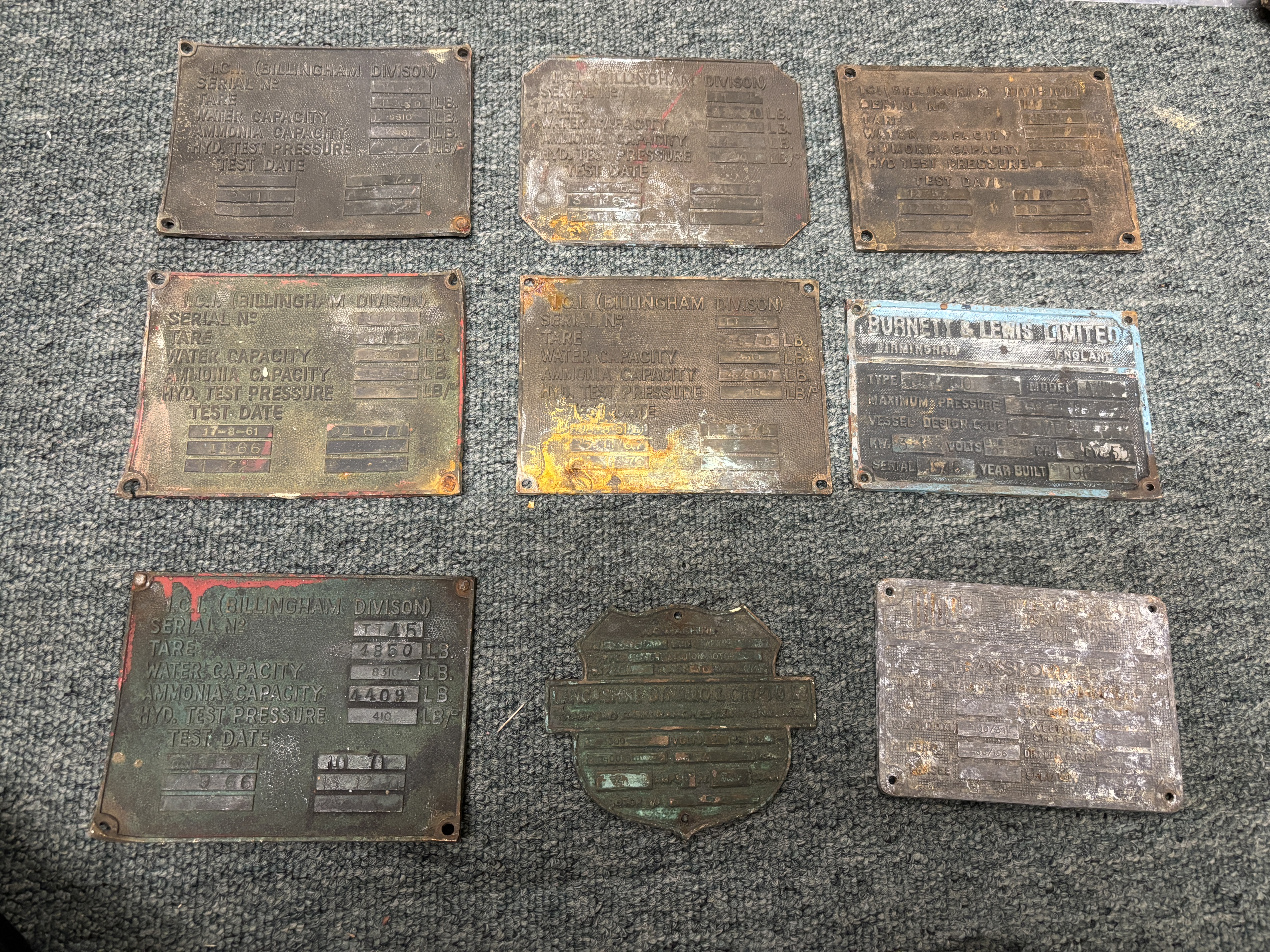 Nine metal identification plates
