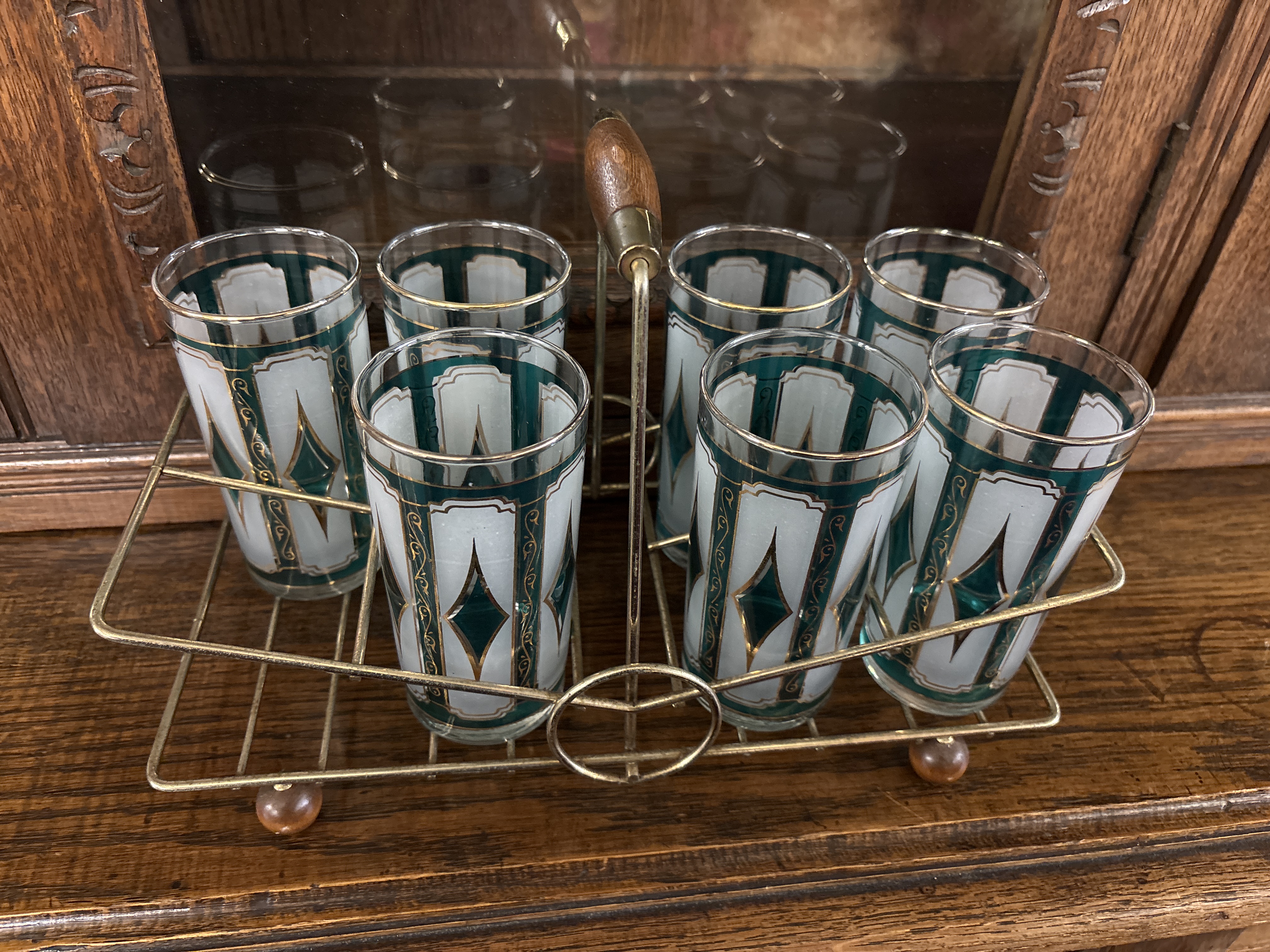 Seven vintage tumblers in metal holder