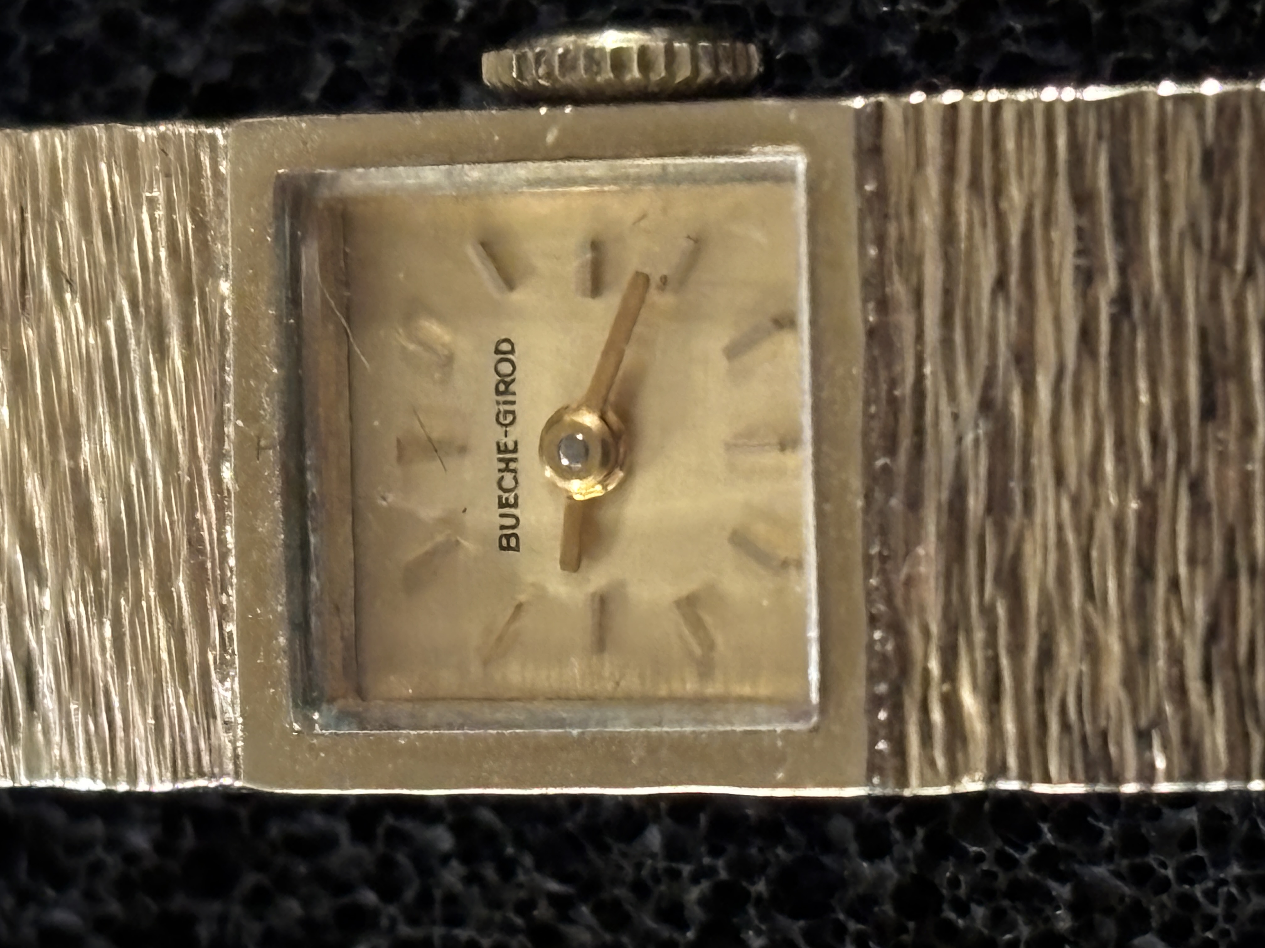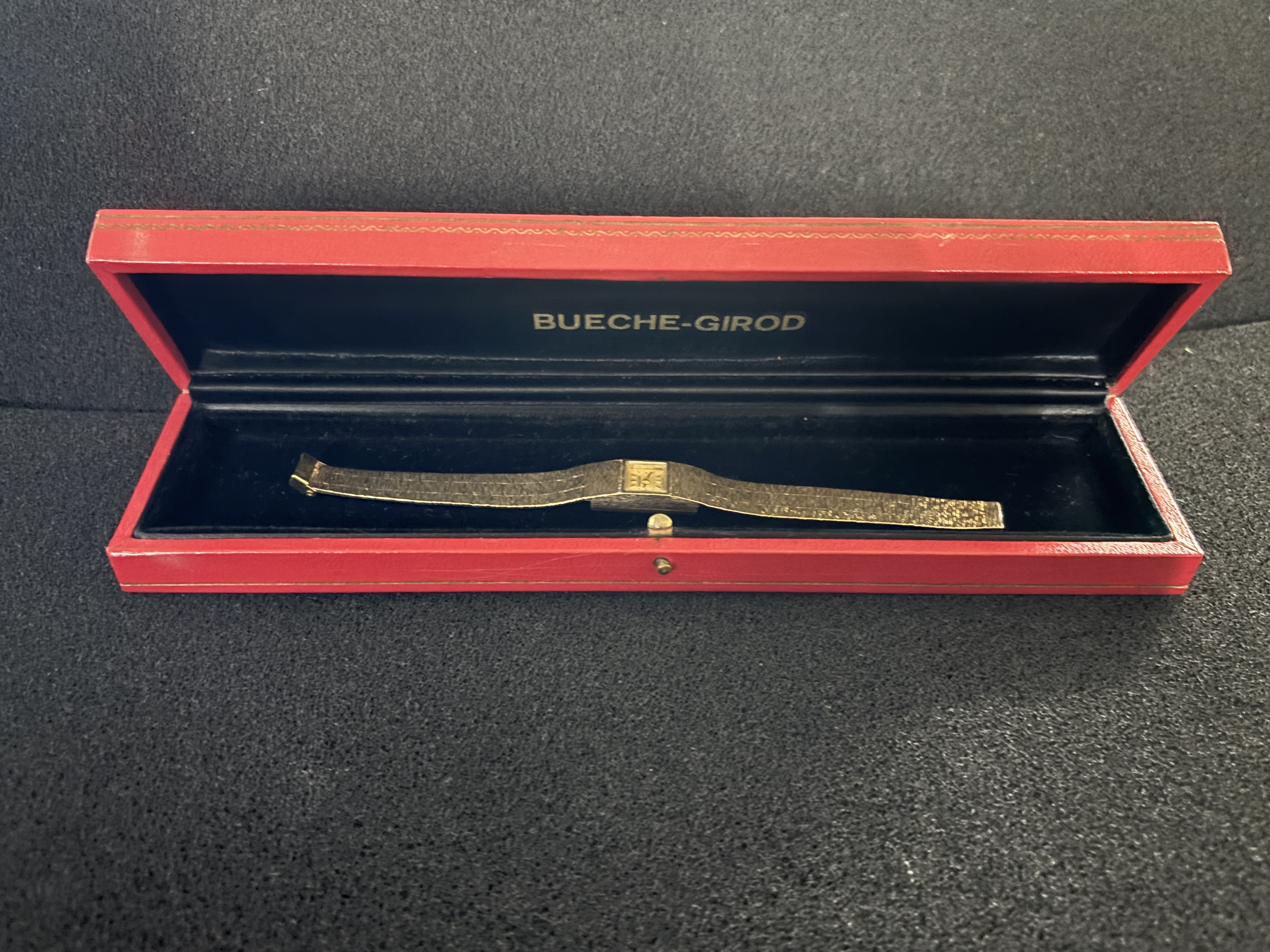 A ladies Beuche-Girod 9ct gold wristwatch in original box weighing 27 gms