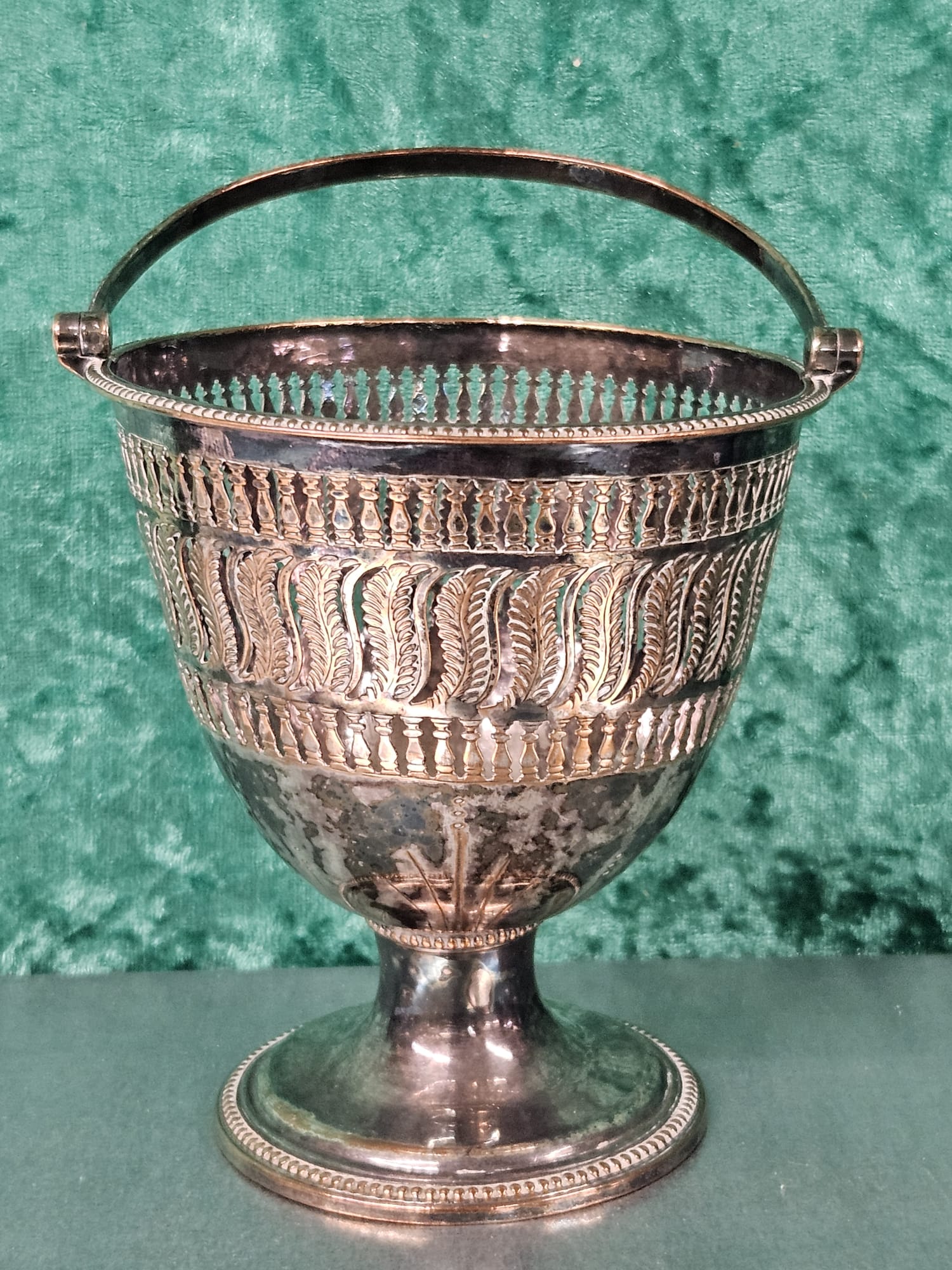 An antique Sheffield plate sugar basin of Georgian design having fern and baluster decoration, ( no liner), Height with handle 17cm