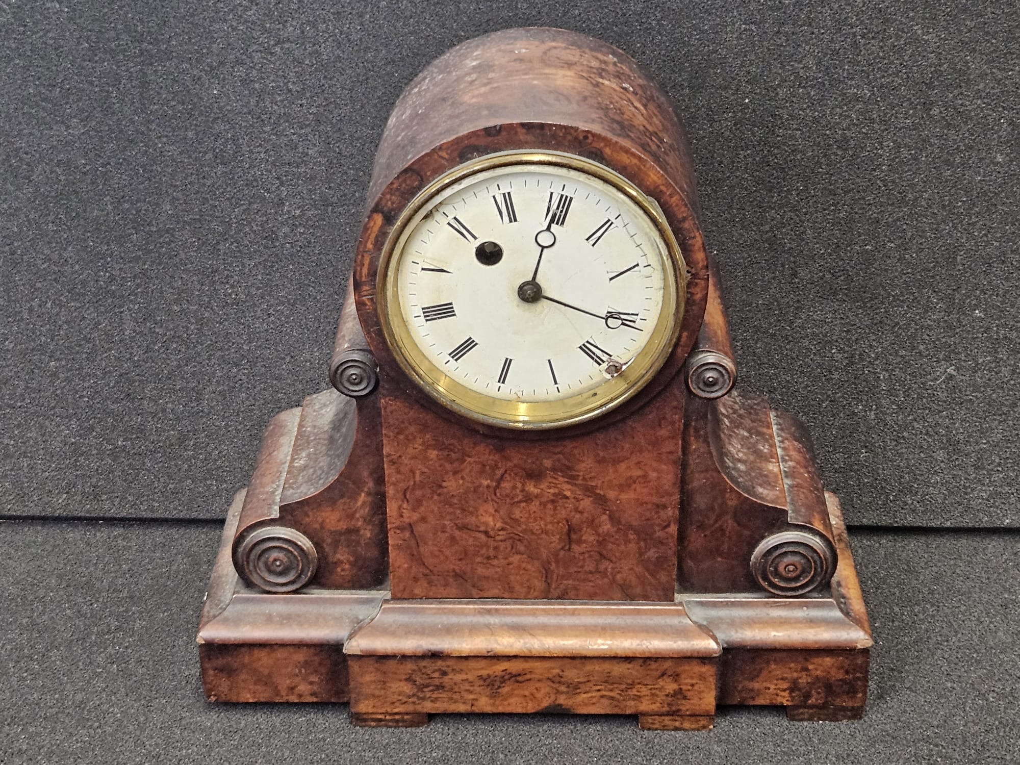 A 19th century walnut mantel clock , movement stamped R Fage, Paris. 26 cm High