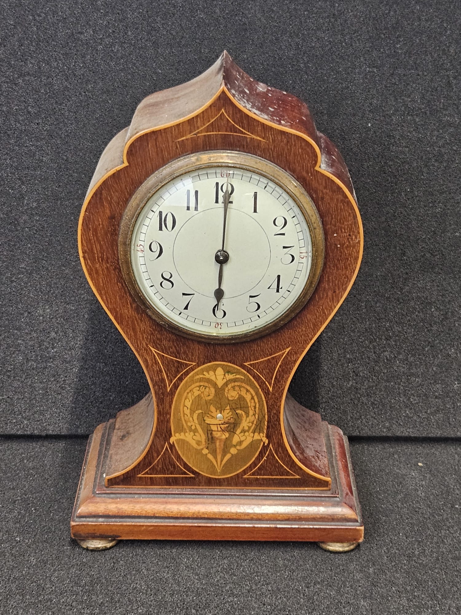 An Edwardian mahogany balloon clock having inlay decoration on brass bun feet. 25 cm high