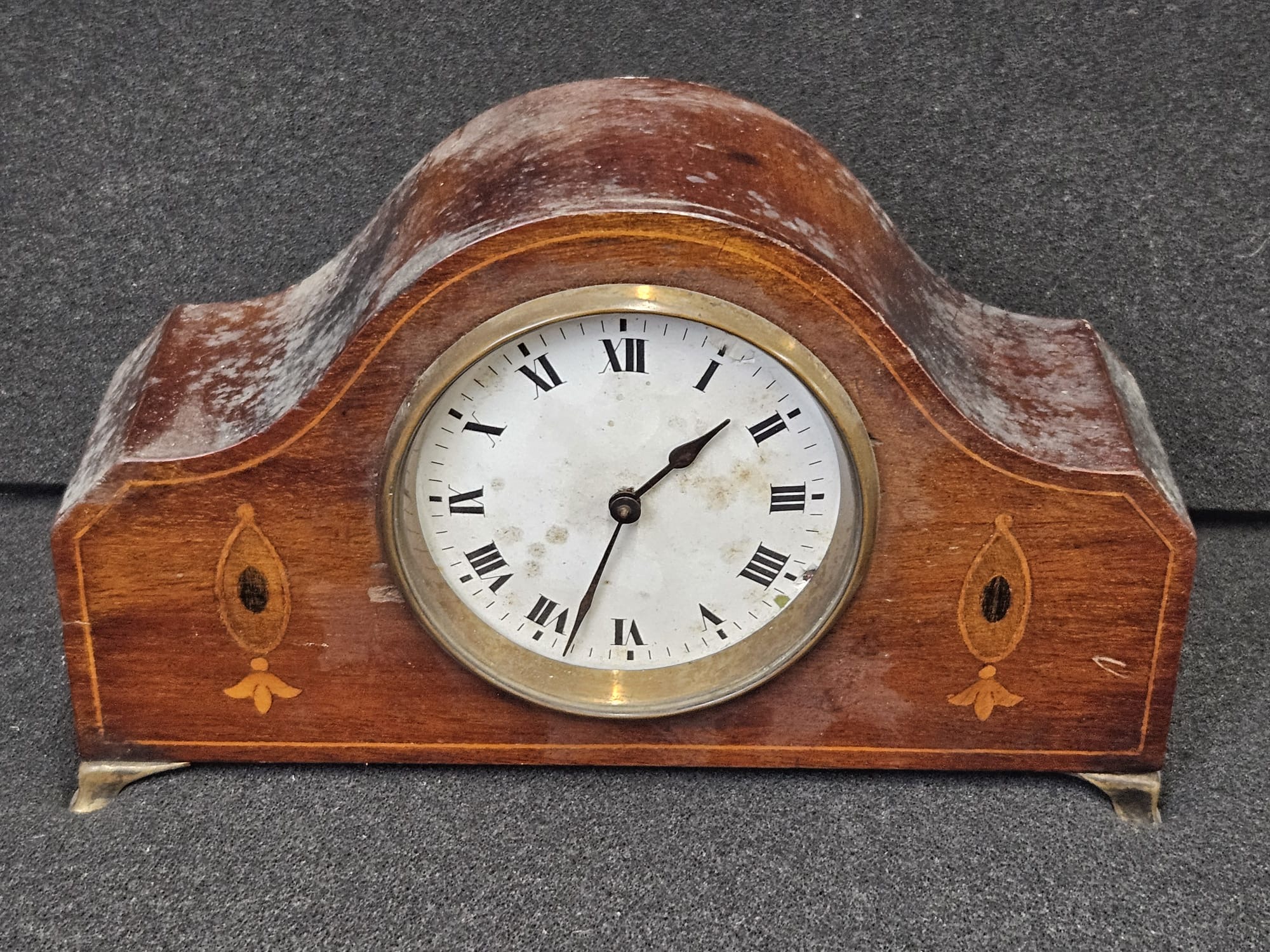 An Edwardian mantel clock having inlay decoration on brass bracket feet, missing glass. 15 cm high
