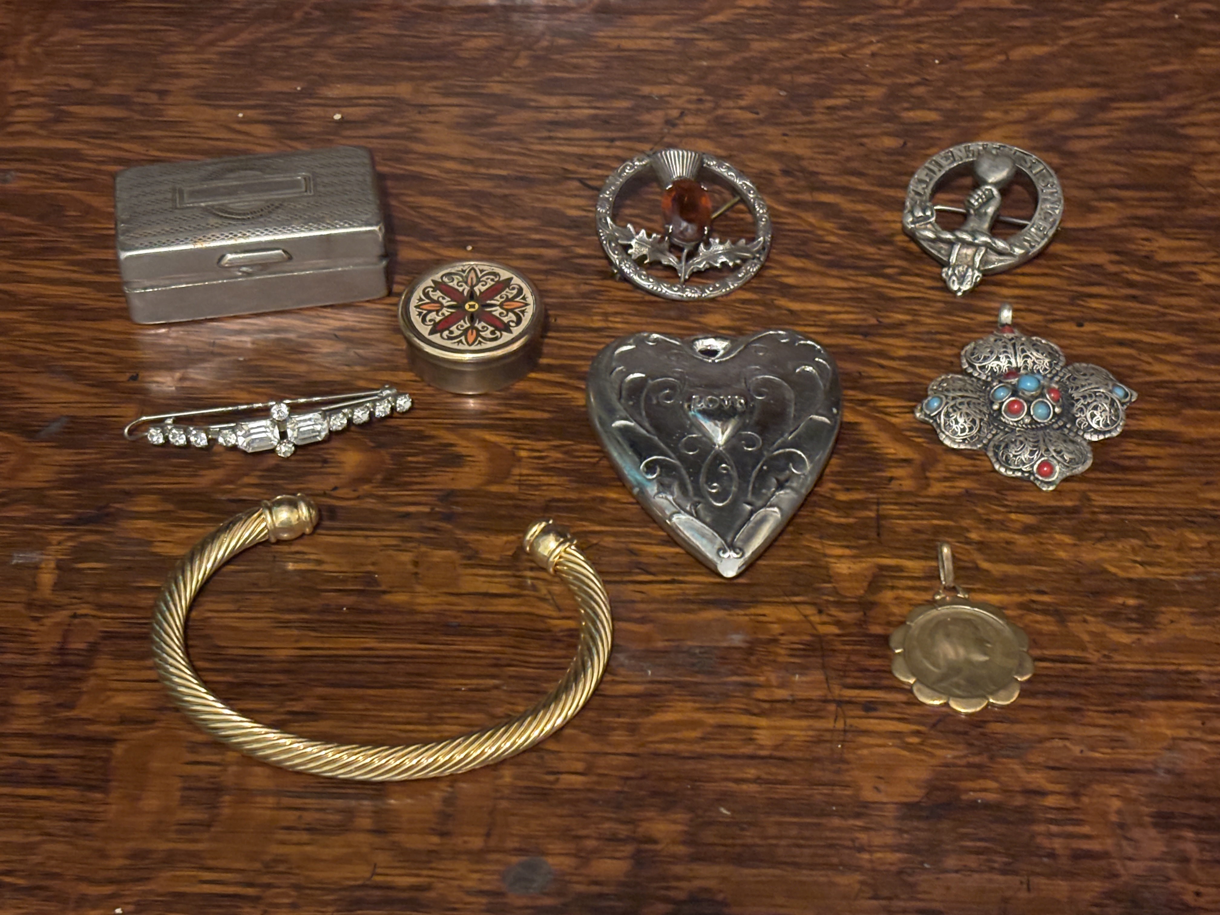 A mixed lot containing brooches, pill boxes and yellow metal medallion