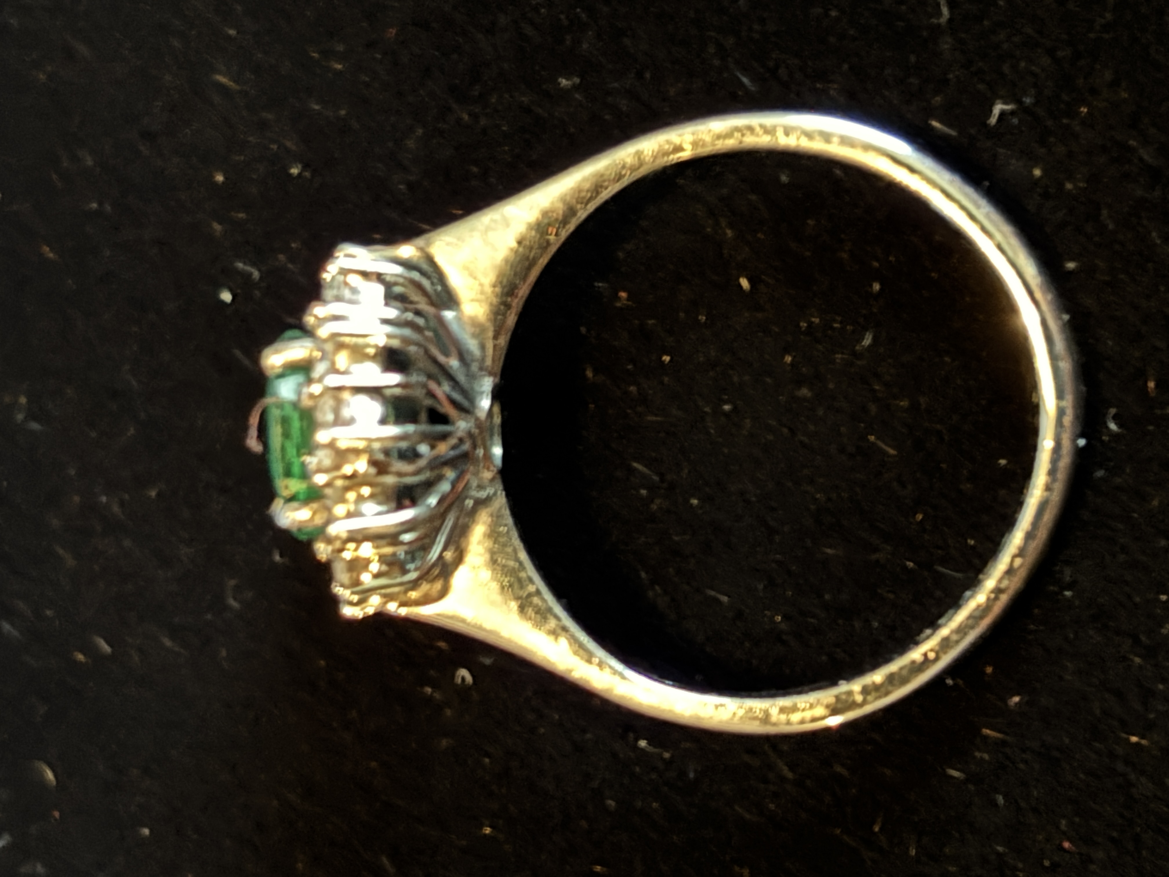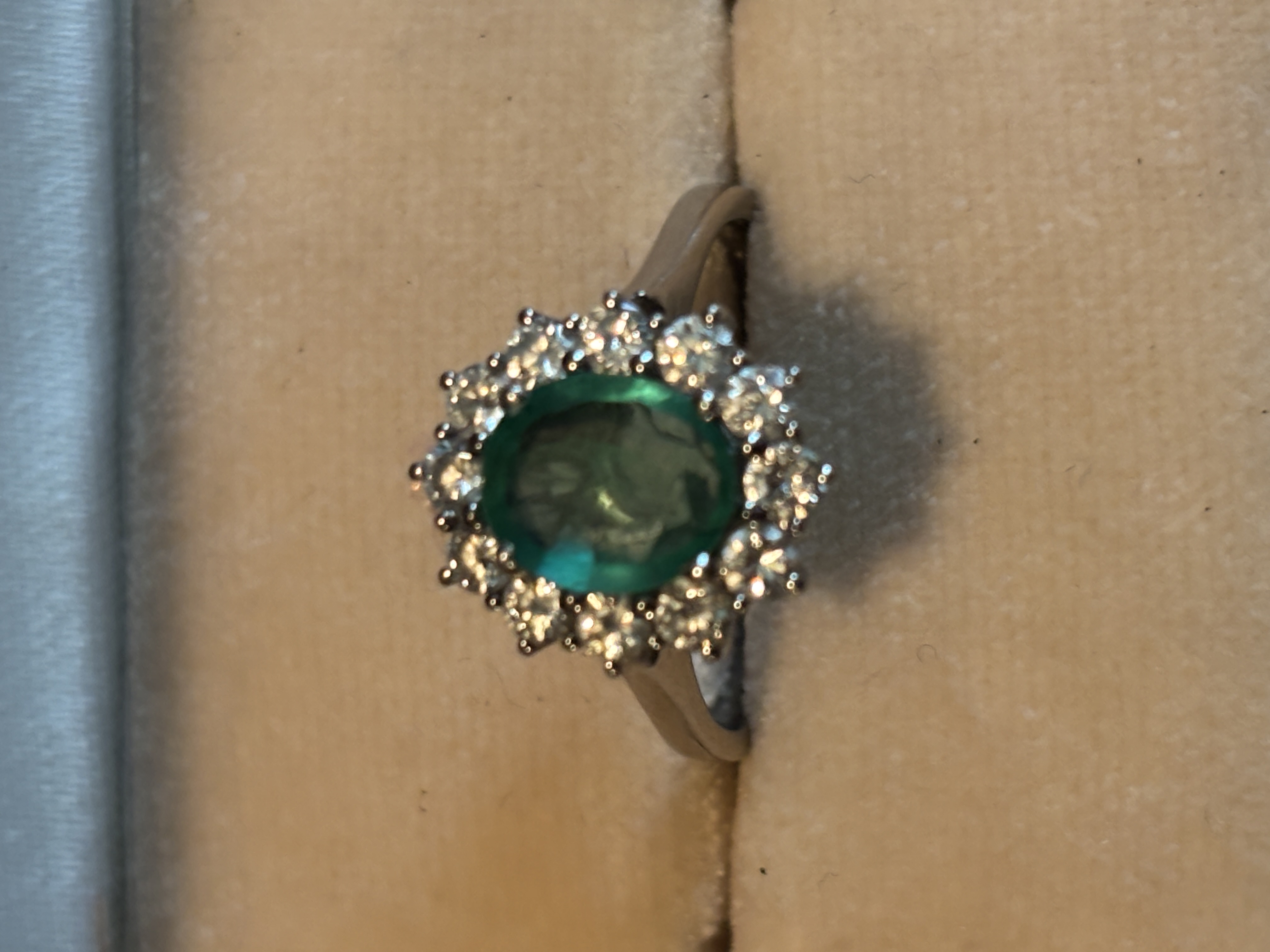 An 18ct gold white gold emerald and diamond ring size L. 12 diamonds approx 0.6 ct