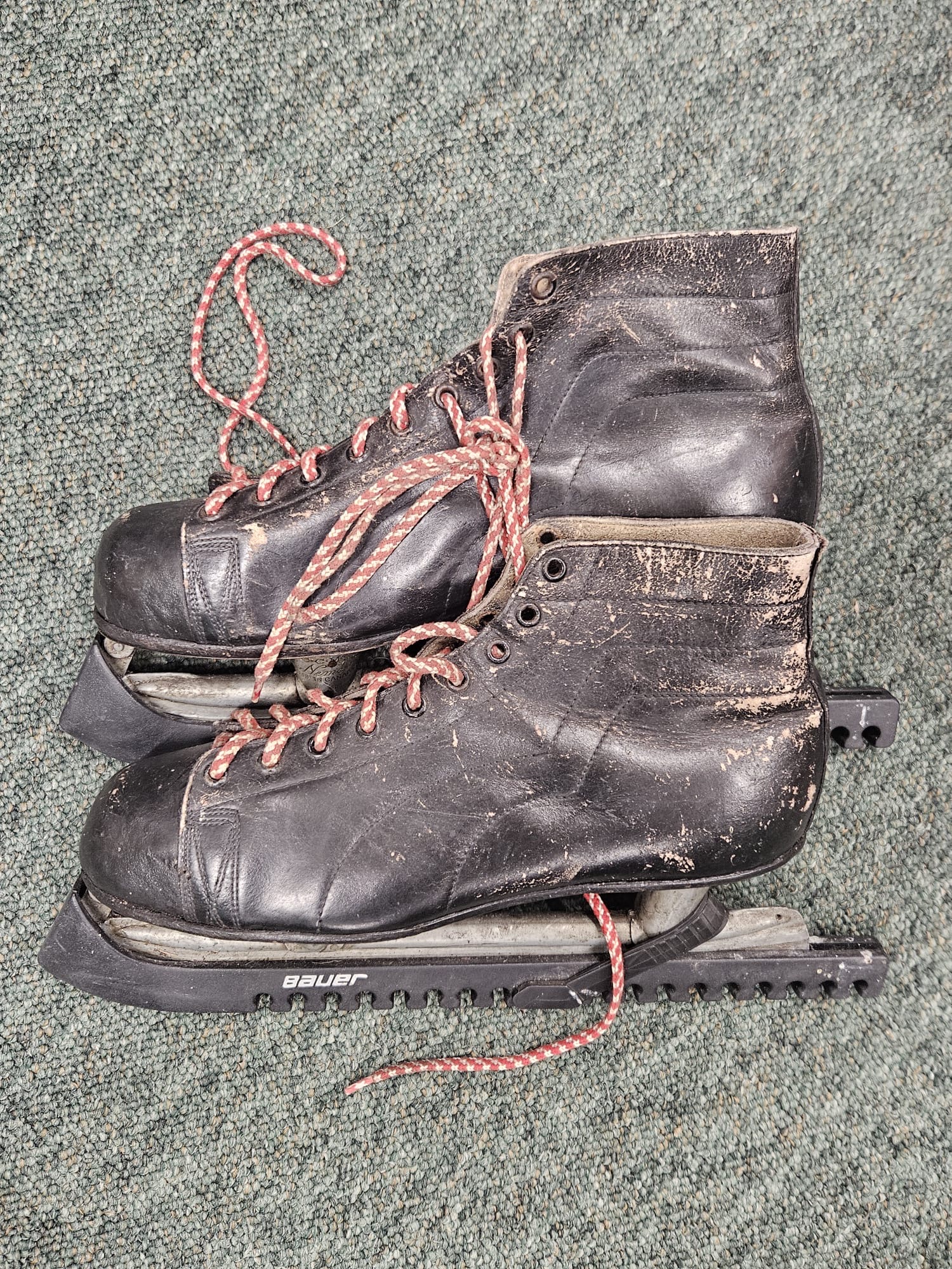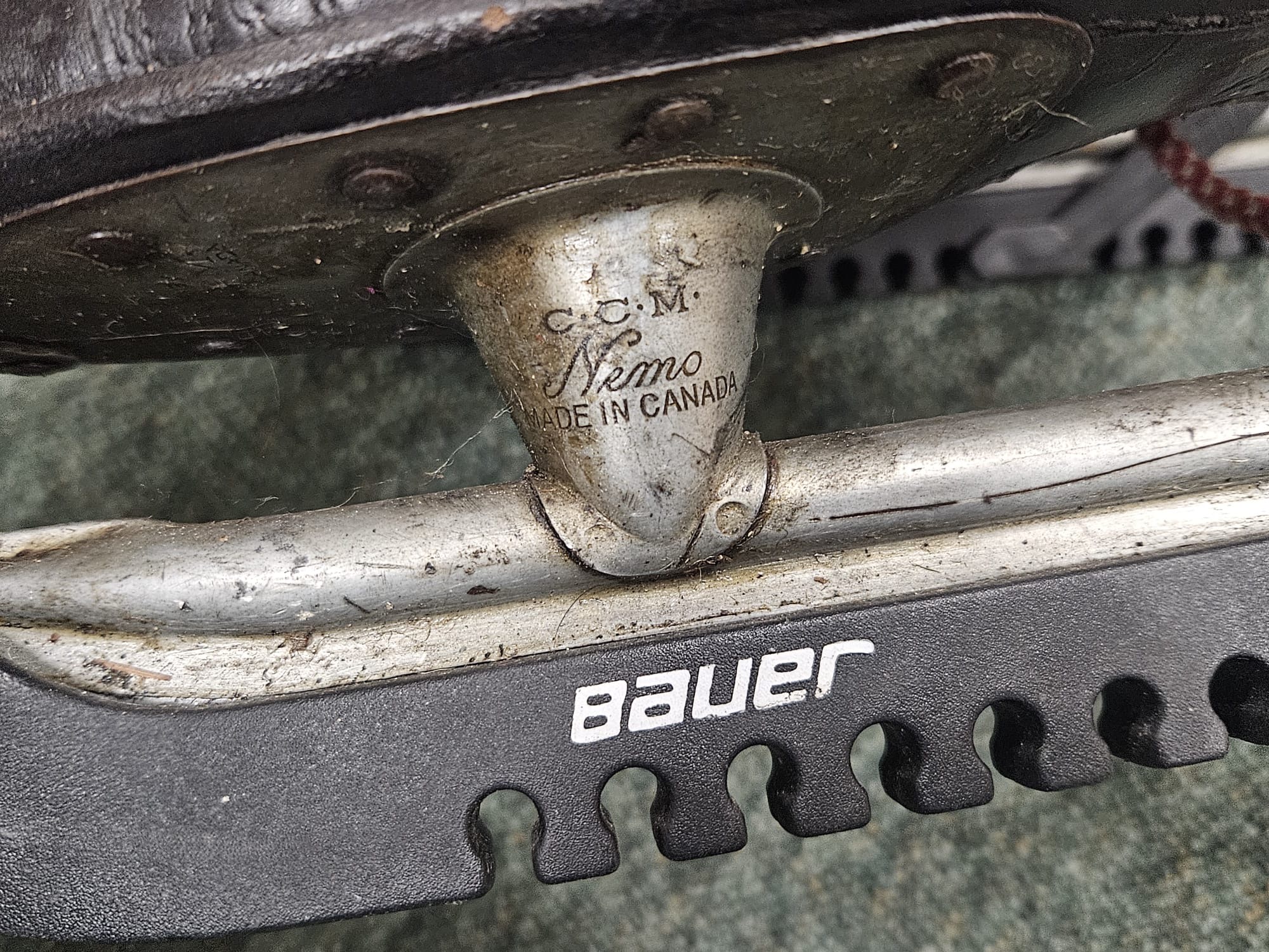 A pair of leather C.C.M. Nemo ice-skates with Bauer blades, Made in Canada