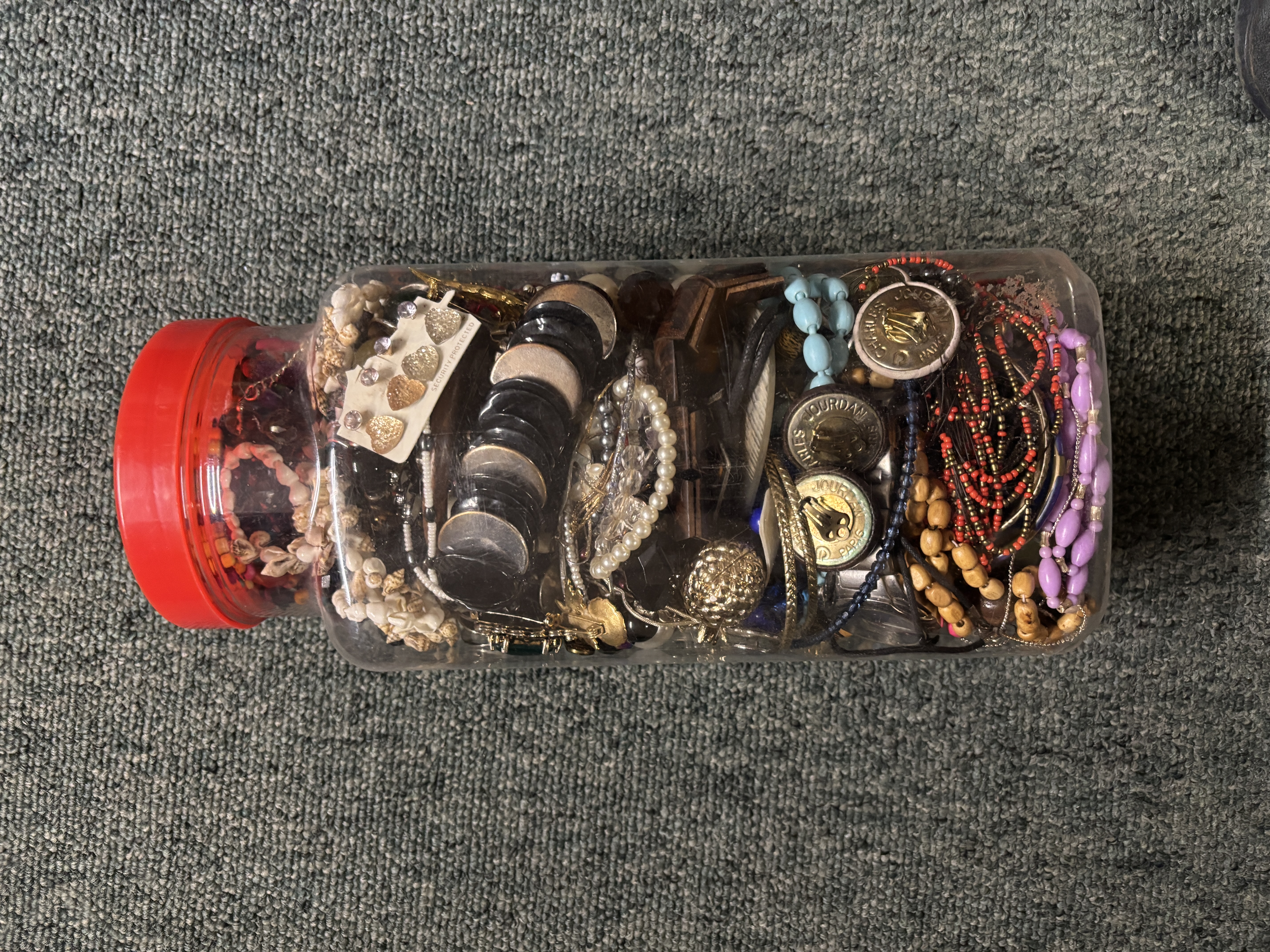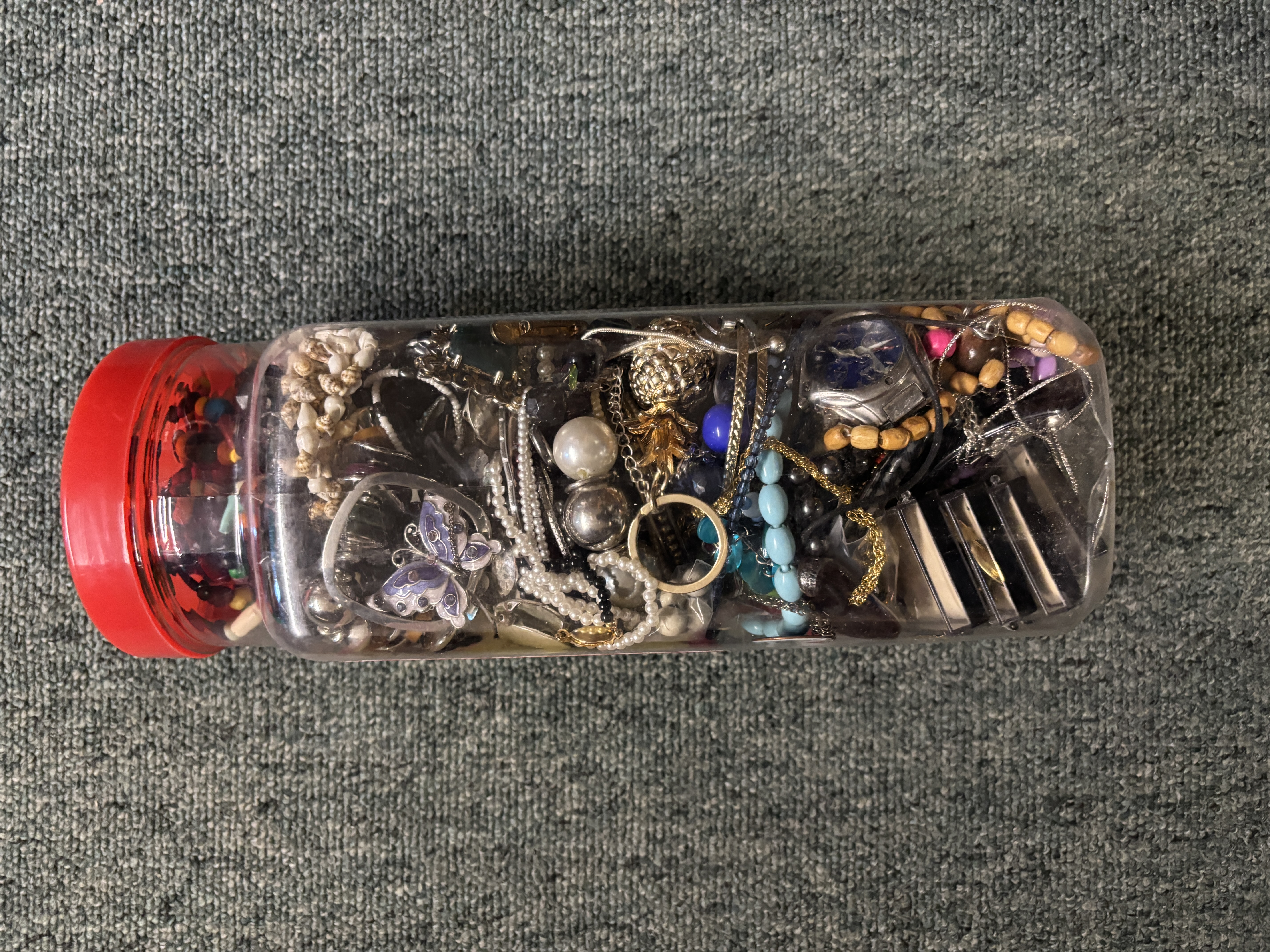 A plastic sweet jar containing a quantity of costume jewellery