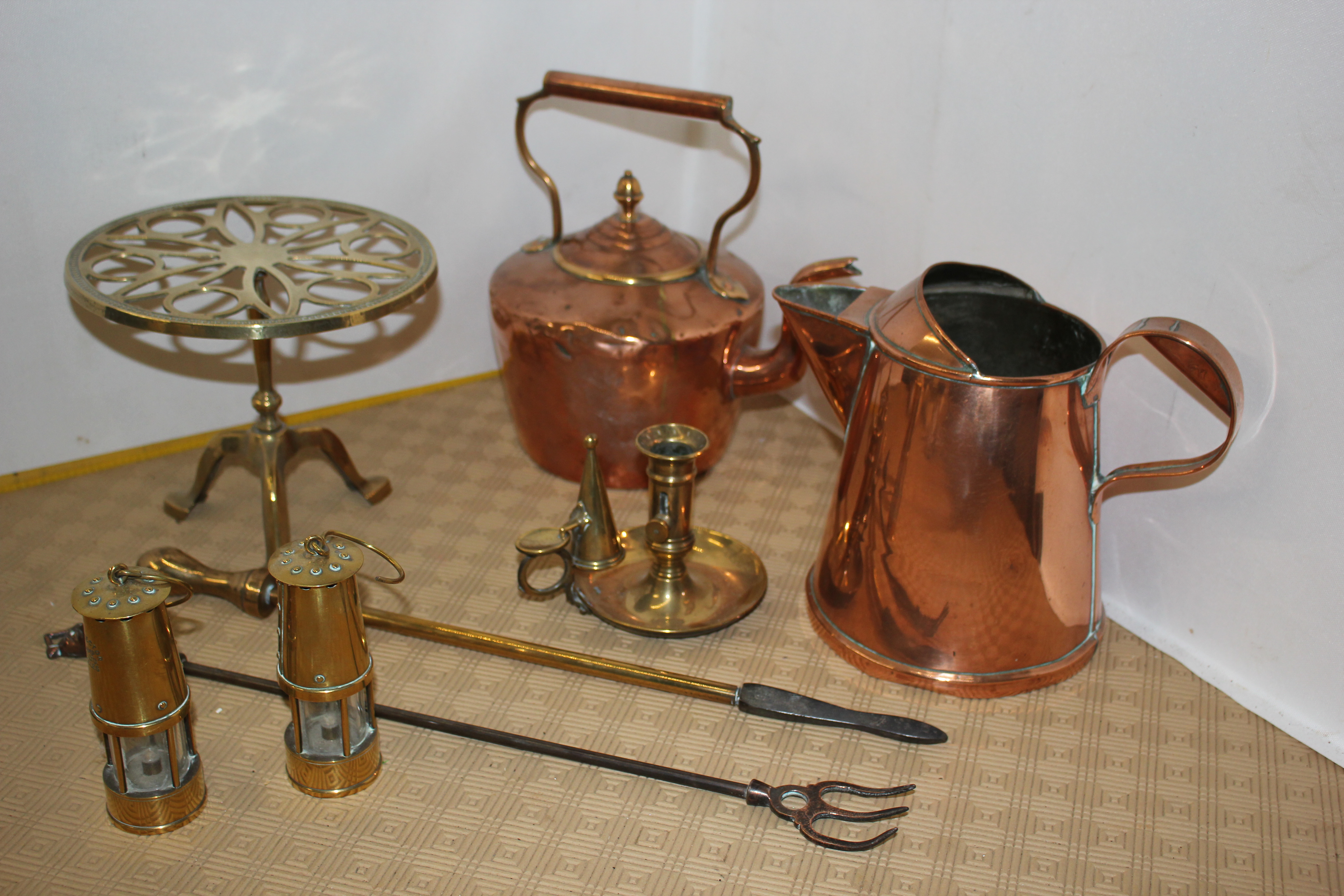 A selection of brass and copper pots, trivet, lamps, chamber stick etc.
