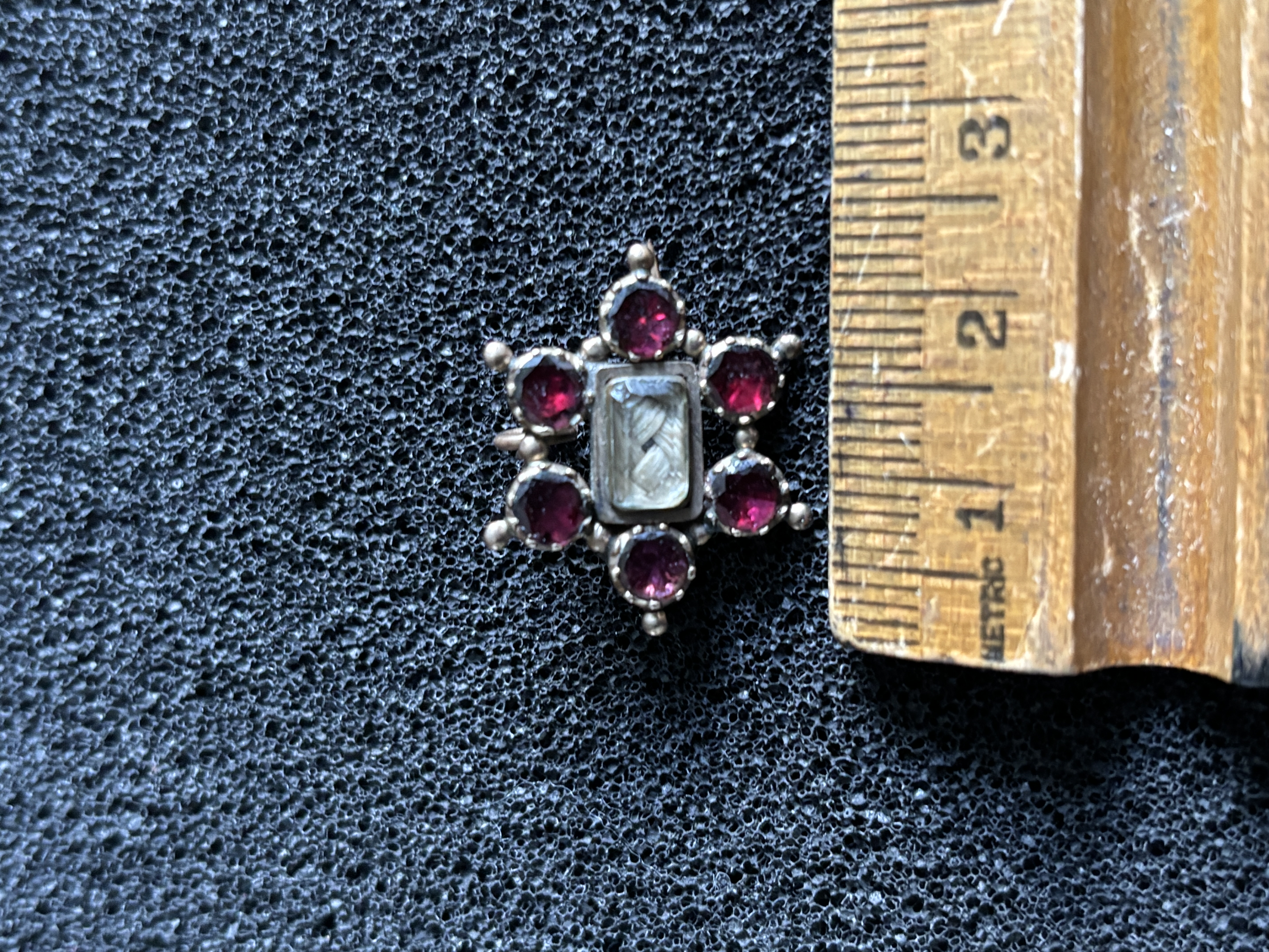 An antique mourning brooch / pendant with six garnets surrounding an inset panel containing a lock of hair weighing 2 gm