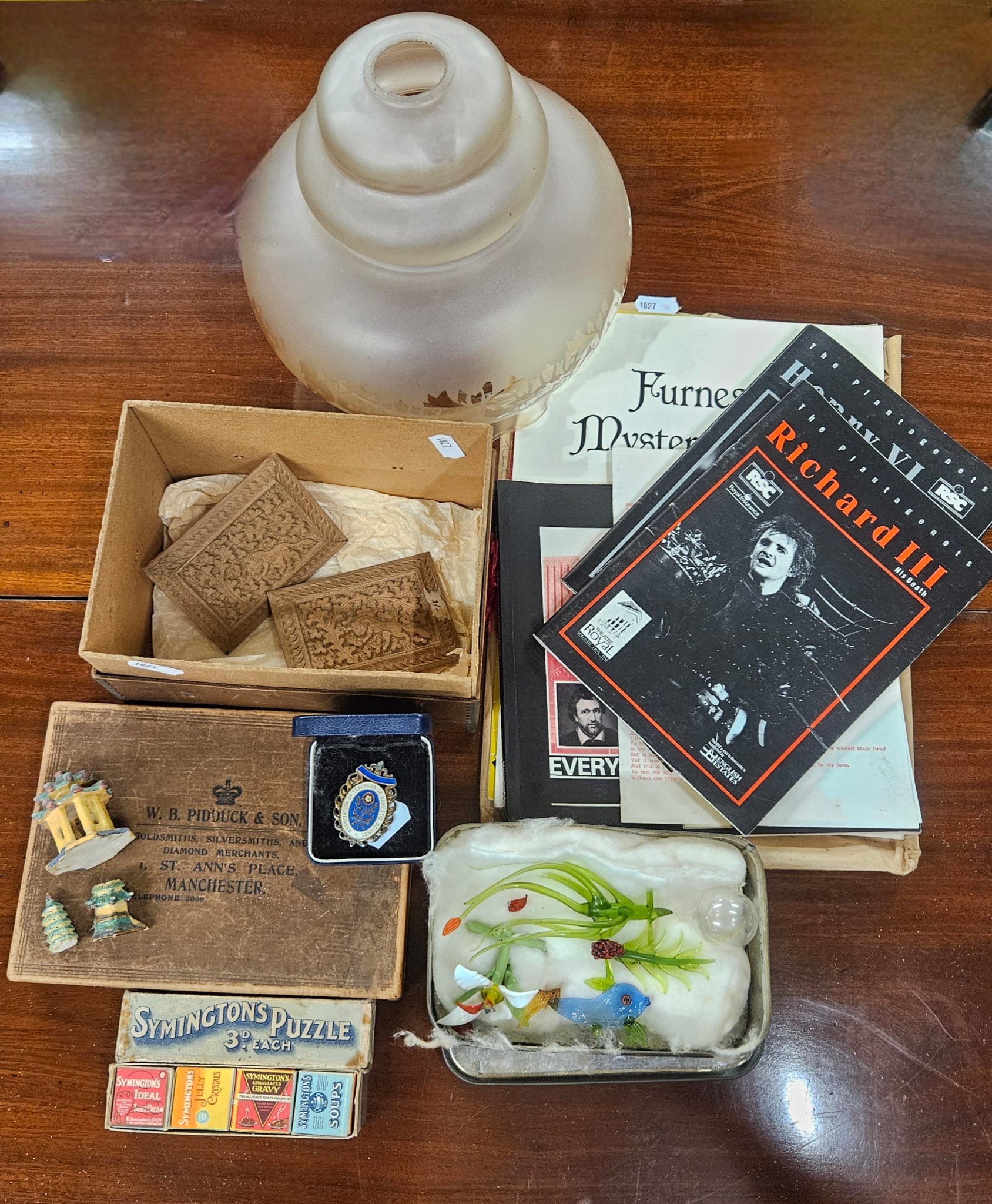 A Diverse Collection of Decorative Arts, Ephemera, and Curiosities, including a Frosted Glass Lamp Shade and a W. B. Pidduck & Son Box