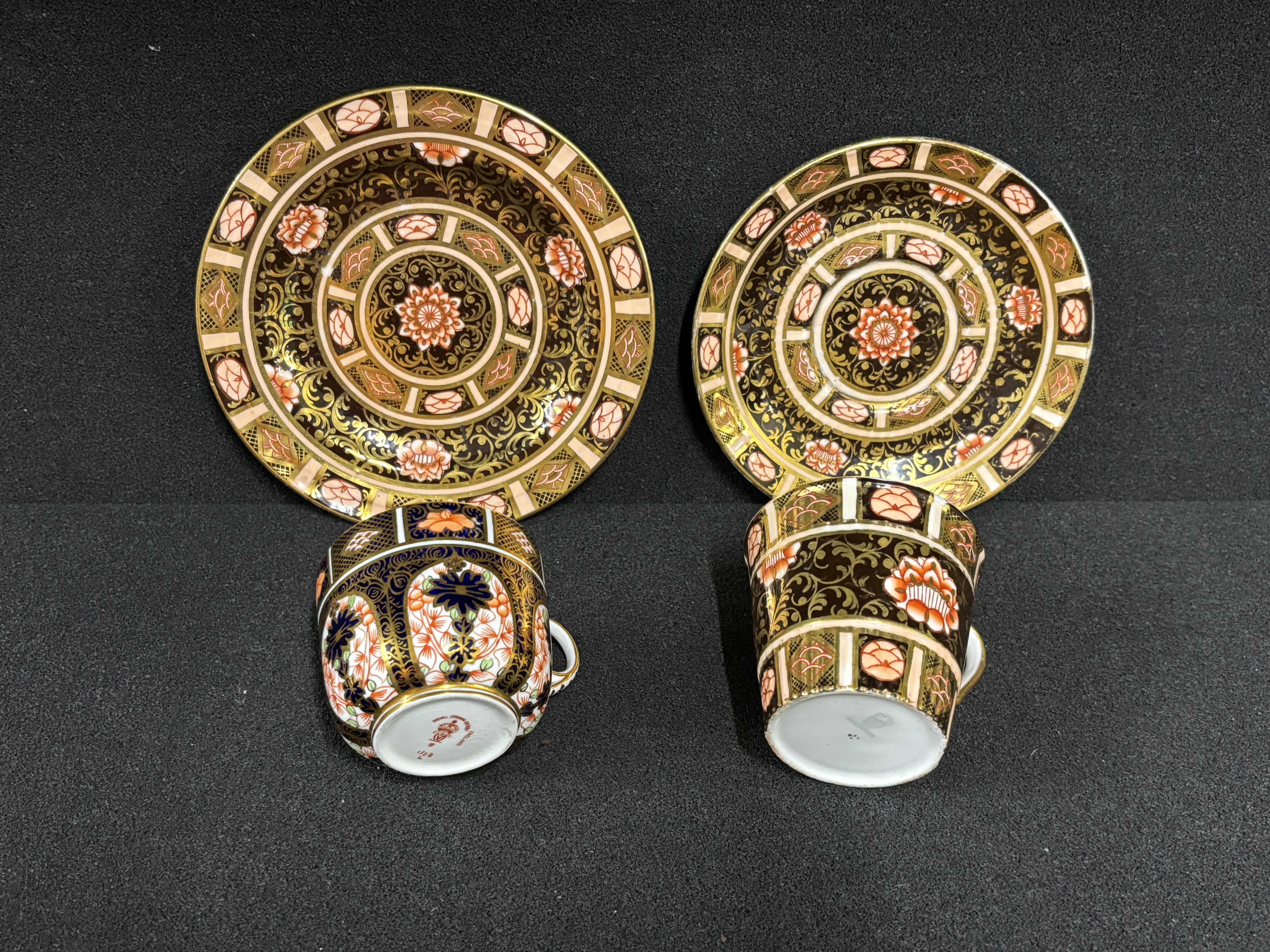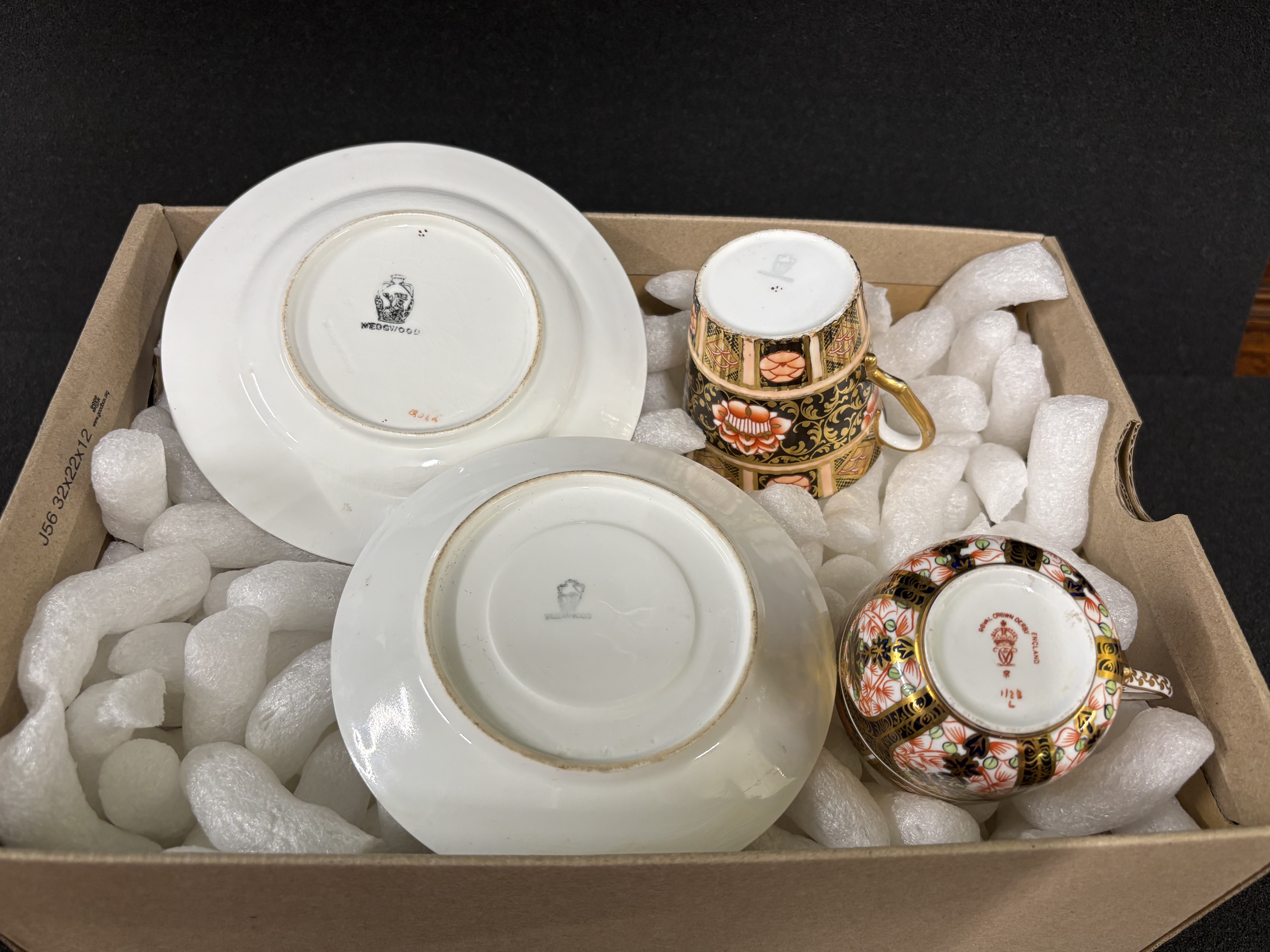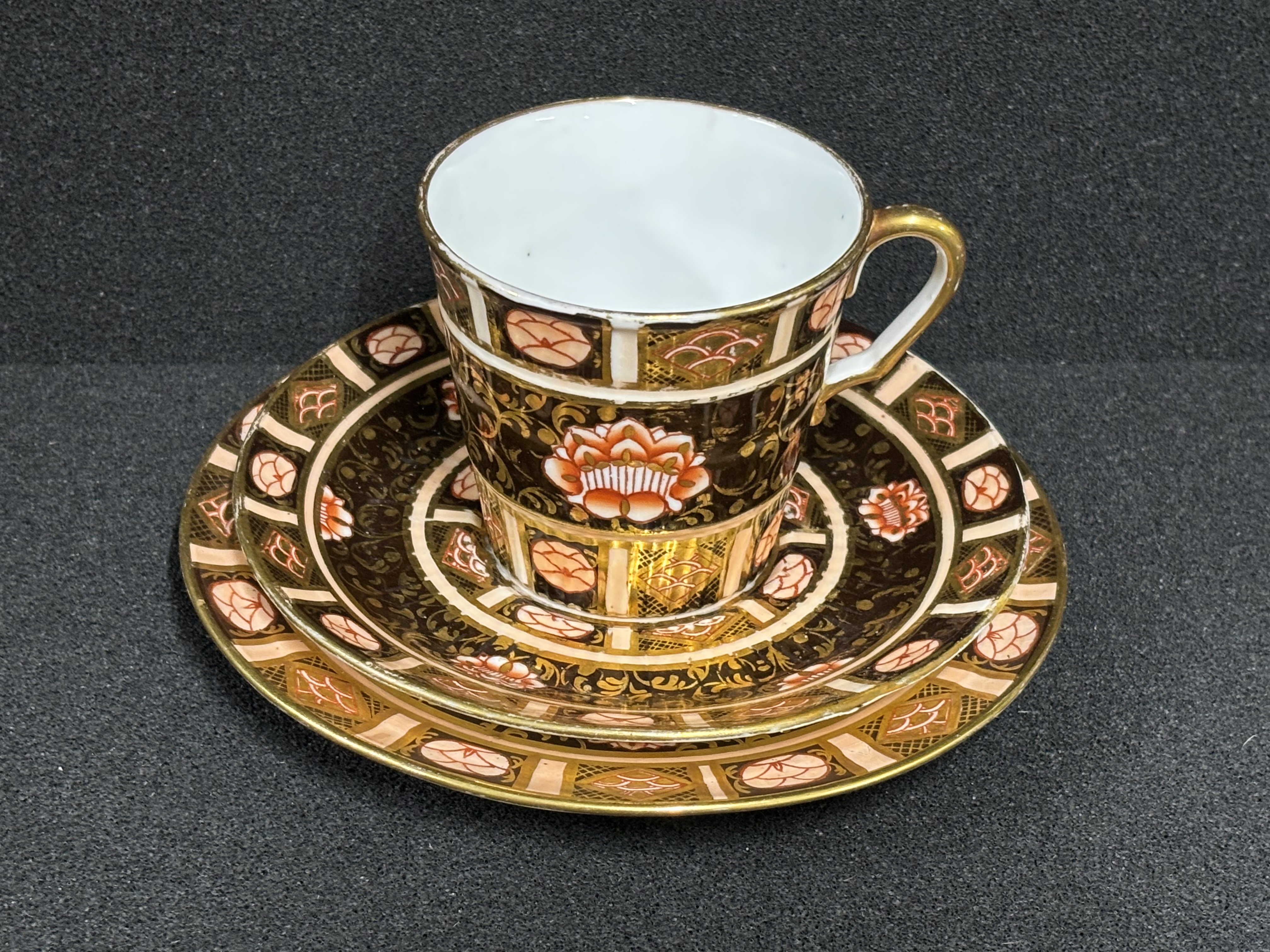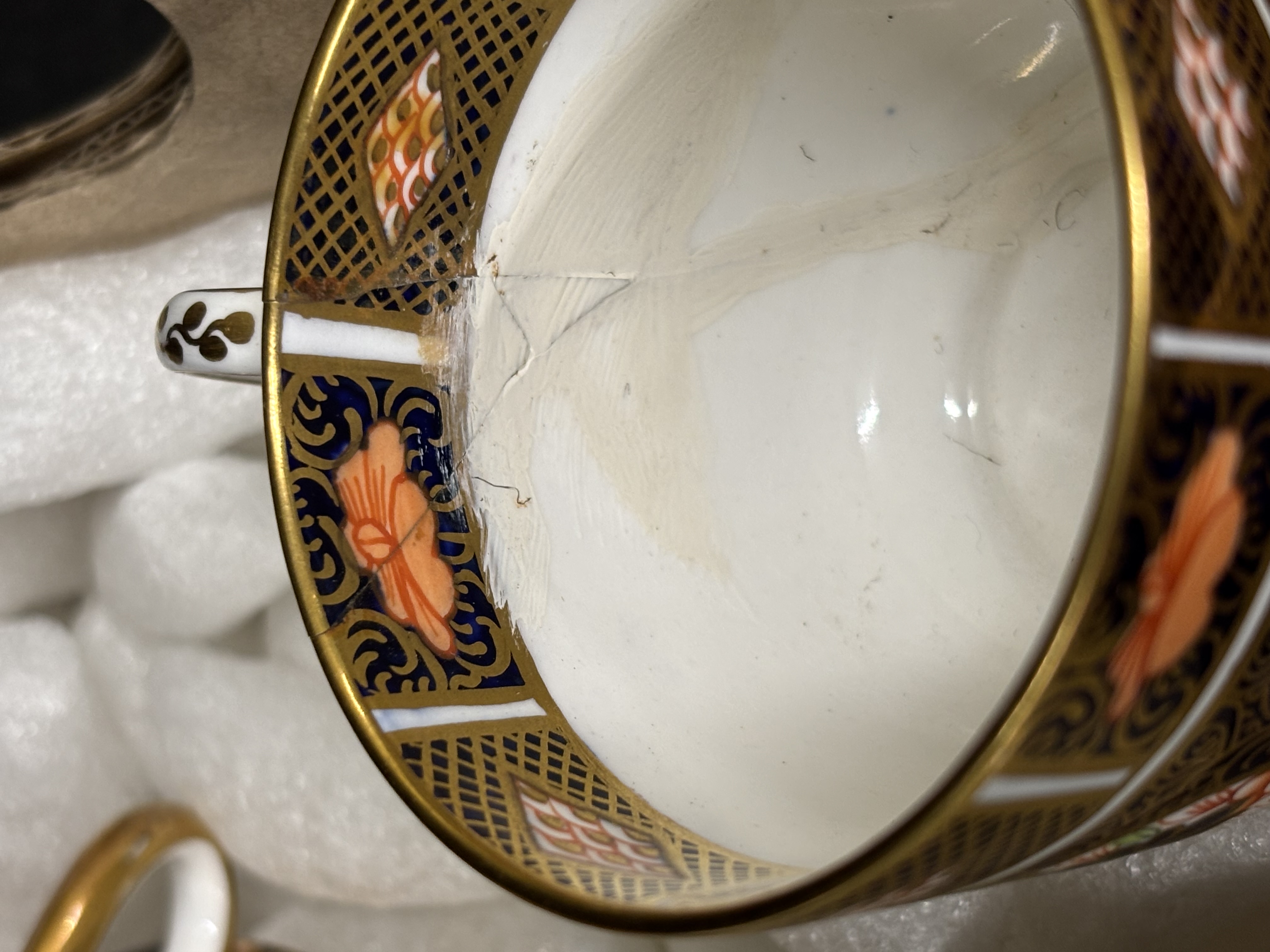A Wedgwood Imari trio together with a Royal crown Derby cup (a/f)