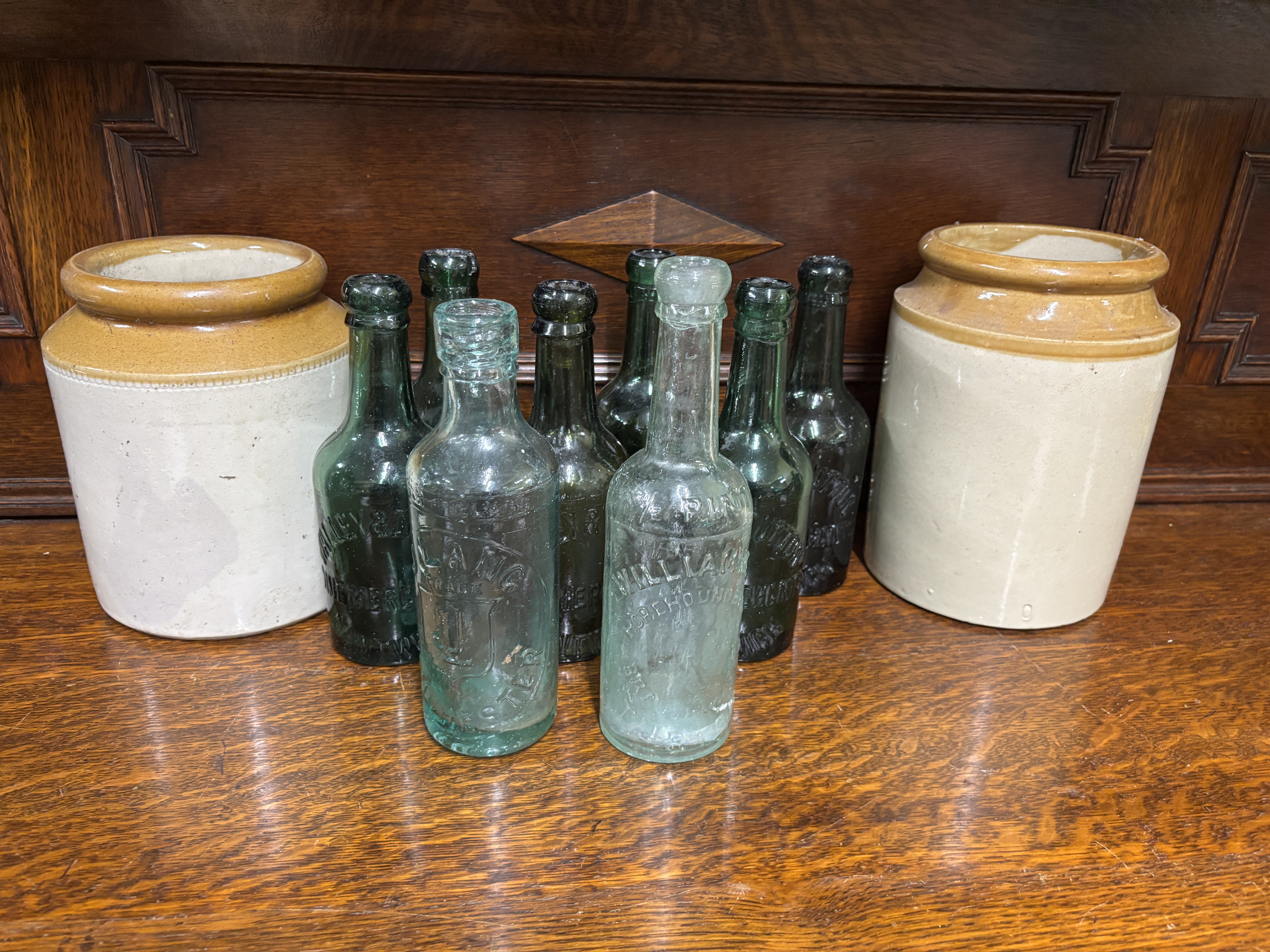 Two stoneware jars together with six green glass bottles from Waller & Dutton (Nantwich) , and two clear bottles from J Lang (Manchester) and William Hall (Turton)