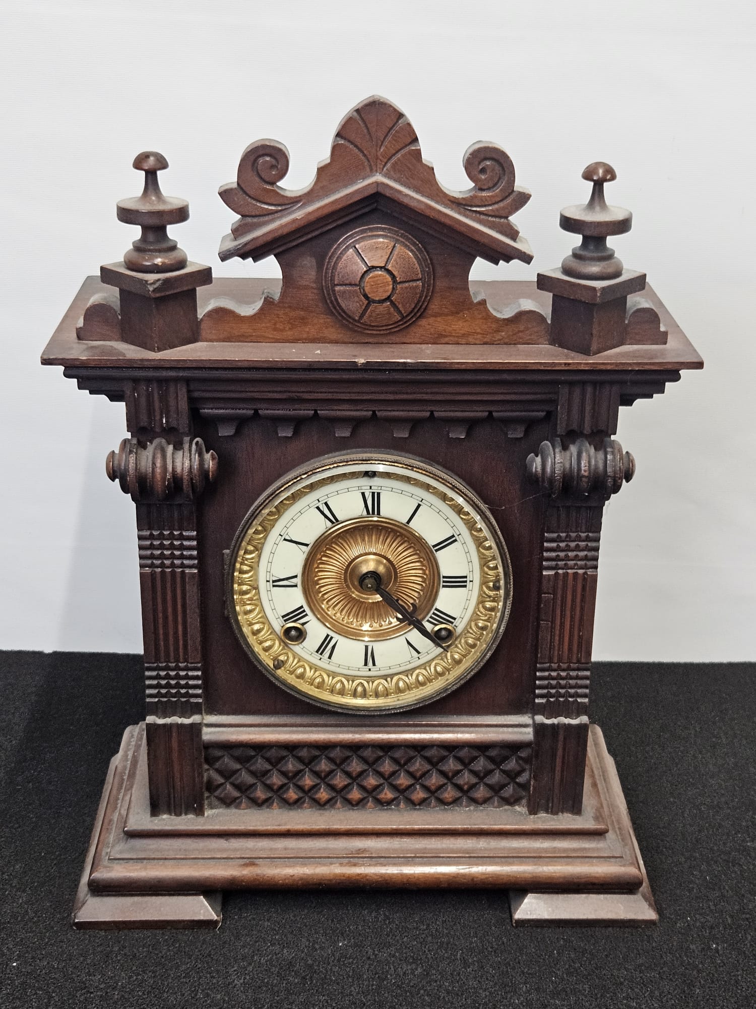 A late 19th century Ansonia of New York, Mantel / Bracket clock having crest and spindle decoration with an eight day Salem strike. 38 cm high