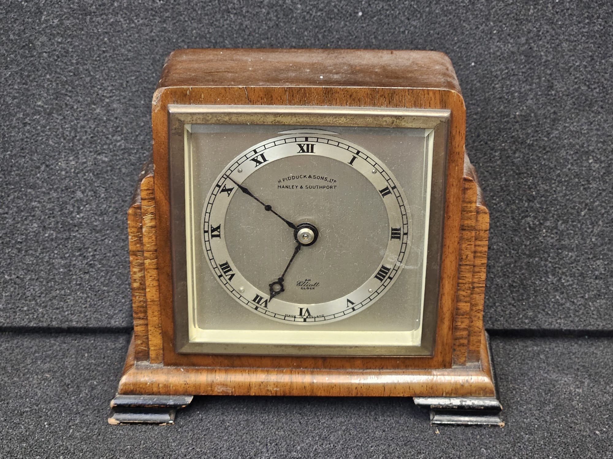 An English Art Deco Elliott Mantel clock retailed by Pidduck & Sons, Hanley and Southport, having bracket feet. 14 cm high
