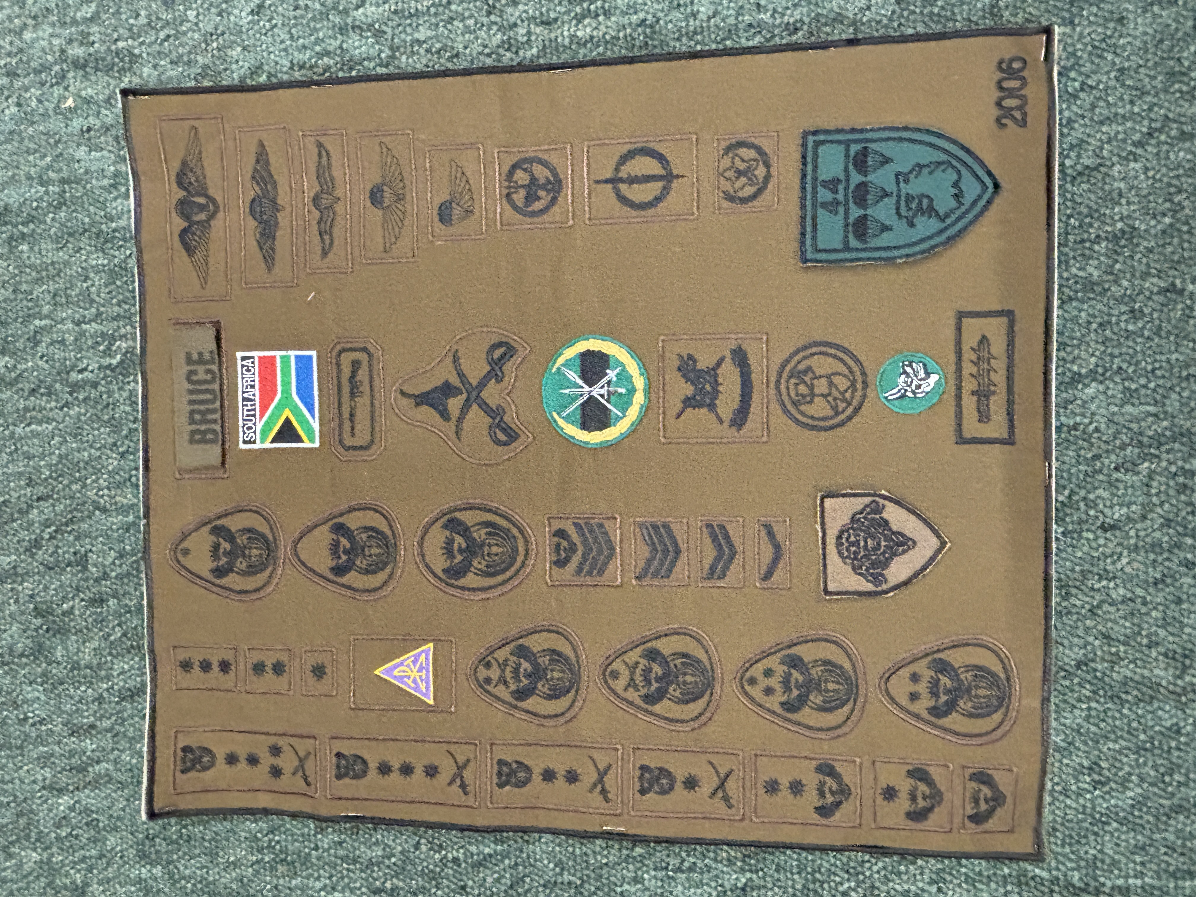 An embroidered display of South African Badges (2006) measuring 48 x 40 cm