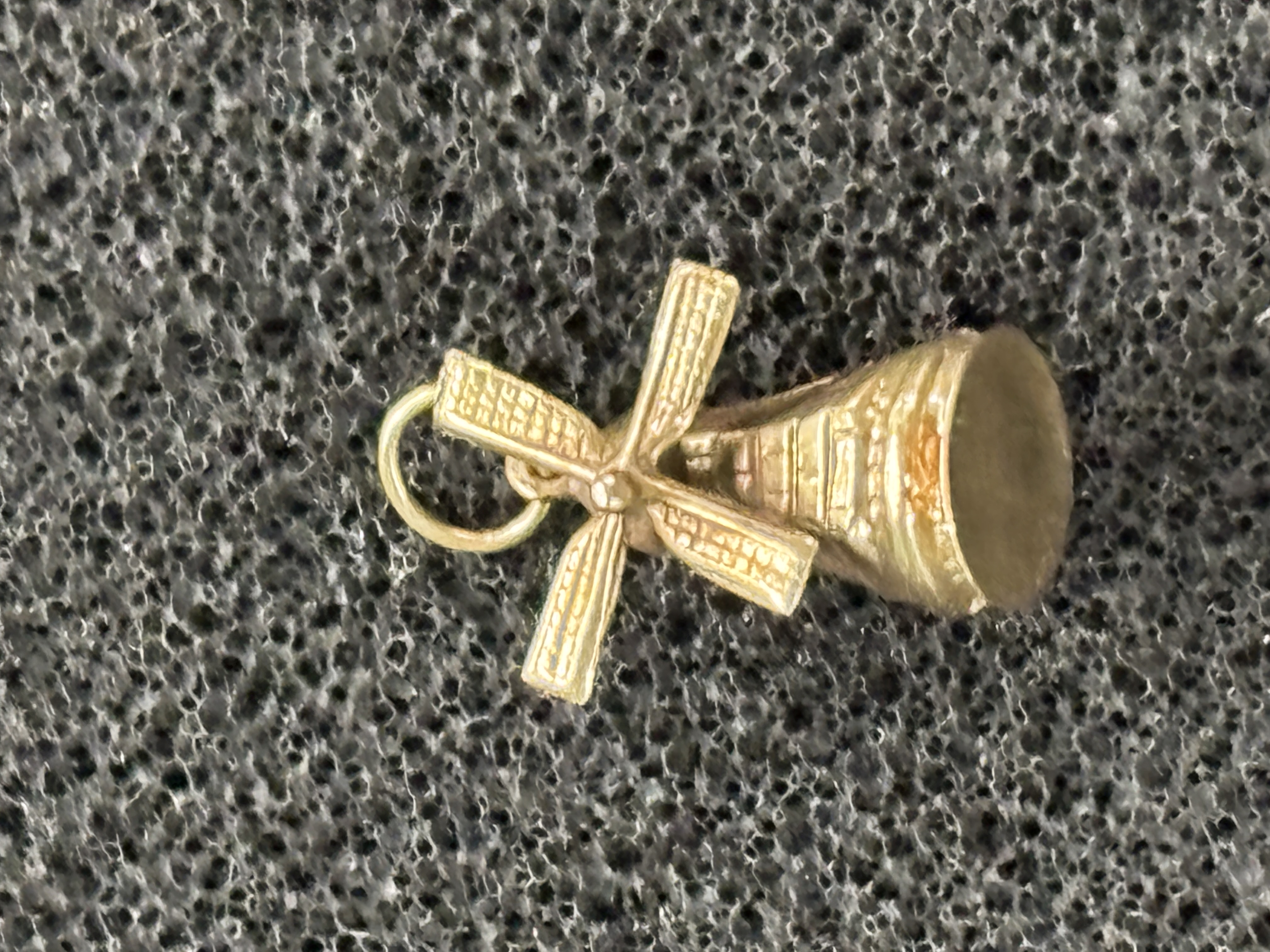 A miniature 14ct gold charm or pendant depicting a stylized windmill with moving sails which weighs 0.71 gram