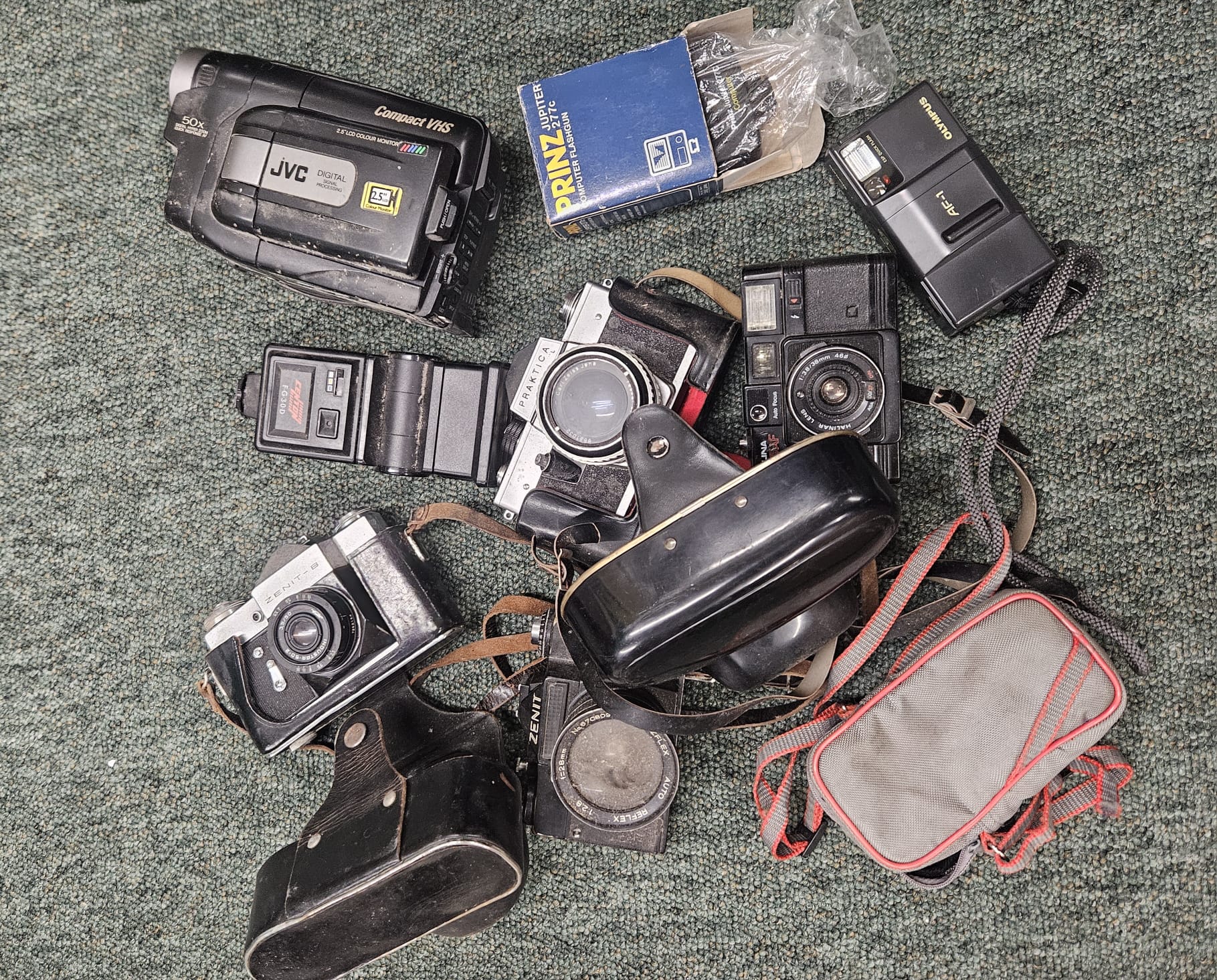 Two Zenit cameras, a Praktika camera a JVC Compact VHS recorder, flash guns etc