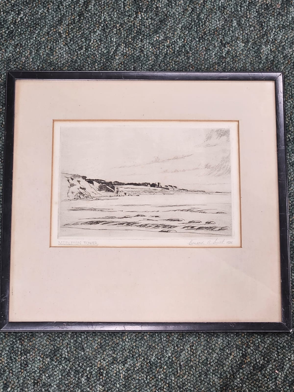 An etching by Leonard A. Smith titled ‘Middleton Tower’ and dated 1924. 36×38 cm