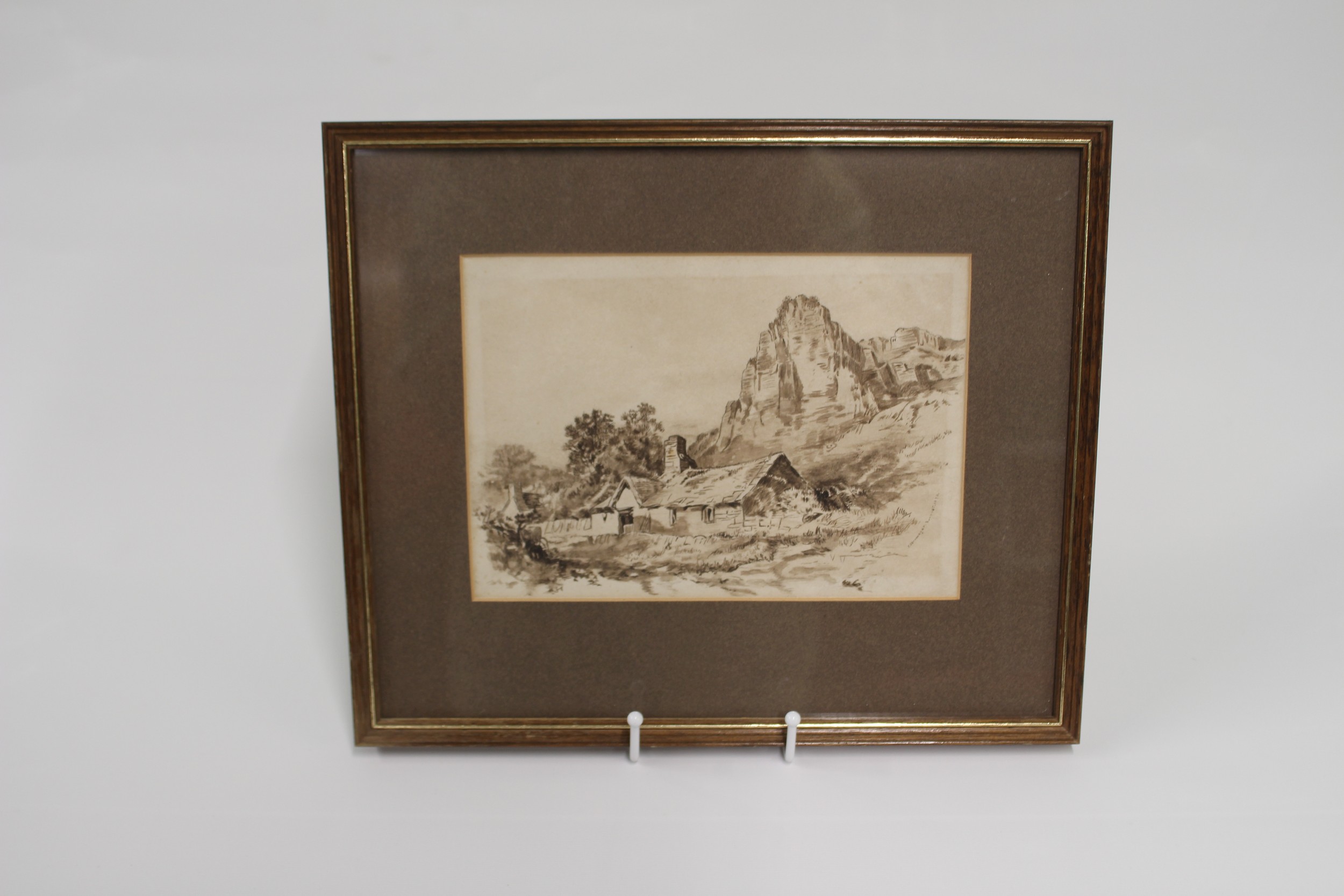 A sepia watercolour, Stromyer, Continental landscape, signed and...