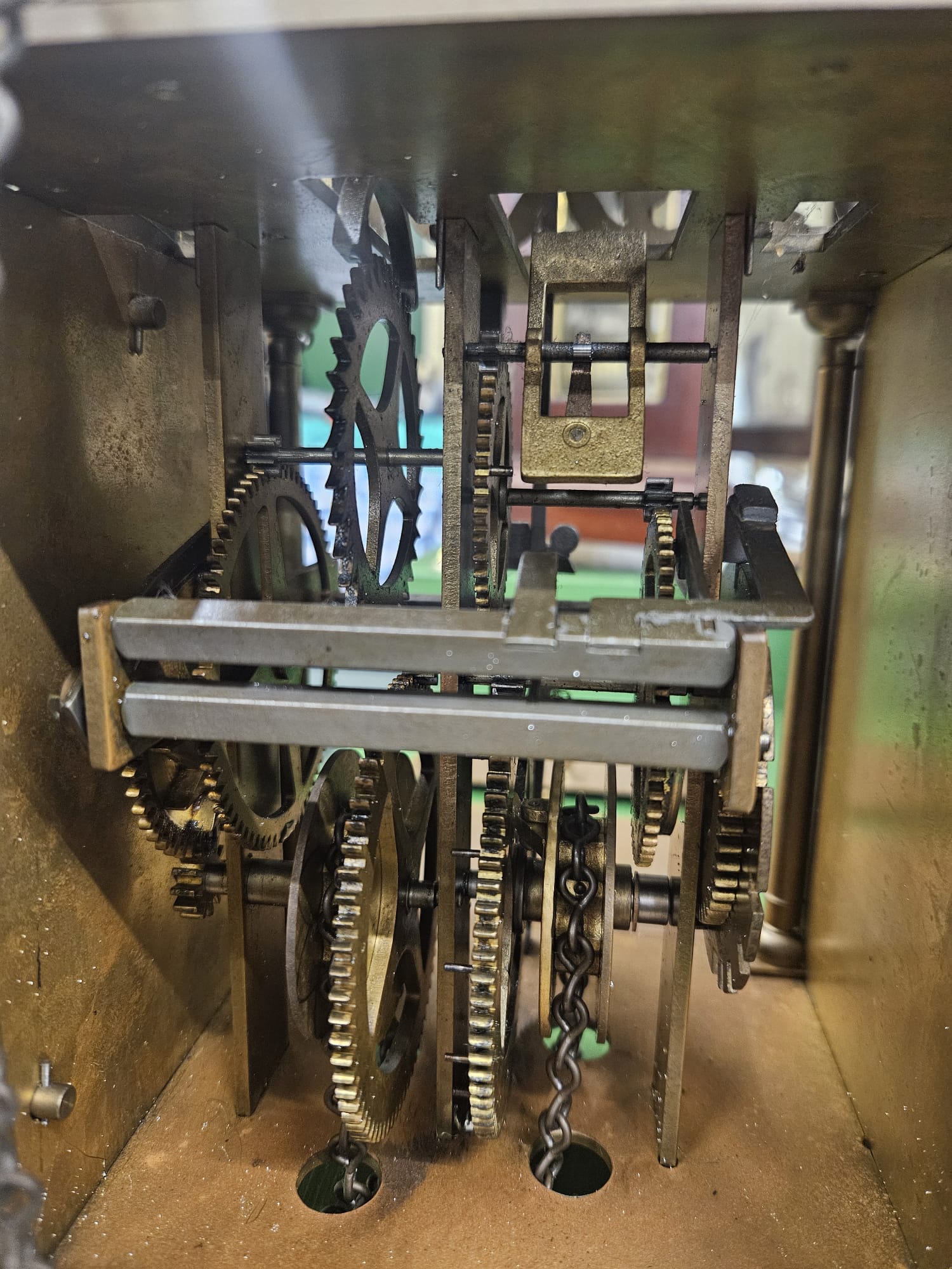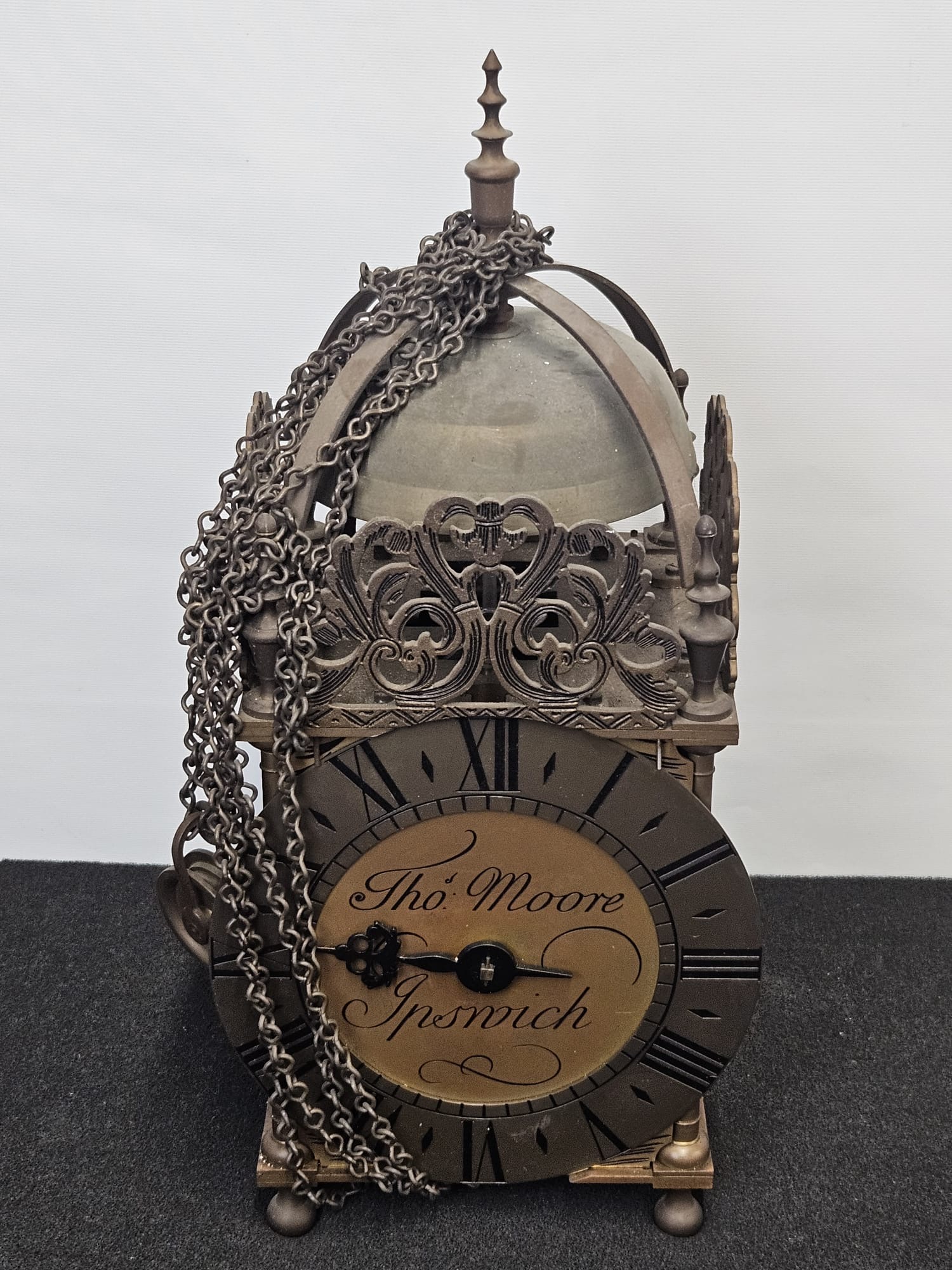 A reproduction brass lantern clock of traditional design bearing the name Thomas Moore, Ipswich. 38 cm High