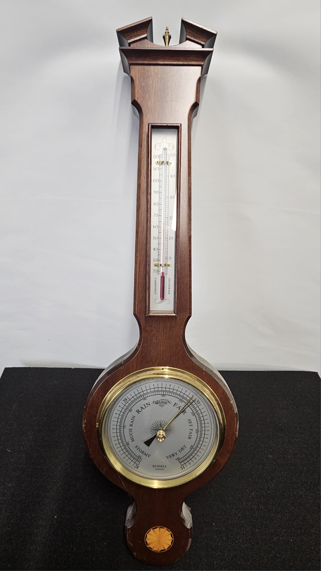 A reproduction, mahogany cased banjo aneroid barometer by Russell, Norwich. 68 cm High