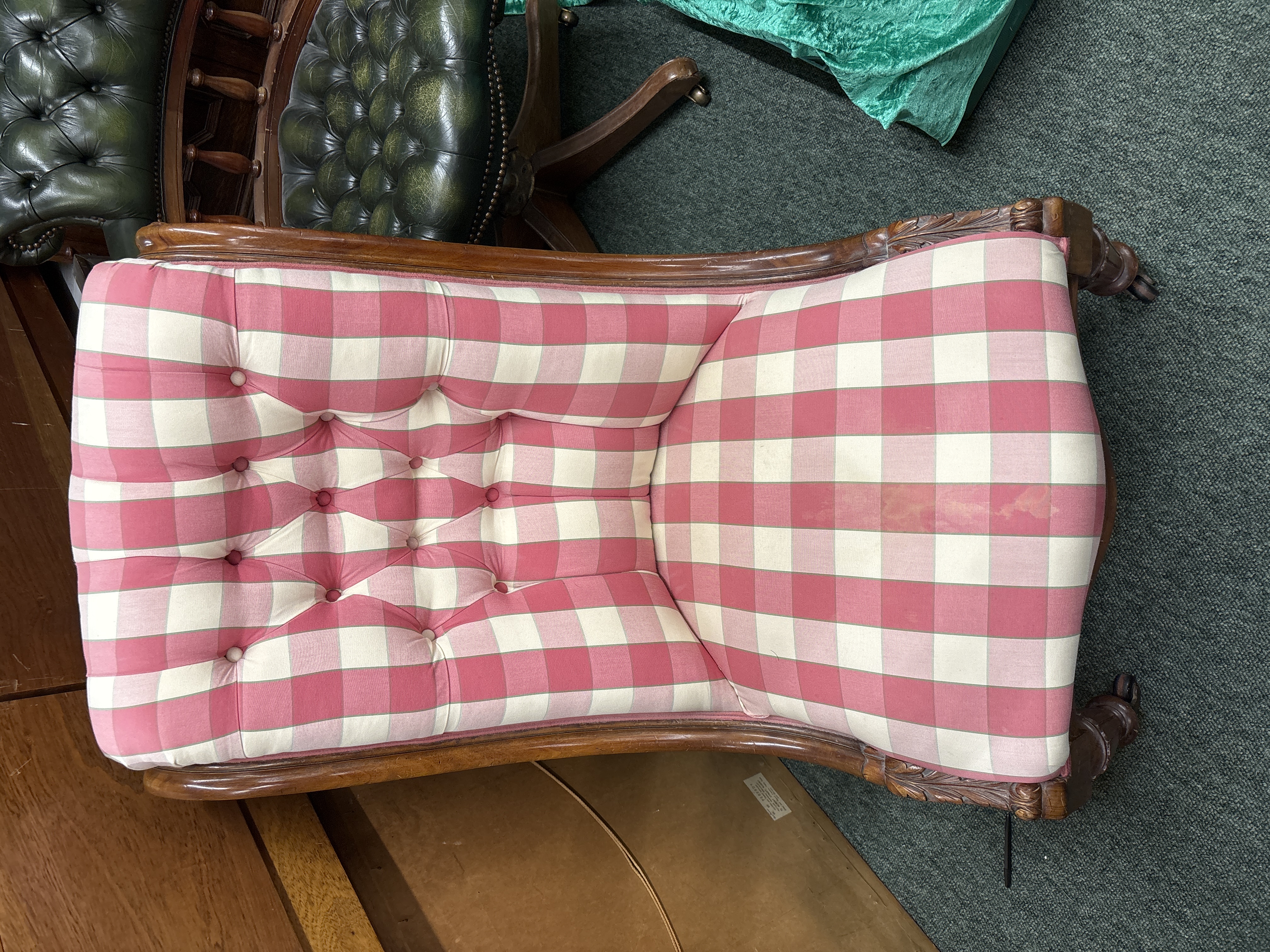A Victorian nursing chair having later, check upholstery. On castors.