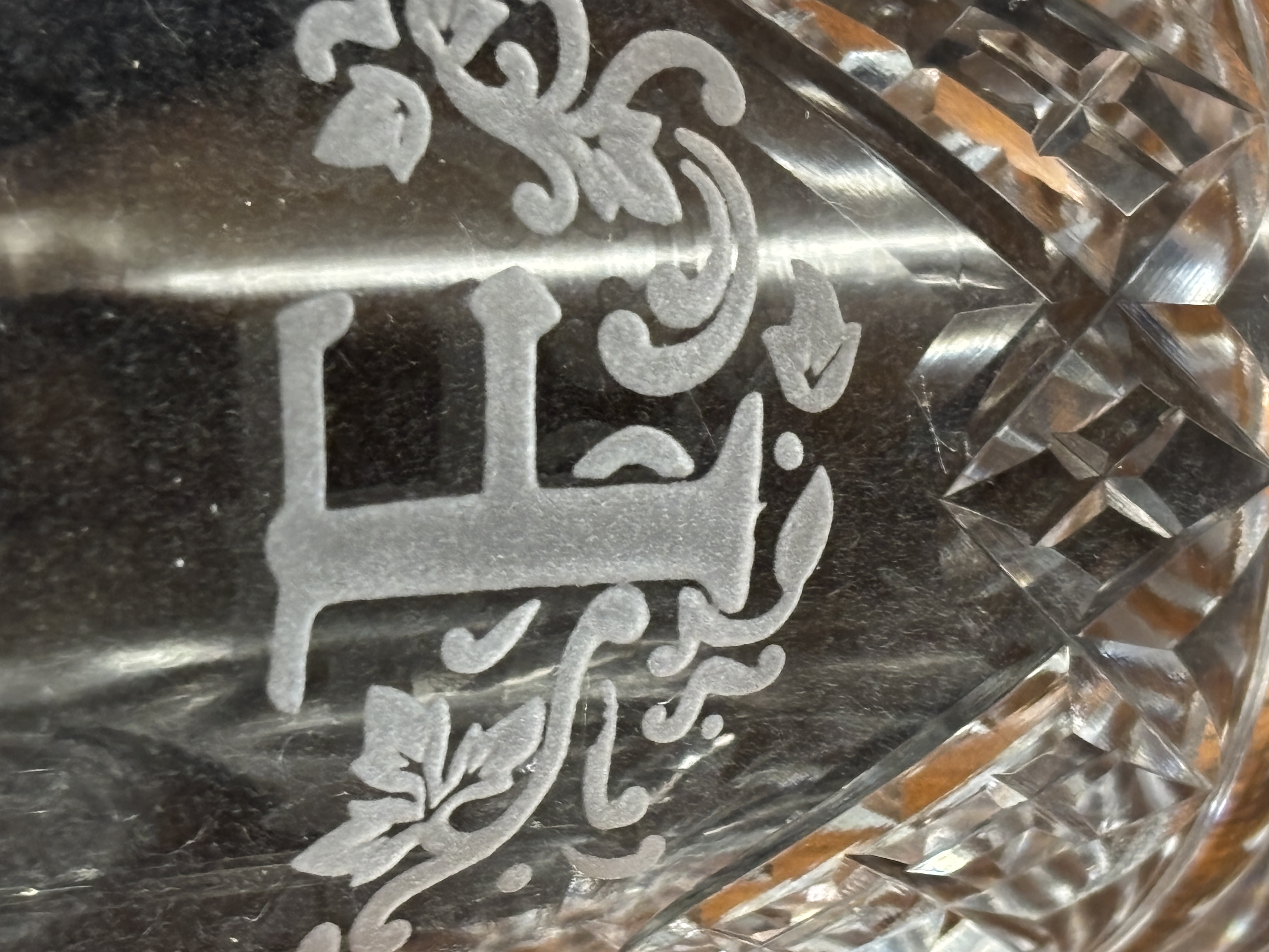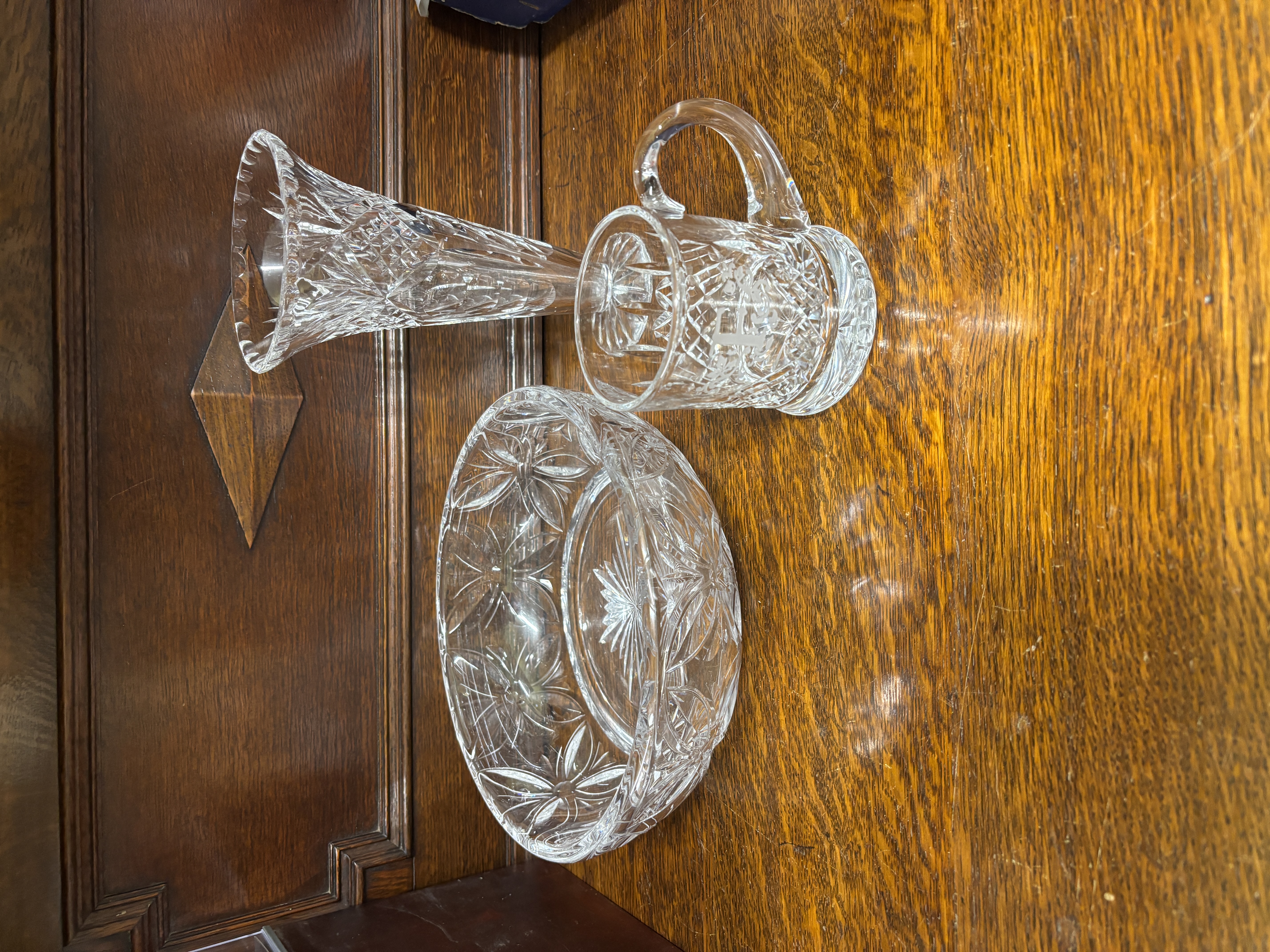 A glass fruit /trifle bowl, vase and tankard which has been etched with the initial F