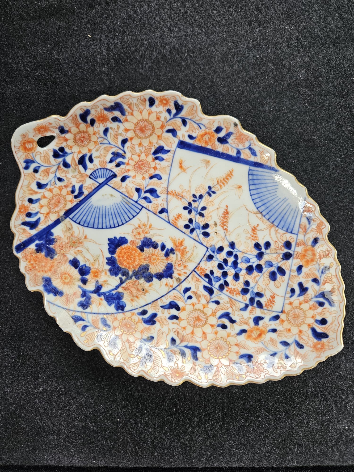 A traditional Japanese Imari leaf dish having fan decoration a/f