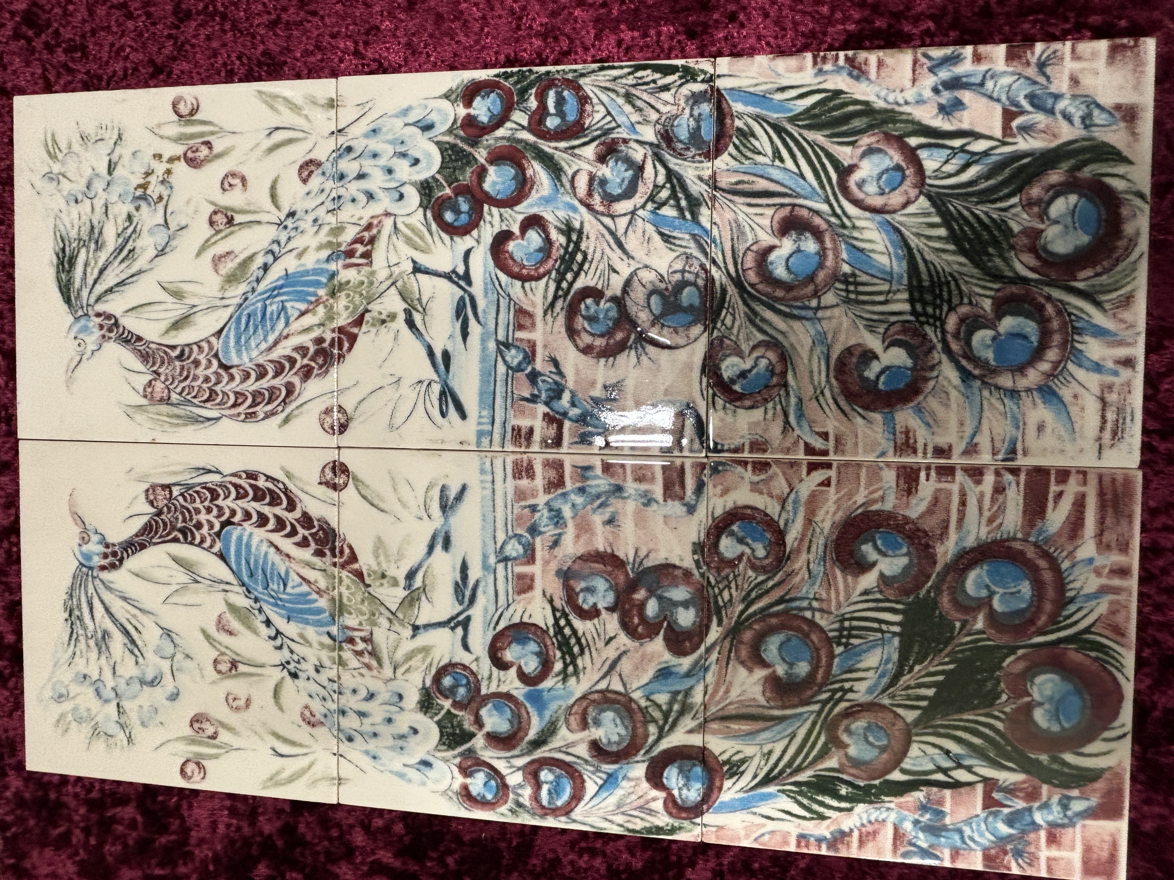 Six ceramic wall tiles which together form two peacocks facing each. Made in England. Measuring 46 cm x 31 cm