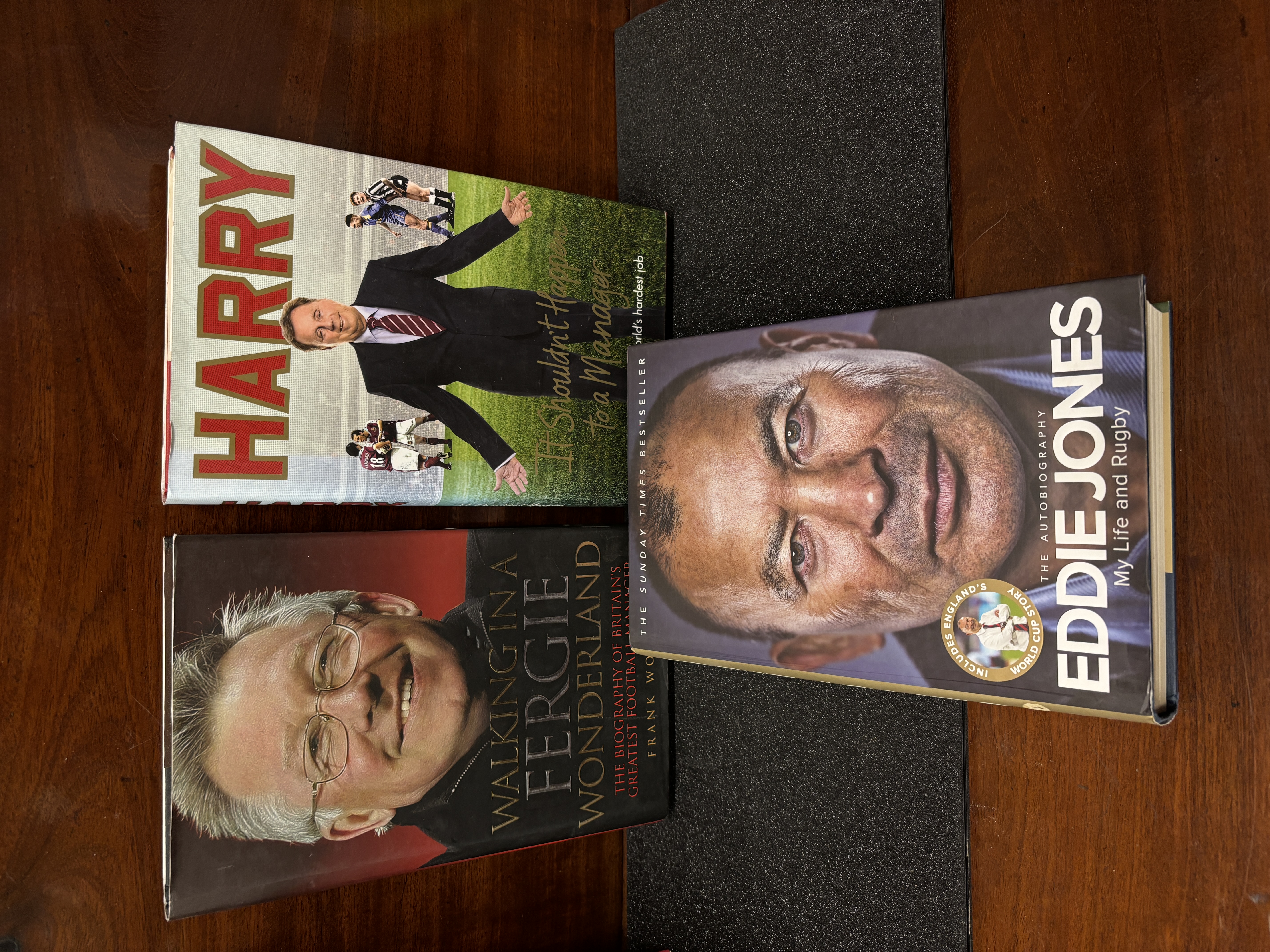 Three sport related autobiographies. Alex Ferguson, Harry Redknapp and Eddie Jones